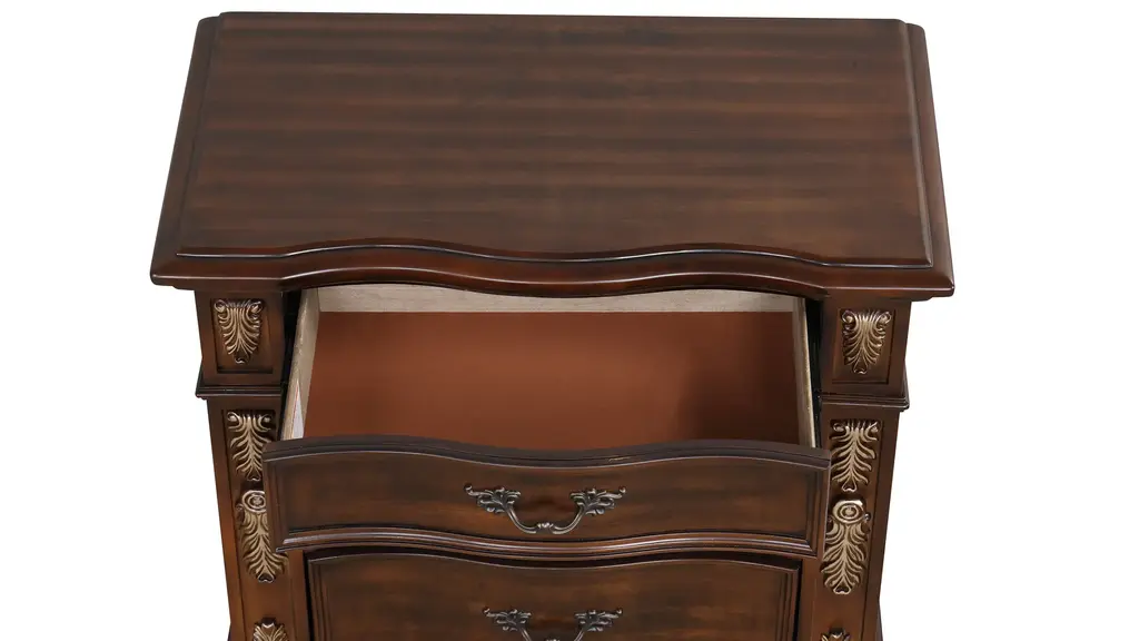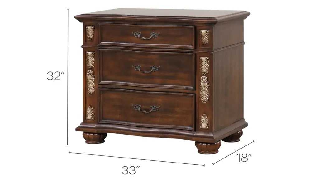 Add a touch of class to your bedroom with the Lyon Nightstand. This nightstand features real wood veneers that are layered on top of oversize cases. The drawer fronts feature deep grain wood panels surrounded by gold hand painted accents and smooth drawer operation with side mounted ball bearing drawers that include velvet lining on the top drawer.