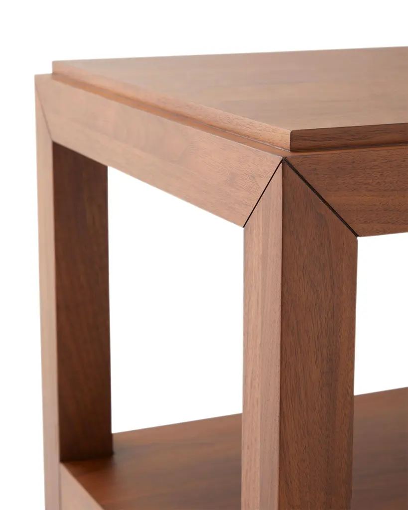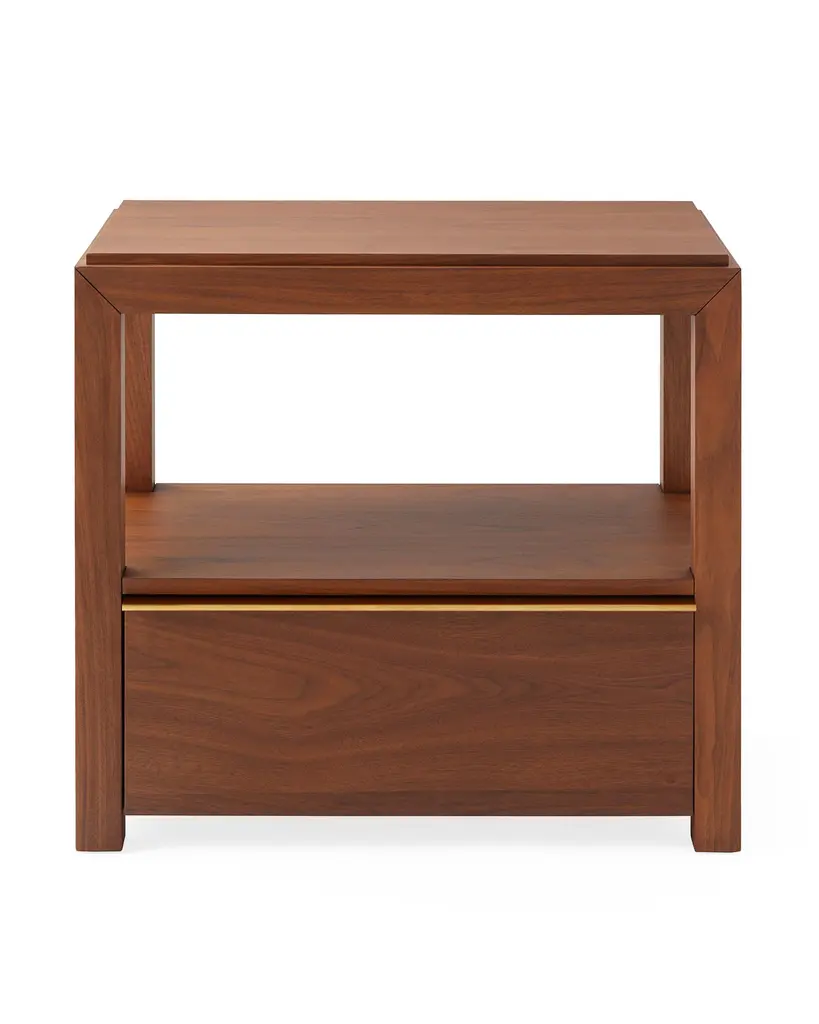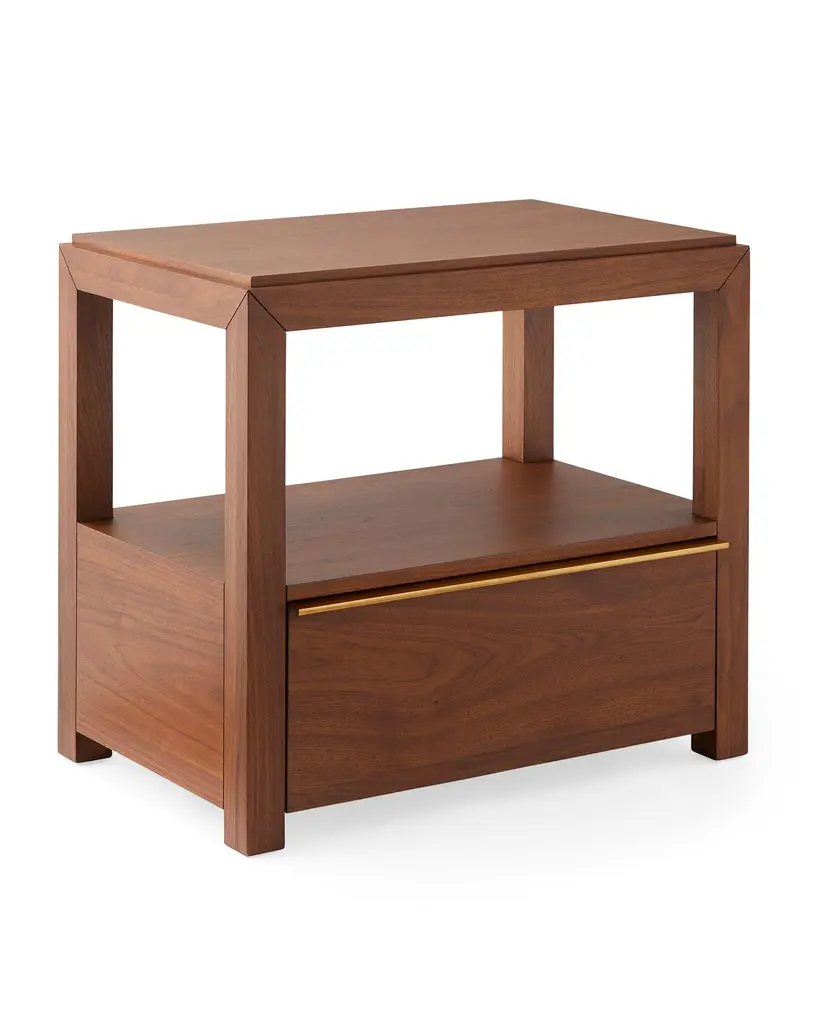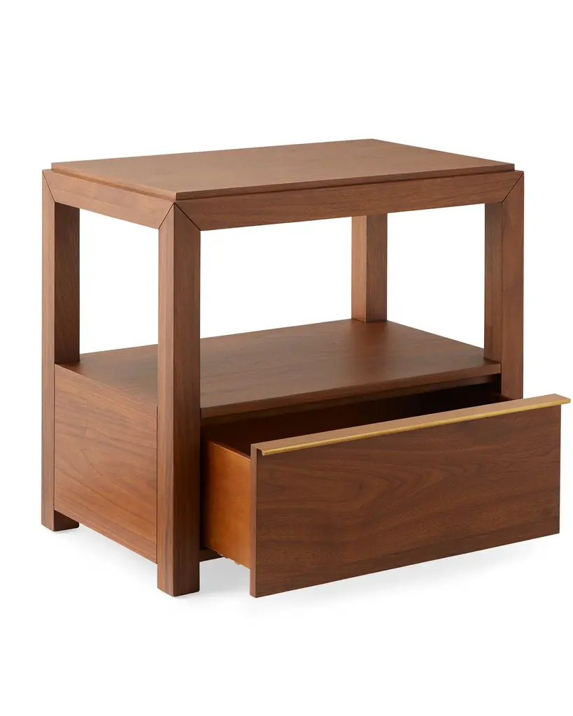 Beloved walnut — a furniture favorite. It boasts a rich, refined color, striking grain, and resilience. A spacious shelf for styling. A sleek brass handle adds shine.