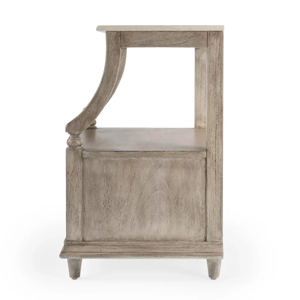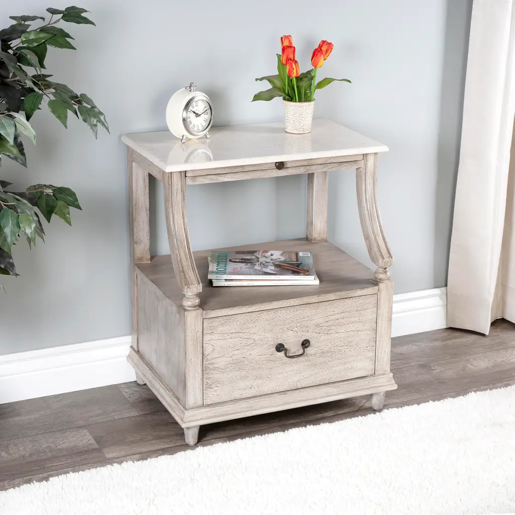 This charming nightstand is a near-perfect bedside companion – it stores nearly everything you want just within arm’s reach. It features a spacious display shelf to charge a phone or tablet, a pull-out tray to place that morning cup of coffee, and an oversized drawer to tuck away books and other essentials. It is available in white or gray finishes with antique sable finished brass hardware. Crafted from mahogany Wood solids, engineered Wood products, and mahogany veneer, it is exquisitely topped with white Melati marble for a sense of timeless elegance. Also suitable for use as a chairside table. Durably Constructed With: Marble, Mahogany Wood, MDF, Mahogany Veneer, Plywood Product Construction Features: Wood Slide,Finish Distressing Product Assembled Measurement & Weight: 28.25" H x 24.0" W x 18.0" D -- 64.0 lbs. 500 lbs. Suggested weight capacity Item Arrives: Assembled Marble is a natural stone product and is known for its variation in color, carbon deposits and veining patterns. Variations in shade and markings are normal and can be expected with the natural materials used in the construction of this product. Due to the porous nature of marble, it is vulnerable to staining agents and high heat. Avoid placing hot or wet items on surface. Coasters recommended Photo may slightly differ from actual item in terms of color/finish due to the lighting during photo shoot or the monitor's display.