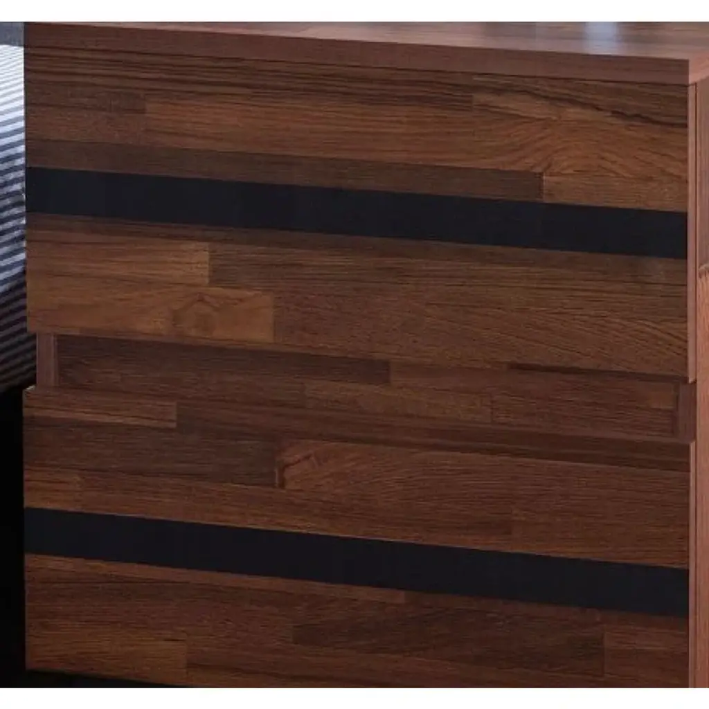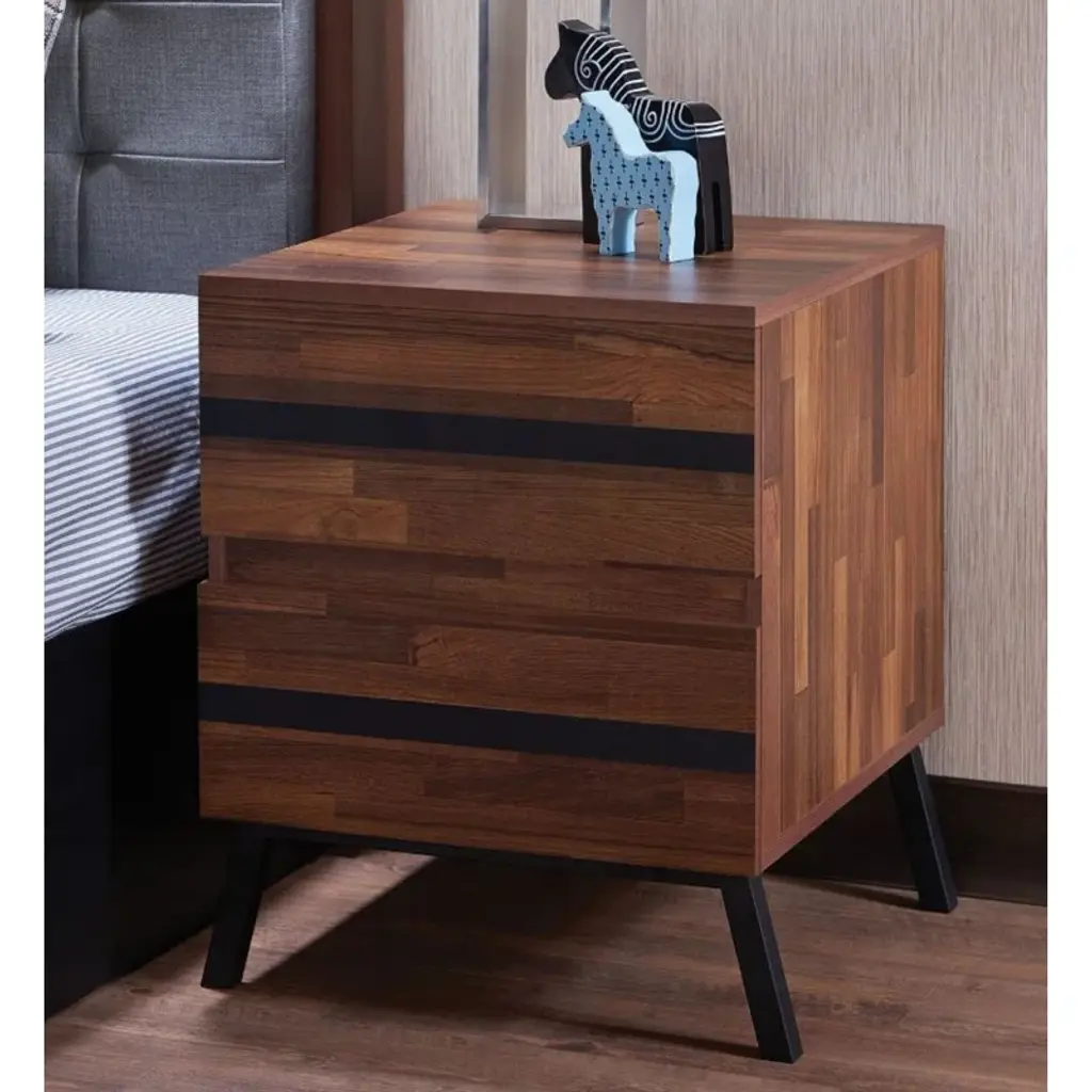 This 2-drawer nightstand showcases a clean-lined silhouette and mixed materials to give your bedroom a blend of modern and industrial styles. It rests on four angled metal legs in black, with the top part crafted from engineered wood in a rustic walnut tone. Variations in the wood grain add a lodge-worthy look. Both drawers feature a horizontal metal bar in front for a distinctive touch, and the interior gives you ample space to stow away personal items and bedtime necessities. At 20" wide, this bedside table looks great even next to your sofa or an armchair in your living room.