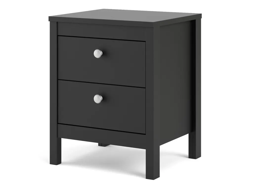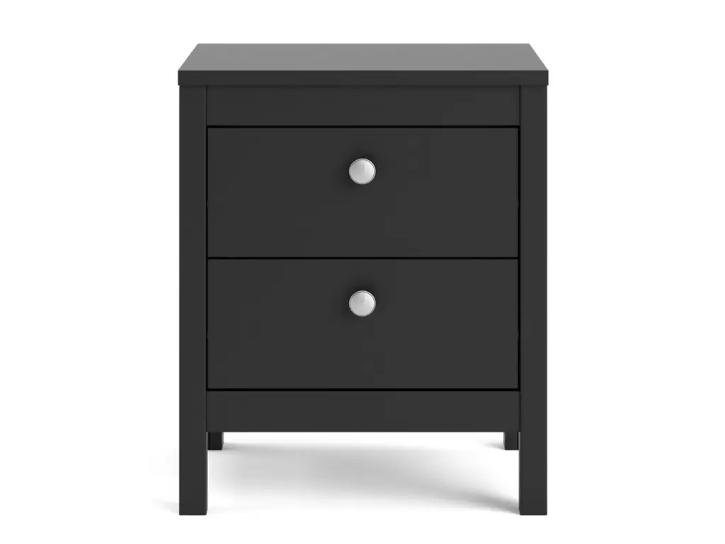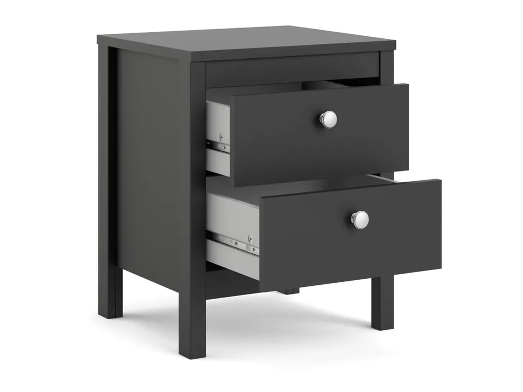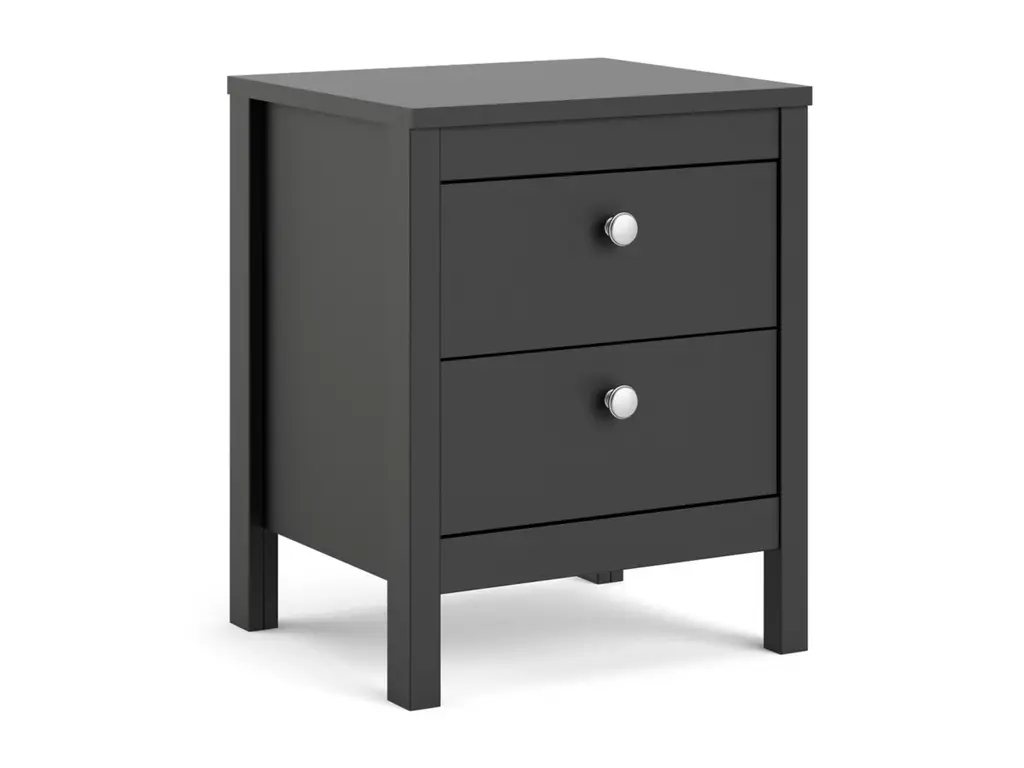 Enhance your bedroom or small space with the Madrid 2 Drawer Nightstand. It features a unique modern traditional design that’s ideal for bedside storage. The two drawers are backed with metal drawer glides and comes with two types of handles grey knobs and brown leather handles to customize the look. The Madrid Nightstand has a durable foil surface that is easy to clean. Combine with other pieces from the Madrid collection to complete your living space.