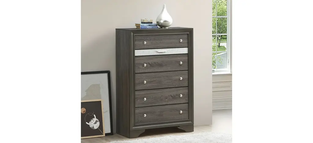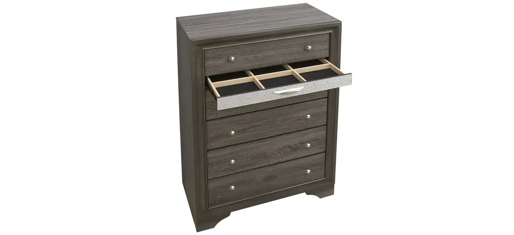 Madrid Chest Featuring a Finish that Looks and Feels like Wood. Felt Lined Accessory Drawer is included on the Dresser, Chest, and Nightstand for Jewelry and other Small Items.