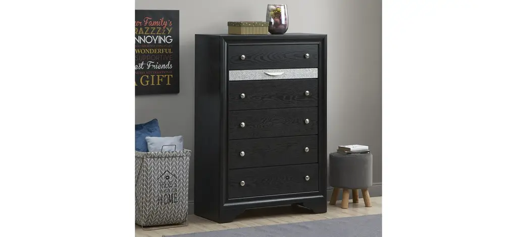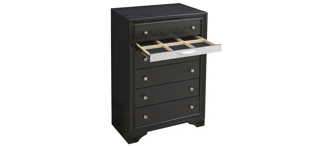 Madrid Chest Featuring a Finish that Looks and Feels like Wood. Felt Lined Accessory Drawer is included on the Dresser, Chest, and Nightstand for Jewelry and other Small Items.