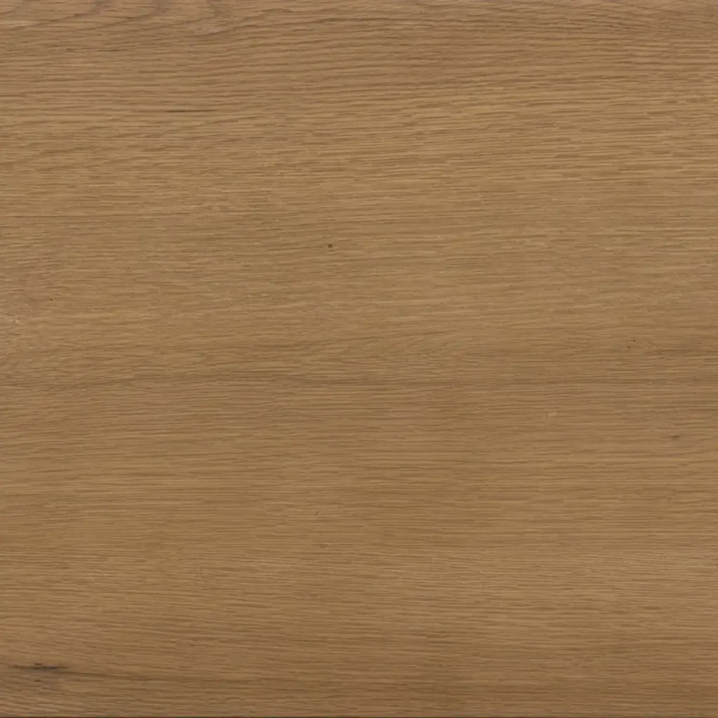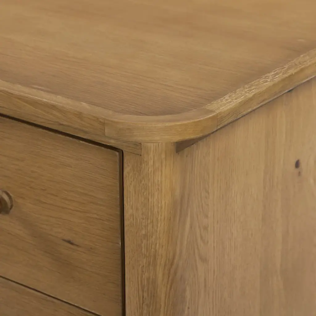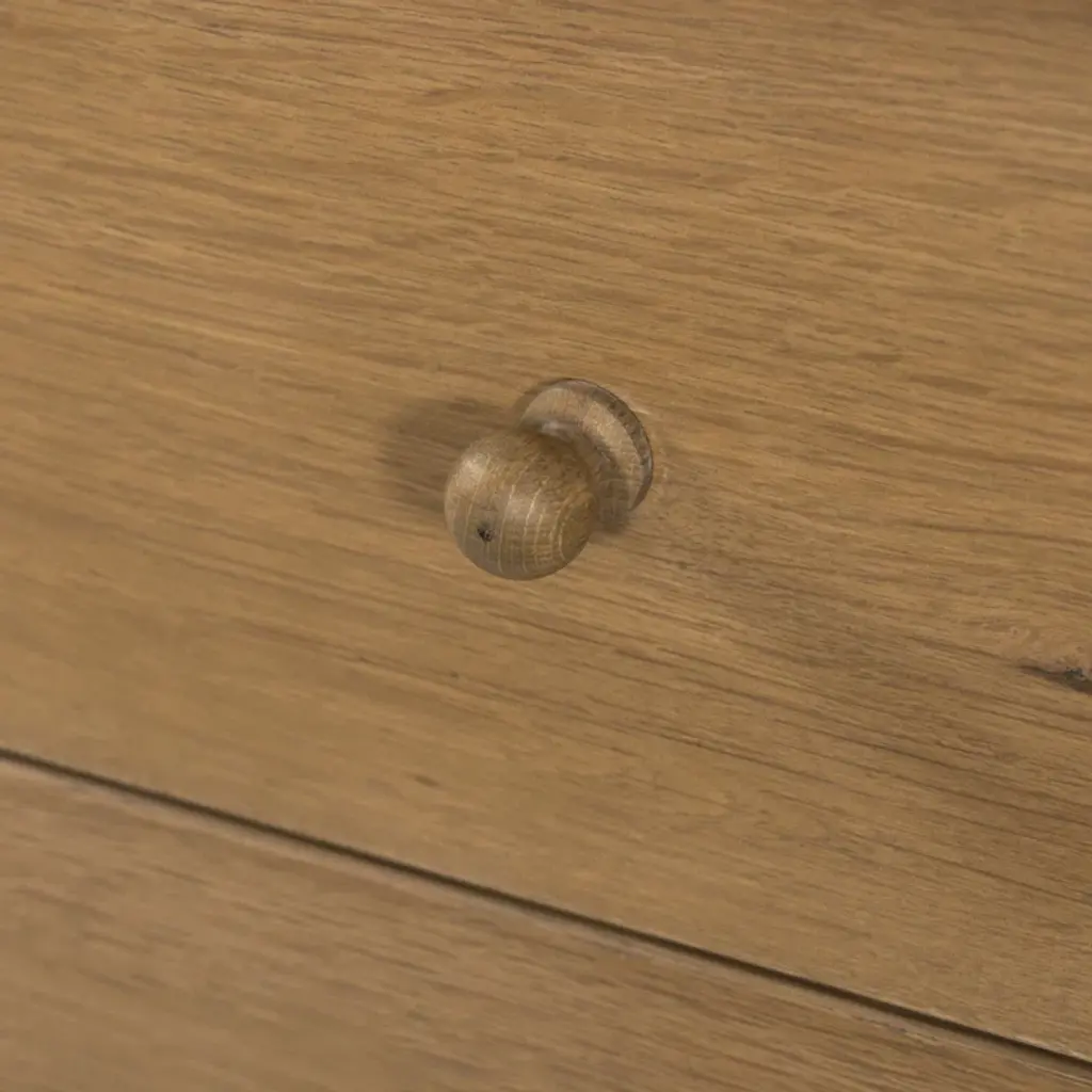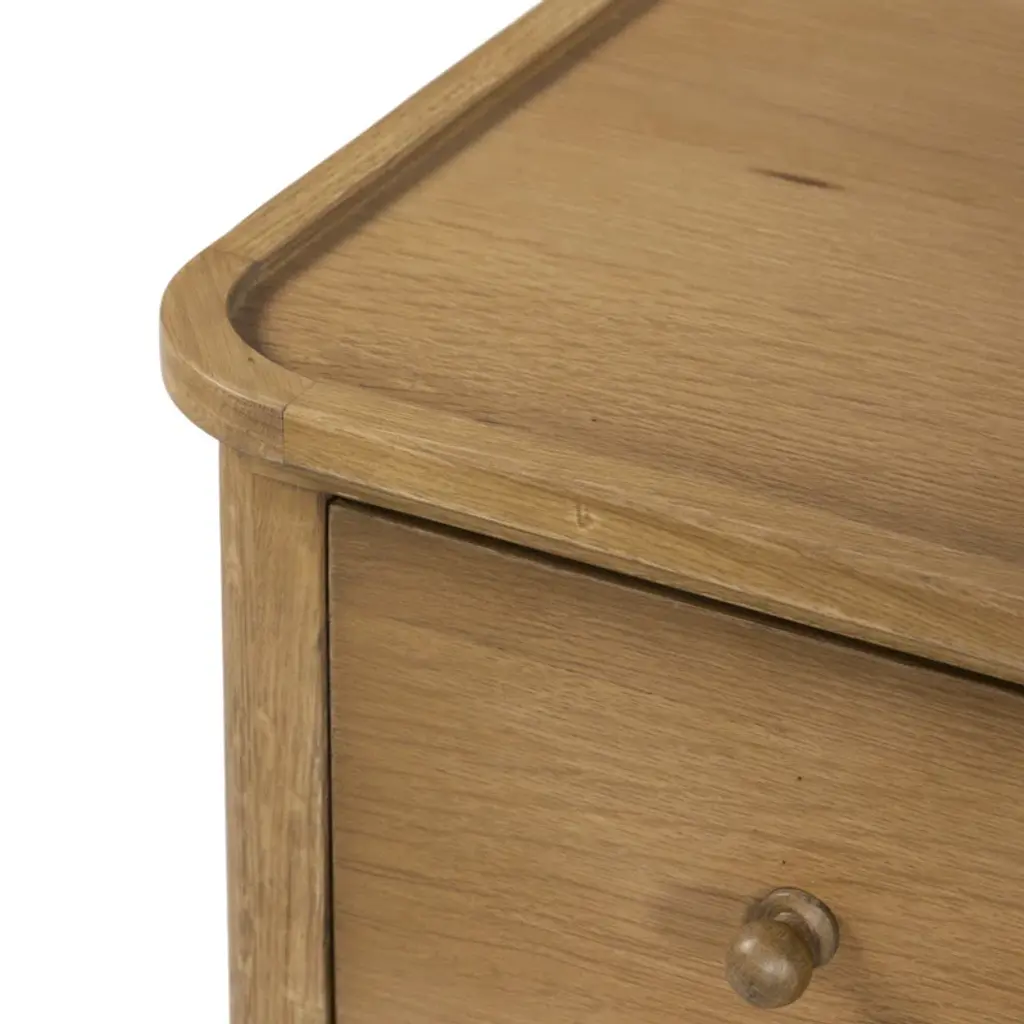 Clean and compact, a two-drawer nightstand is crafted from smoked black oak, showcasing the natural grain of wood. Its scaled-down profile fits perfectly beside the bed. Slim, tapered legs add a touch of lightness.