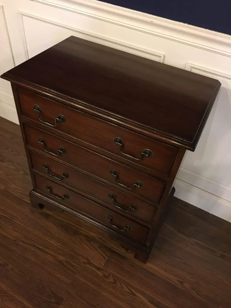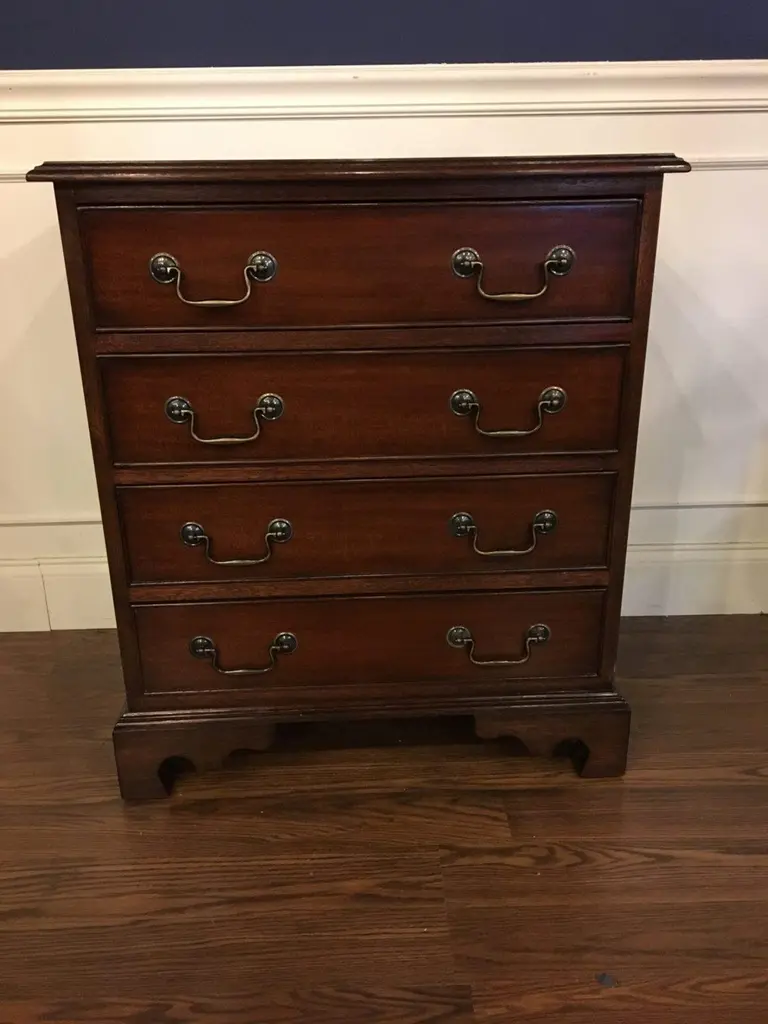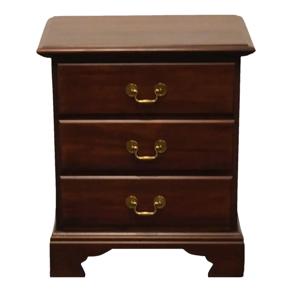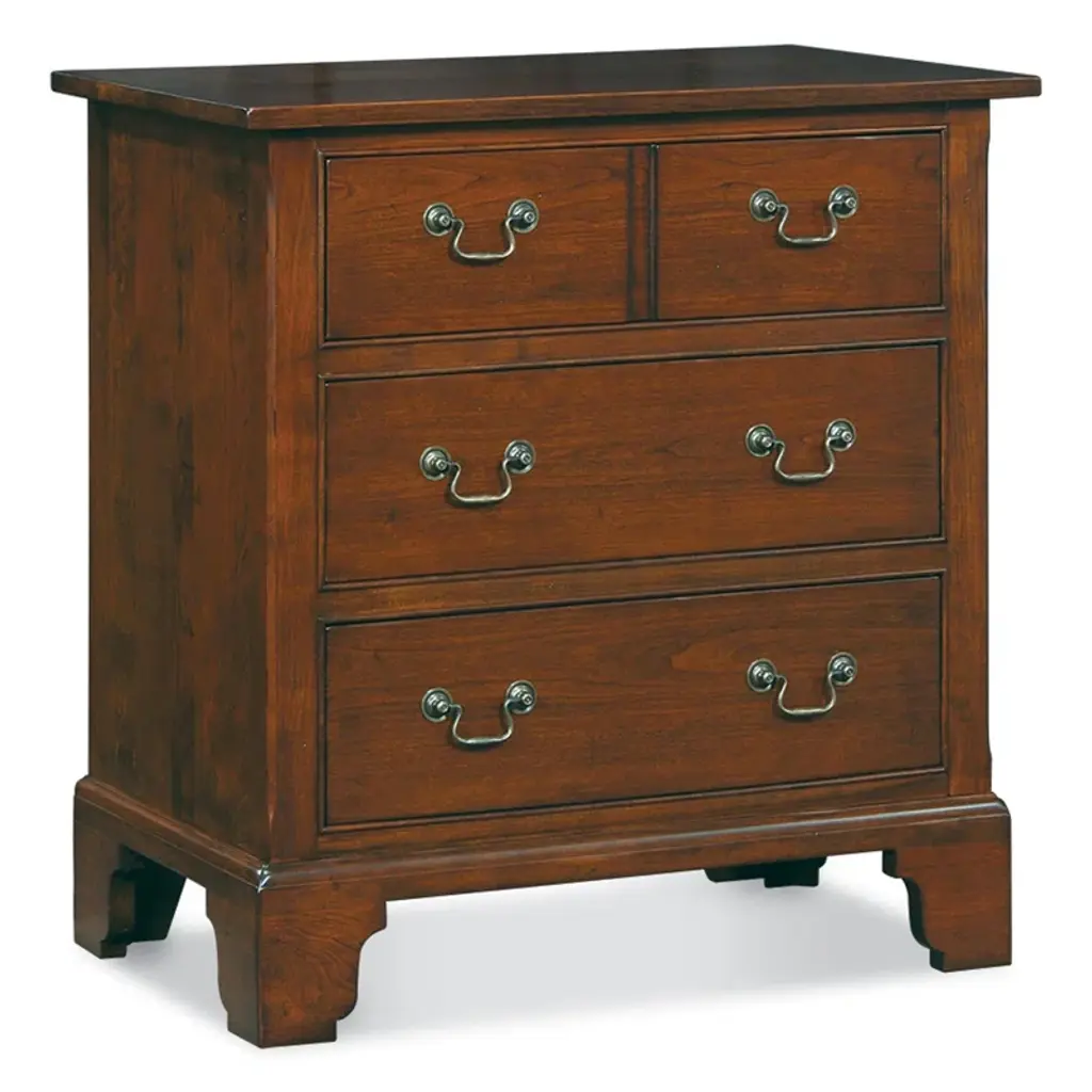 This is a new traditional mahogany nightstand. Its design was inspired by New England nightstands in the 1800s. It features four drawers and straight grain mahogany drawer fronts, top and sides with a Classic solid mahogany ogee edge. The drawers feature Classic dovetail joinery. This nightstand has hardware finished in antique brass. It has a satin finish. Additional nightstands are available (for those who need a pair of nightstands).This nightstand goes extremely well with our rice carved poster bed (LH-4578) and pencil post bed (LH-4678).Dimensions: Width 26 in., depth 16 in., height 30 in.This chest can be purchased as shown in its standard dimensions or it can be specially made to your desired specifications. Other optional features include finishes and hardware. Options may affect the price and production time.