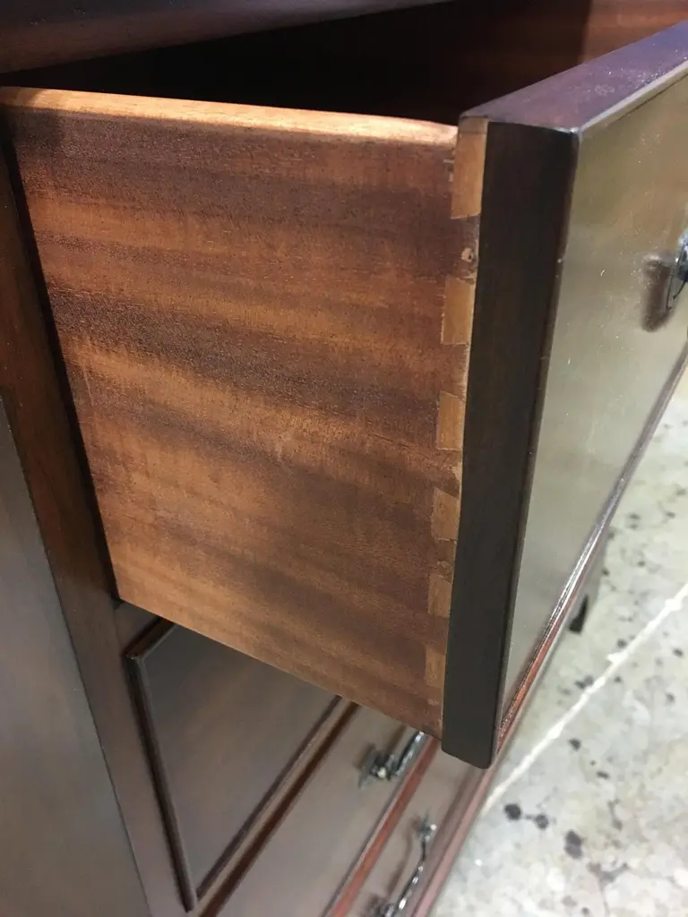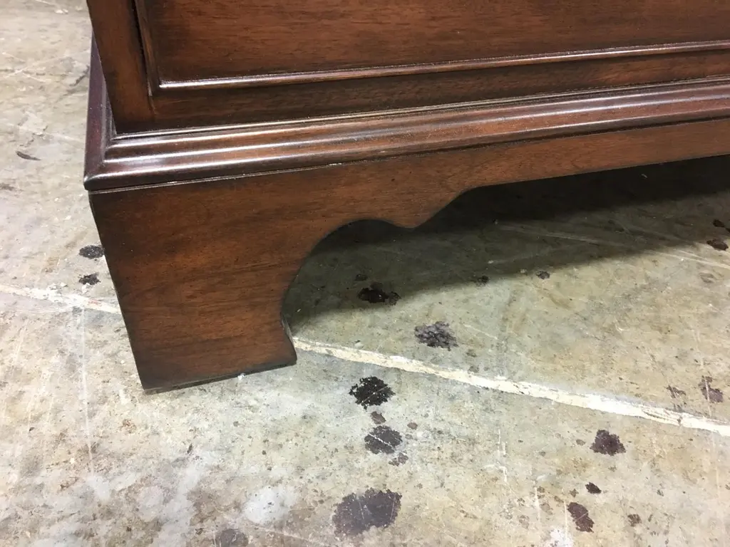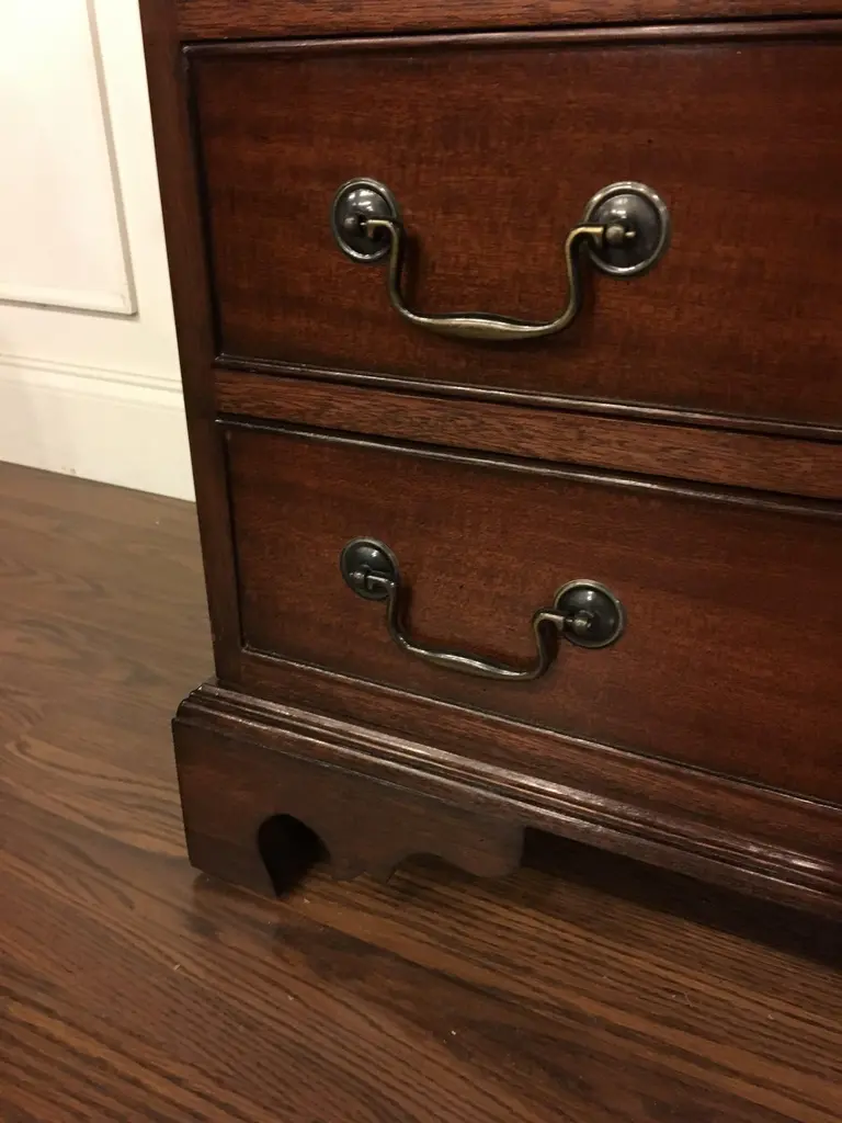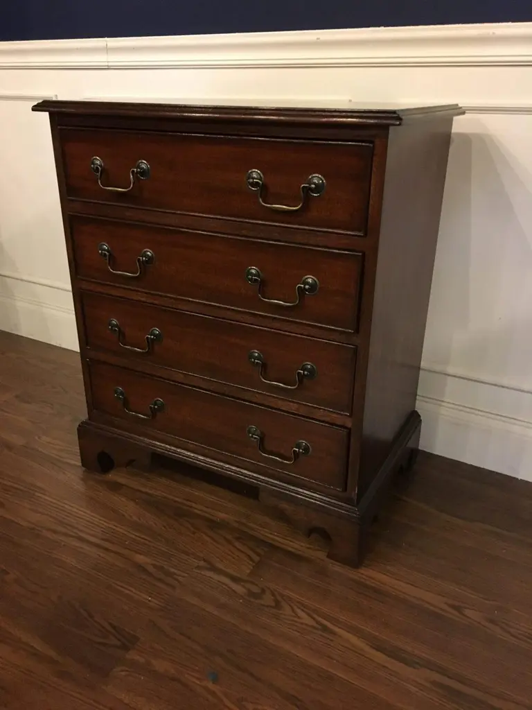 This is a new traditional mahogany nightstand. Its design was inspired by New England nightstands in the 1800s. It features four drawers and straight grain mahogany drawer fronts, top and sides with a Classic solid mahogany ogee edge. The drawers feature Classic dovetail joinery. This nightstand has hardware finished in antique brass. It has a satin finish. Additional nightstands are available (for those who need a pair of nightstands).This nightstand goes extremely well with our rice carved poster bed (LH-4578) and pencil post bed (LH-4678).Dimensions: Width 26 in., depth 16 in., height 30 in.This chest can be purchased as shown in its standard dimensions or it can be specially made to your desired specifications. Other optional features include finishes and hardware. Options may affect the price and production time.