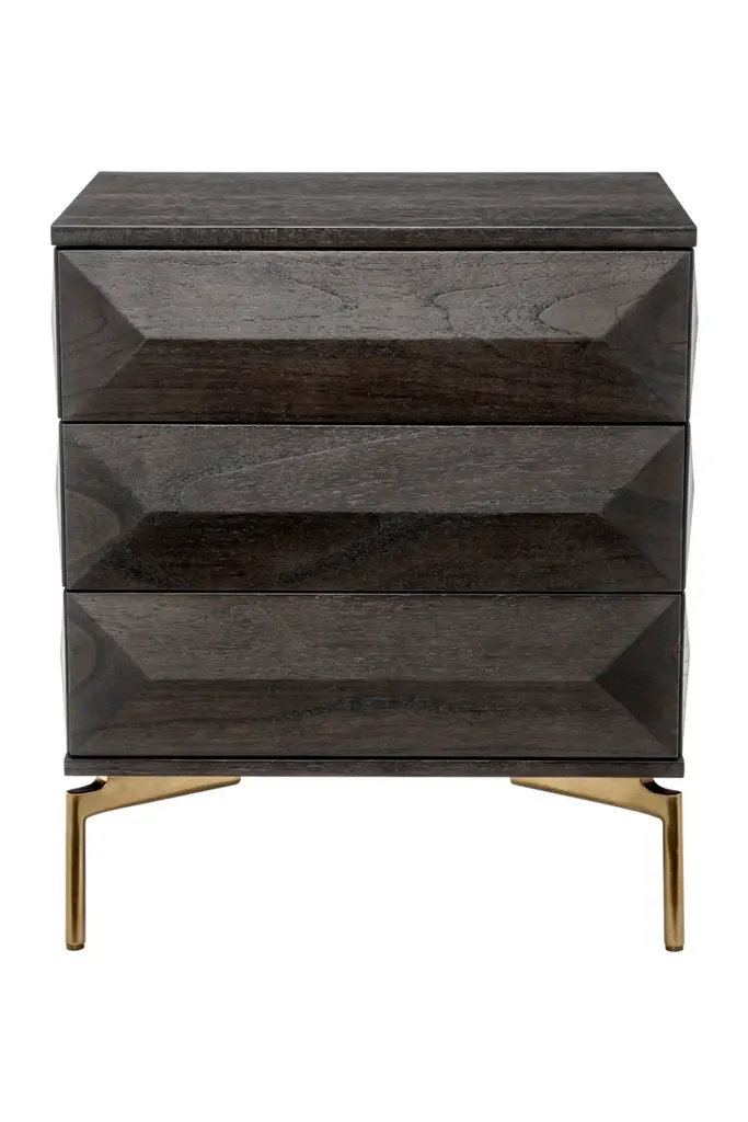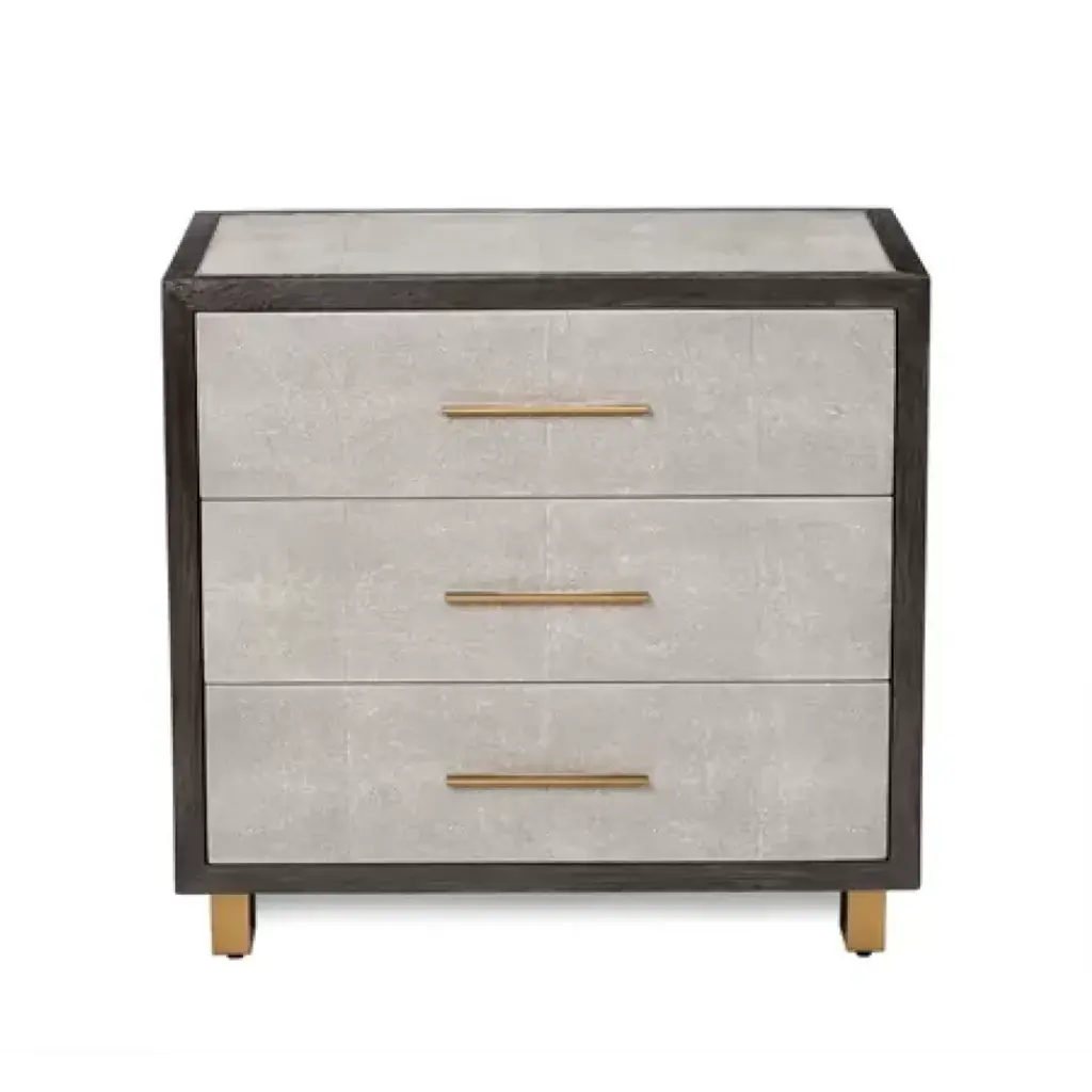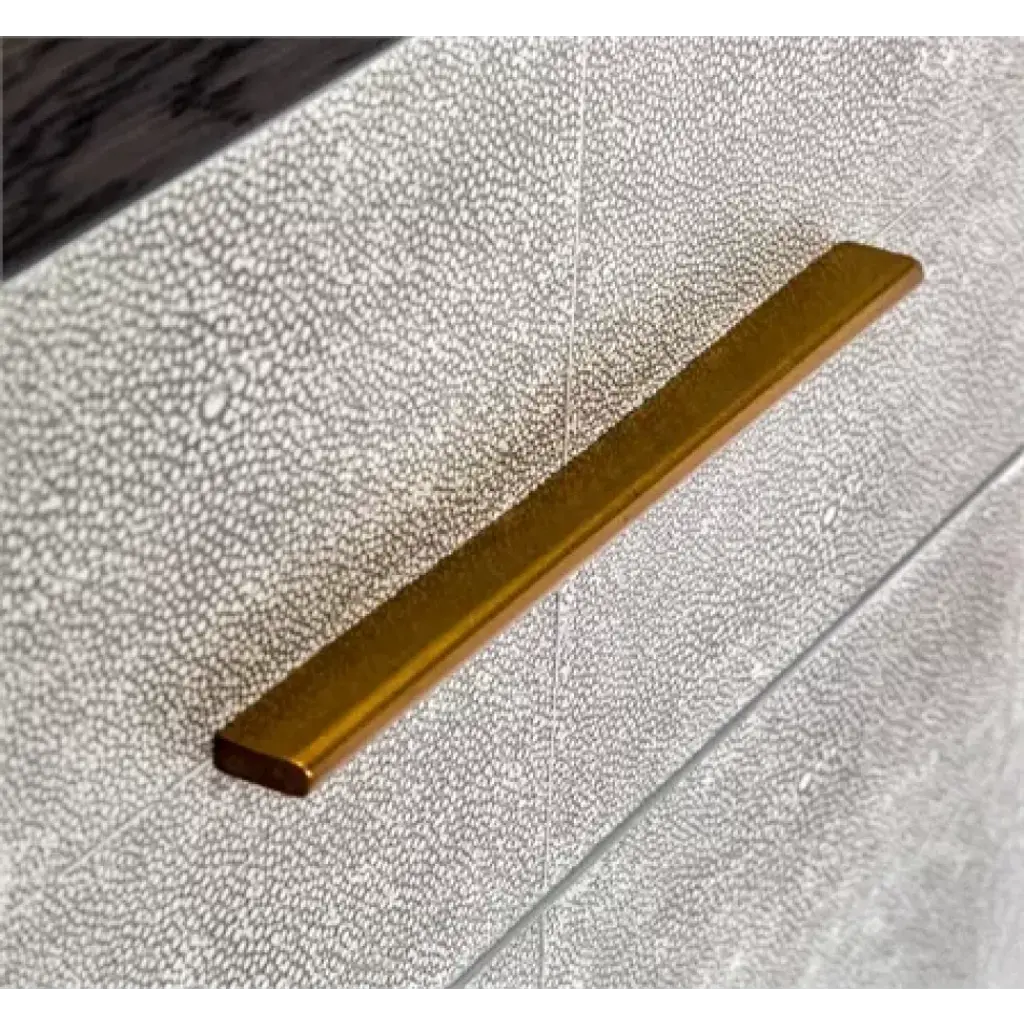 The clean lines of the Maia Bedside Chest are transformed into a statement piece thanks to the hand cast shagreen, vintage grey wood trim and antique brass detailing.