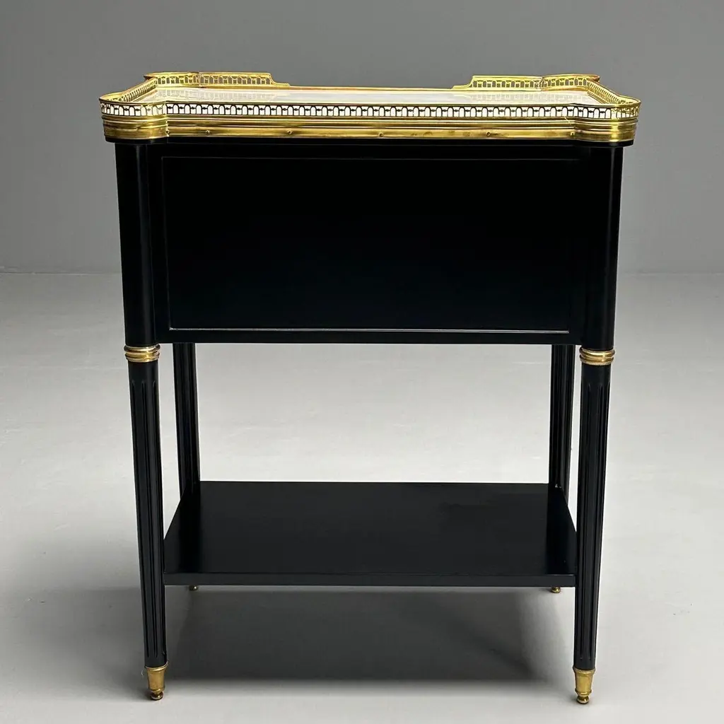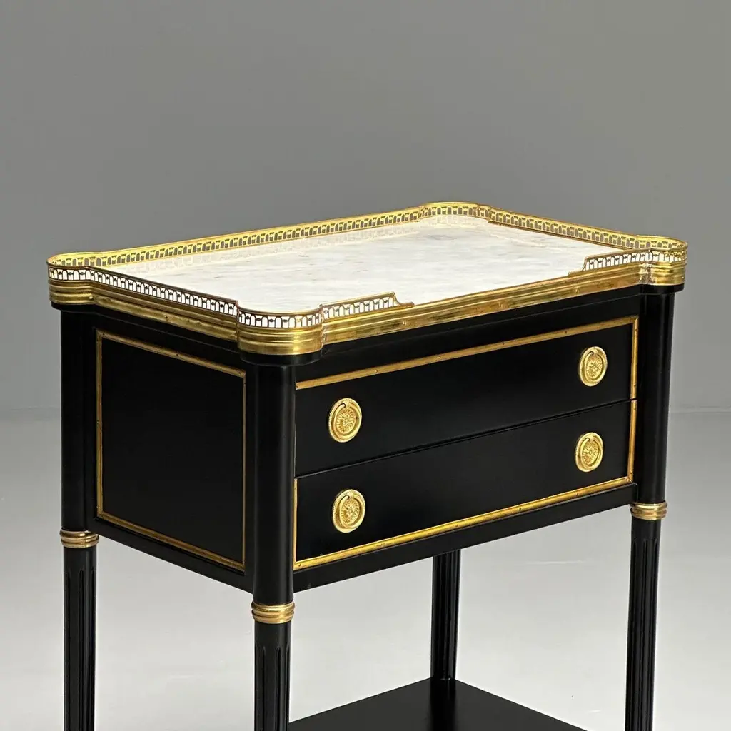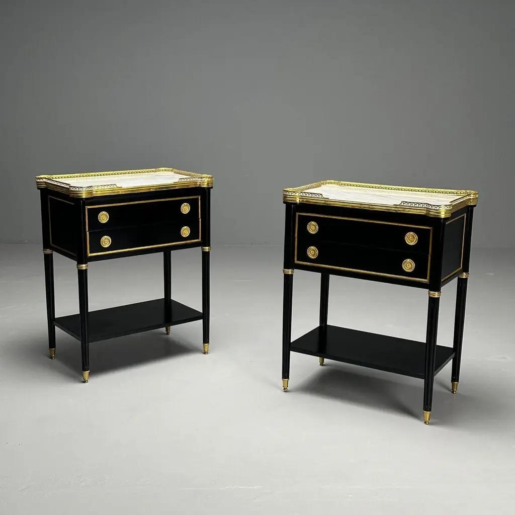 Maison Jansen Style, Louis XVI Style, Hollywood Regency, Brass, Marble, Ebonized NightstandsThis pair of ebony painted neoclassical nightstands or end tables, in the manner of Maison Jansen, feature white and gray veined marble tops with rounded corners, set within a pierced bronze gallery. Supported by Louis XVI-style tapering legs with bronze sabots and capitals, each table includes two pull out drawers with round brass pulls. Recently refinished, they are in excellent condition, ready to complement any home or office with their refined style and craftsmanship.Wood, Brass, Marble; France, 1980sHeight: 347.75 inches, Width: 28 inches, Depth: 17.5 inchesILha
