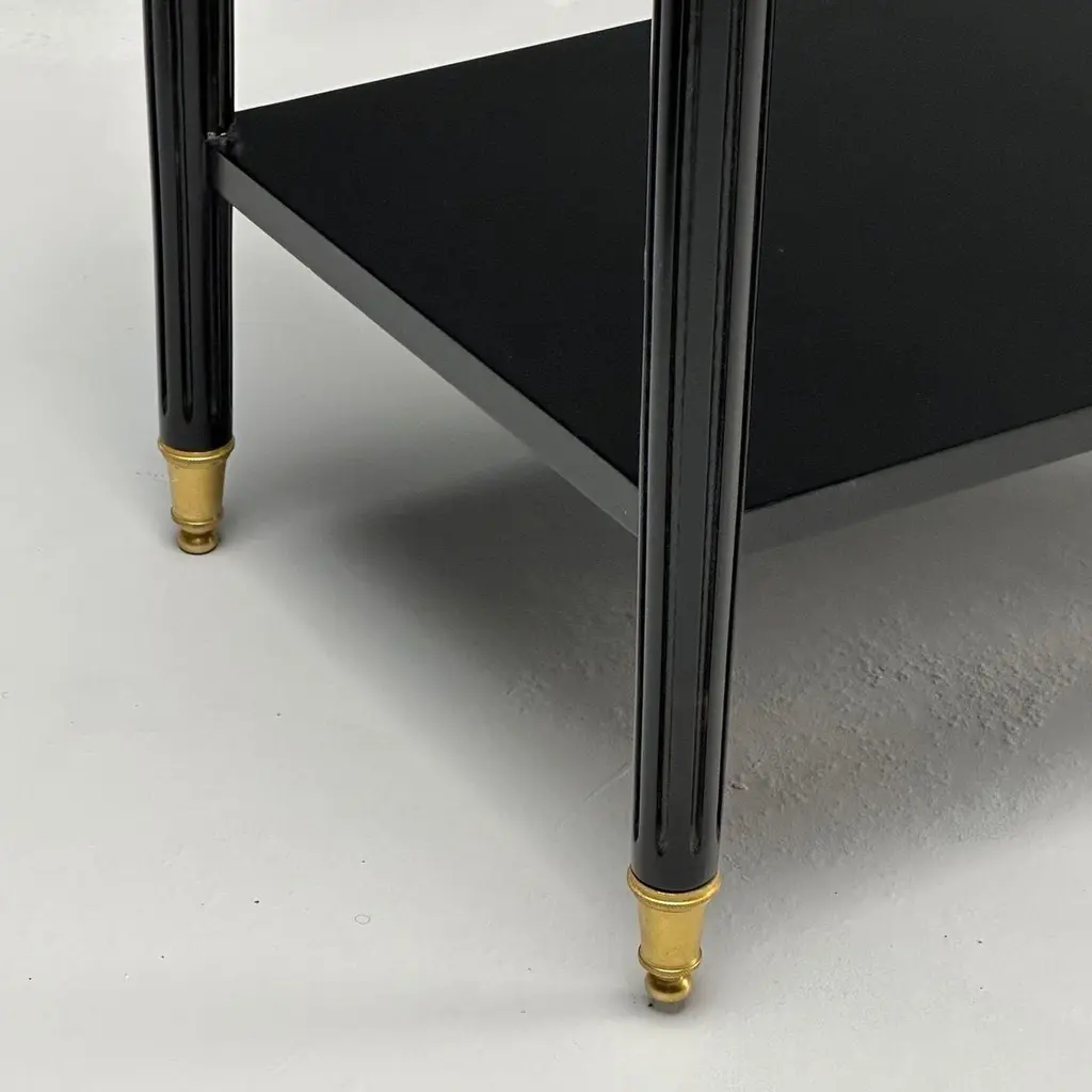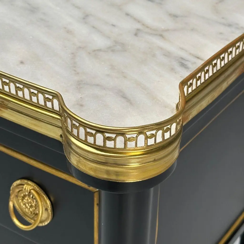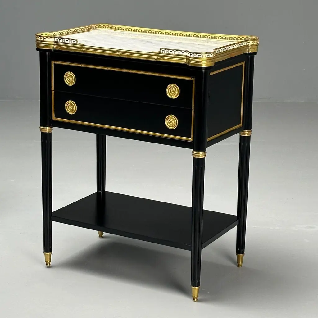 Maison Jansen Style, Louis XVI Style, Hollywood Regency, Brass, Marble, Ebonized NightstandsThis pair of ebony painted neoclassical nightstands or end tables, in the manner of Maison Jansen, feature white and gray veined marble tops with rounded corners, set within a pierced bronze gallery. Supported by Louis XVI-style tapering legs with bronze sabots and capitals, each table includes two pull out drawers with round brass pulls. Recently refinished, they are in excellent condition, ready to complement any home or office with their refined style and craftsmanship.Wood, Brass, Marble; France, 1980sHeight: 347.75 inches, Width: 28 inches, Depth: 17.5 inchesILha
