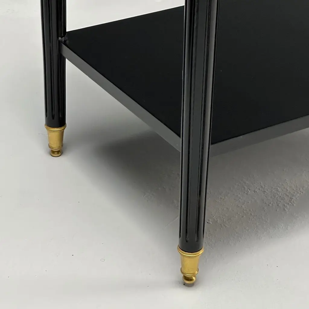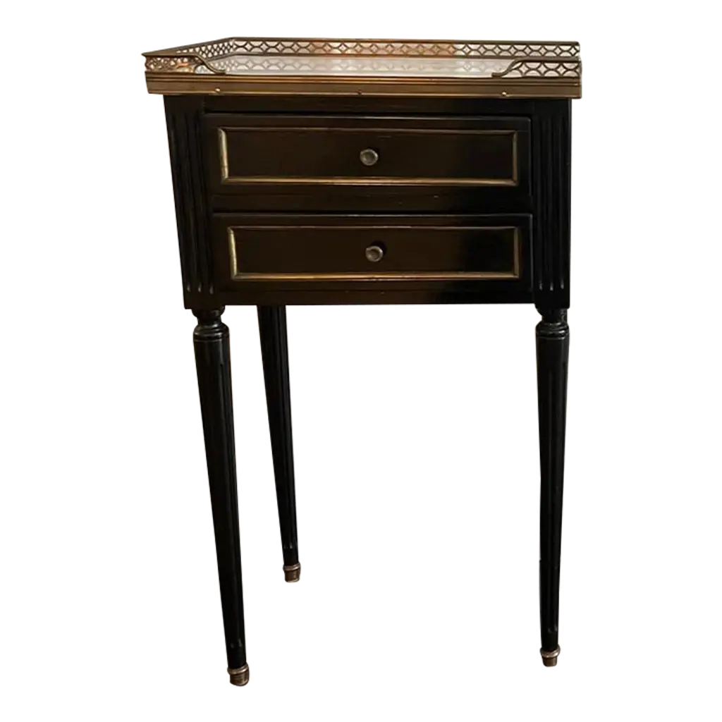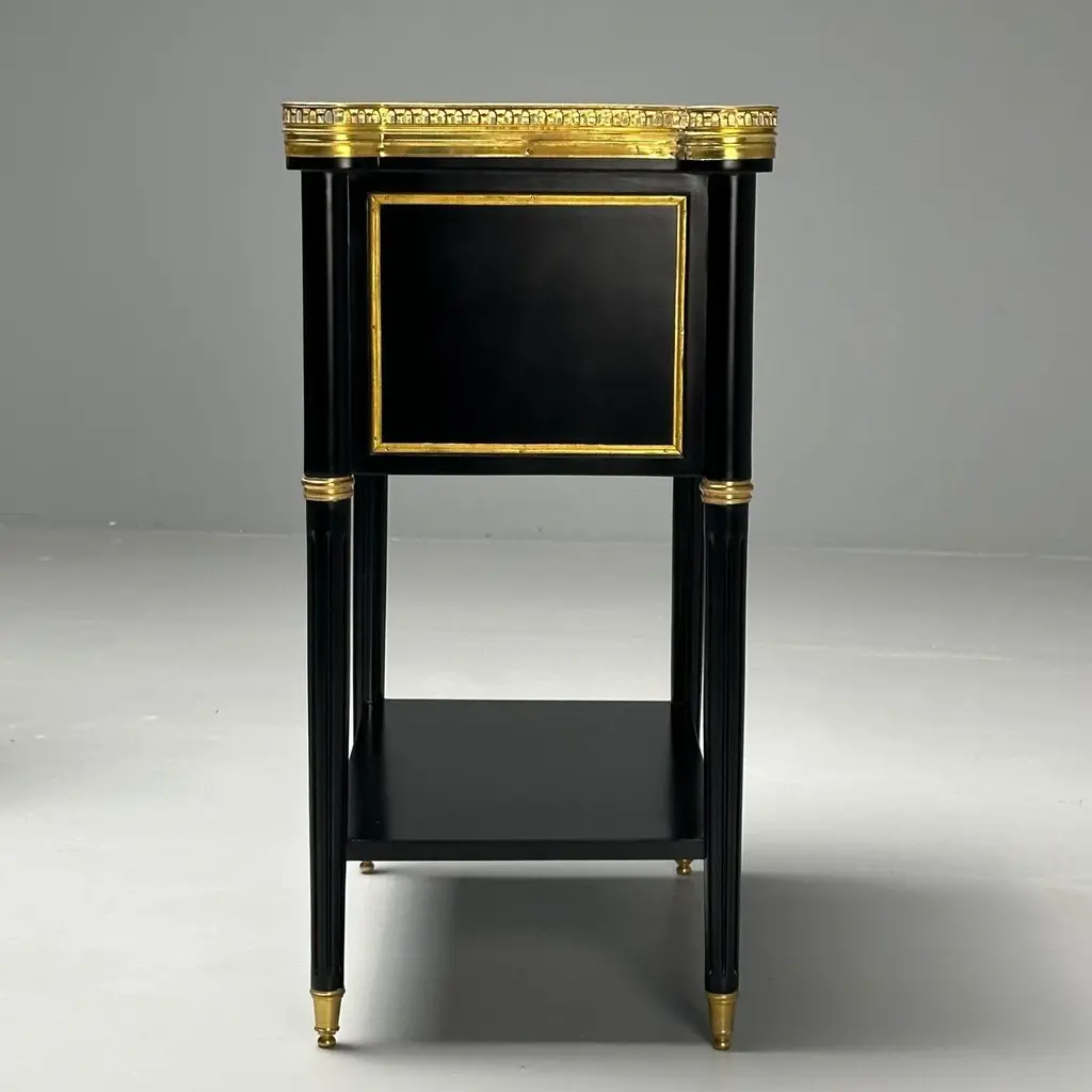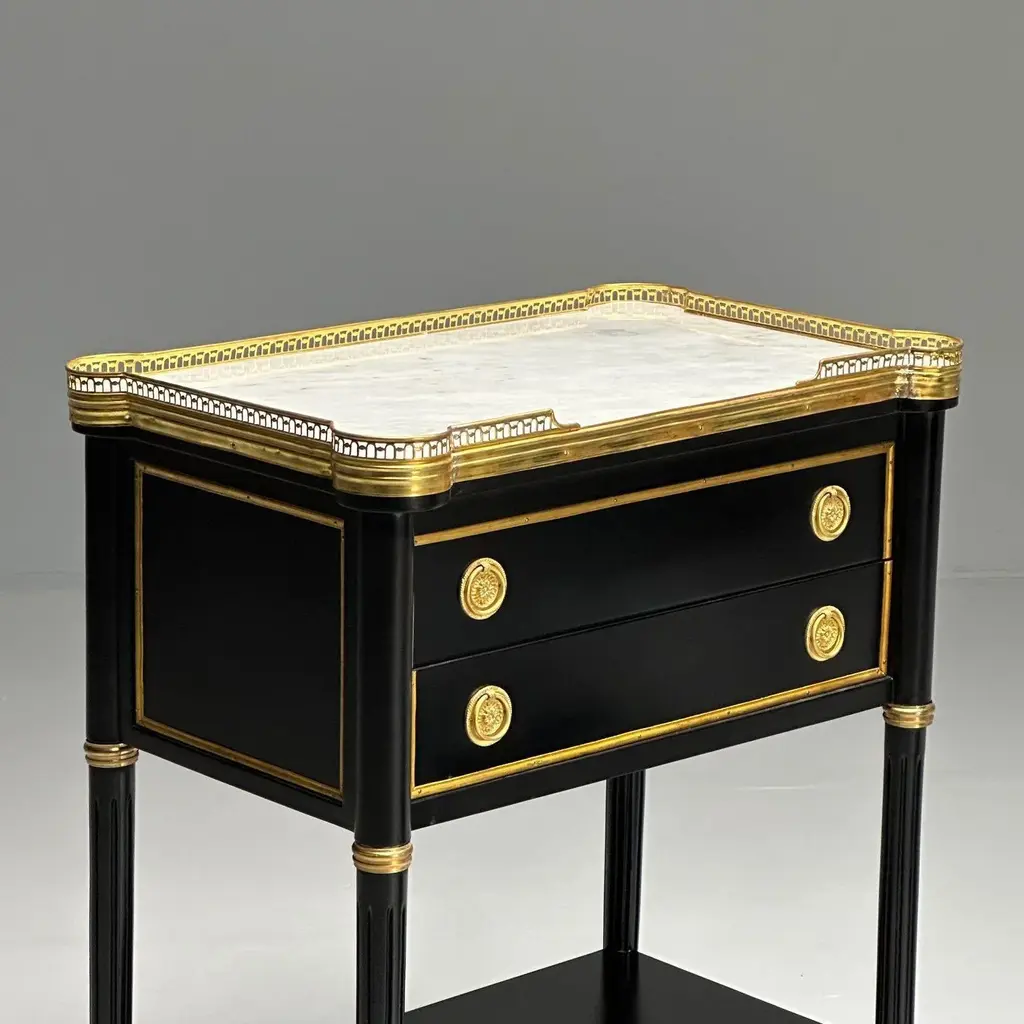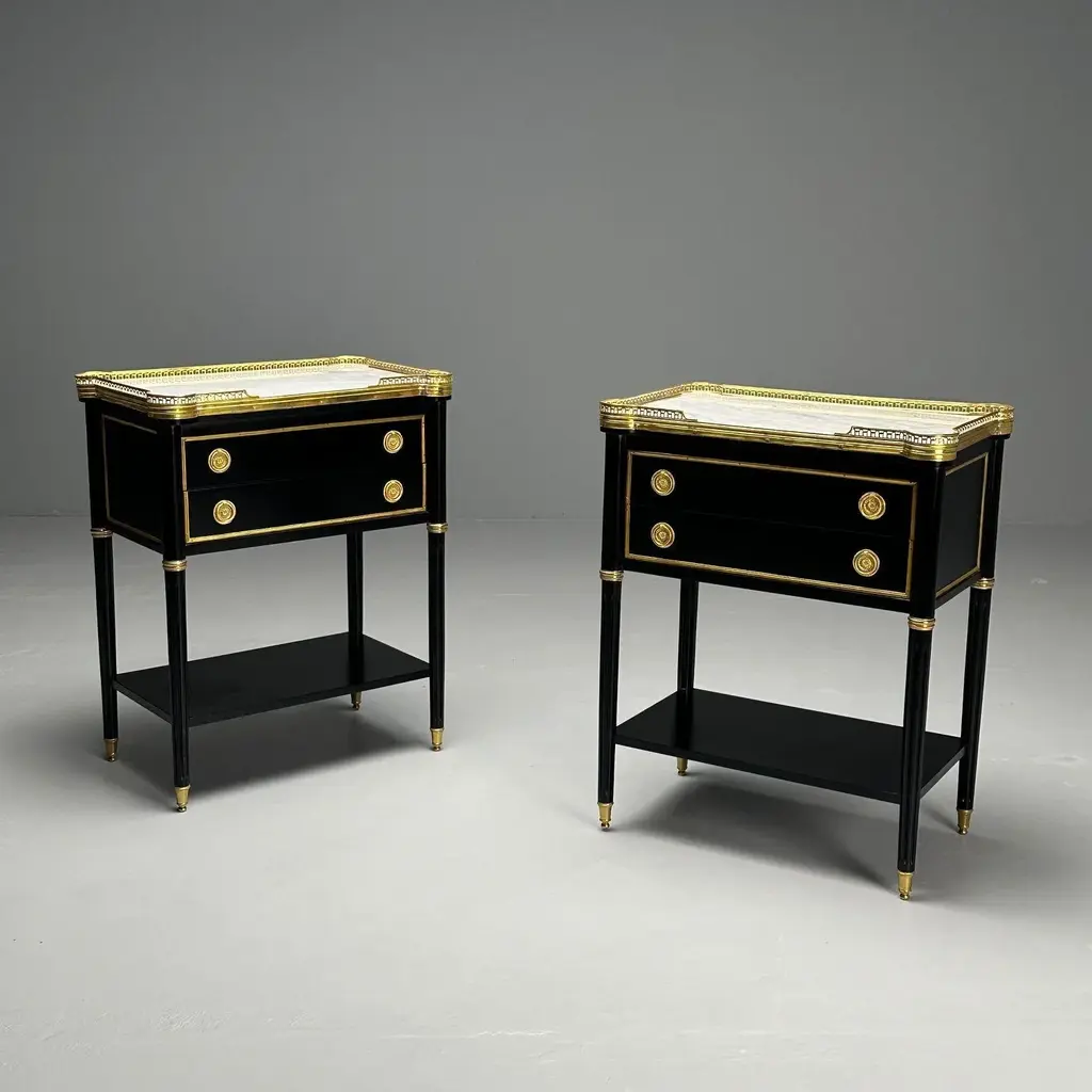 Maison Jansen Style, Louis XVI Style, Hollywood Regency, Brass, Marble, Ebonized Nightstands This pair of ebony painted neoclassical nightstands or end tables, in the manner of Maison Jansen, feature white and gray veined marble tops with rounded corners, set within a pierced bronze gallery. Supported by Louis XVI-style tapering legs with bronze sabots and capitals, each table includes two pull out drawers with round brass pulls. Recently refinished, they are in excellent condition, ready to complement any home or office with their refined style and craftsmanship. Wood, Brass, Marble; France, 1980s Height: 347.75 inches, Width: 28 inches, Depth: 17.5 inches ILha