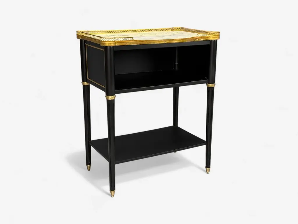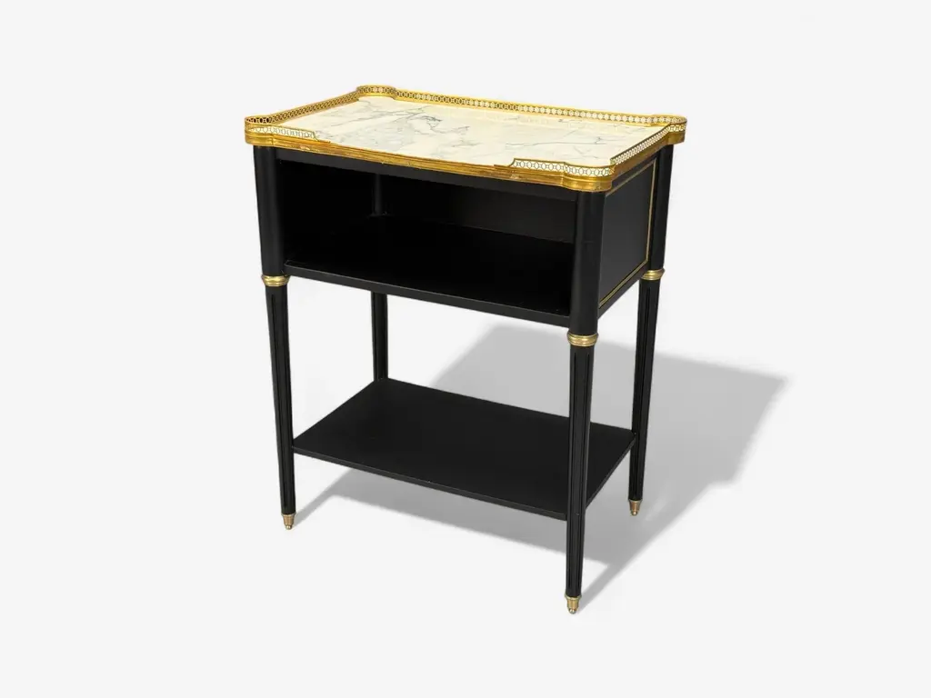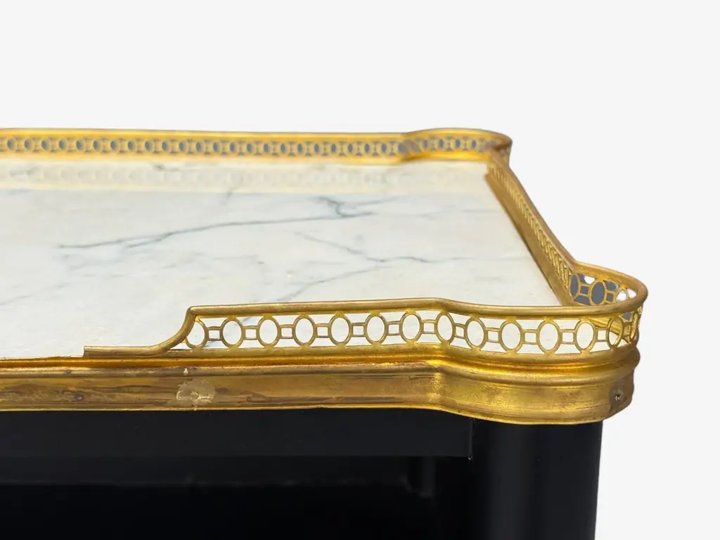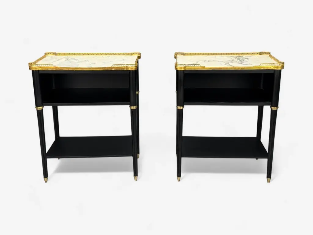 Maison Jansen Style, Louis XVI Style, Hollywood Regency, Brass, Marble, Ebonized Open Nightstands, 20th c. Pair of ebony neoclassical open nightstands or end tables in the manner of Maison Jansen. These finely crafted open end tables are simply stunning. The white and gray veined marble tops have rounded corners and sit inside a pierced bronze raised gallery. Supported by sleek tapering Louis XVI style legs having bronze sabots and capitals with a lower shelf passing to a large open center with rounded corners. The pair having recently been refinished are ready to sit prized in any room in the home or office. Bronze, Carrara Marble, Painted Wood; France, 1980s Height: 28 inches, Width: 34 inches, Depth: 18 inches