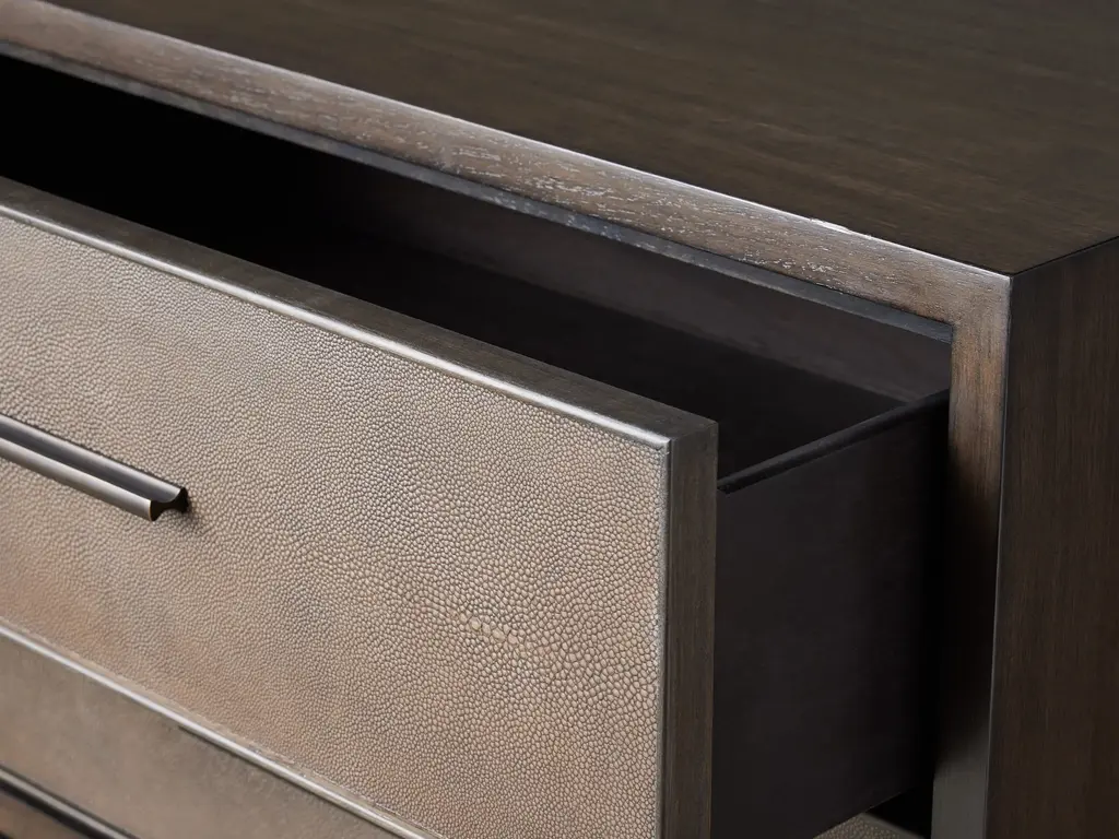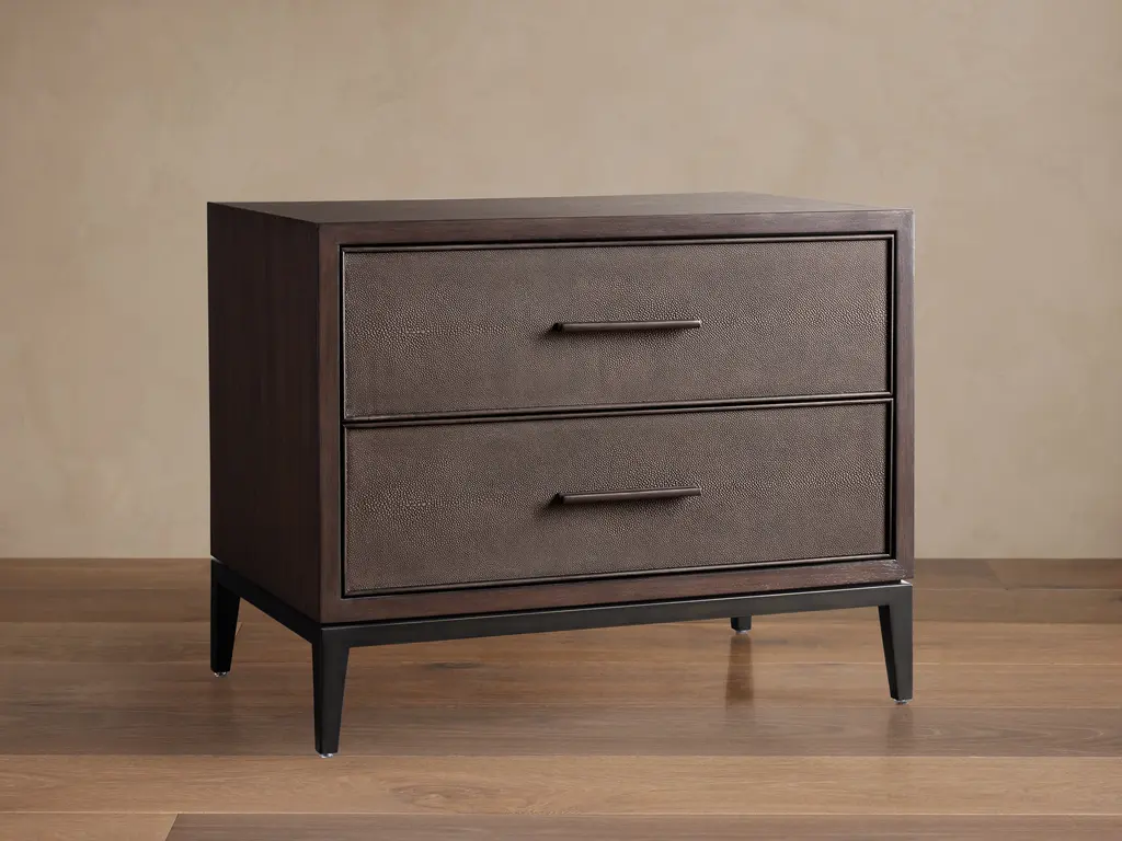 Featuring a sleek aesthetic, our Malone collection is artisan-crafted from solid parawood or oak wood—depending on your preferred finish—and surfaced with walnut or elm wood veneers. Insets made from reconstituted leather embossed with a shagreen pattern are complemented by hand-applied finishes to give this collection a modern look with intriguing textural details.