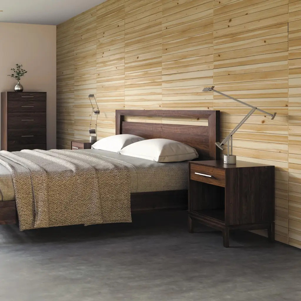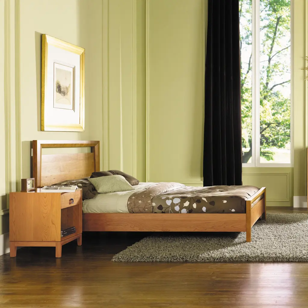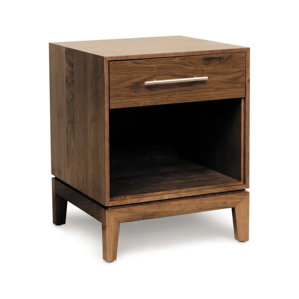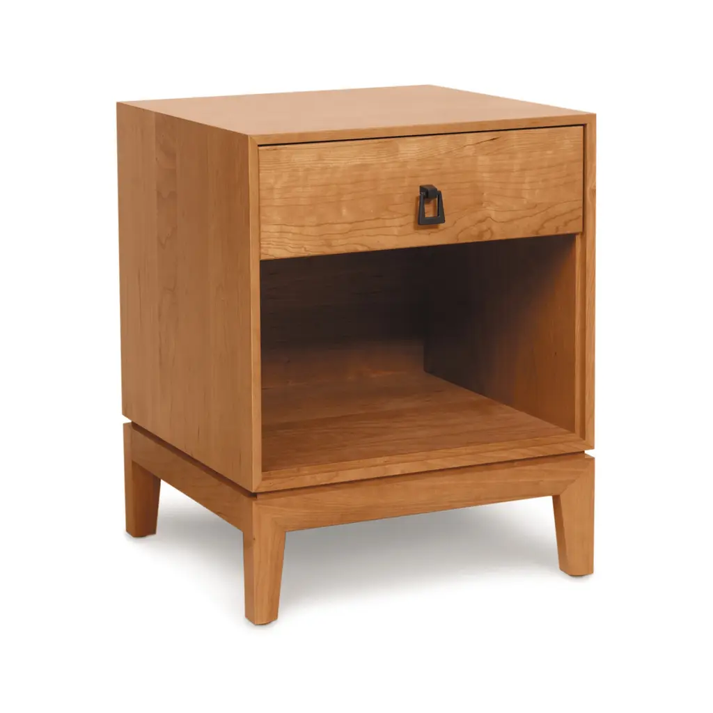 Elevate your bedroom with the Mansfield 1 Drawer Nightstand from Copeland Furniture. Mitered frames and black bronze ring pulls create a complex yet visually stunning design. Crafted in solid cherry or walnut and accented with sleek drawer pulls, this piece seamlessly blends the familiar with the unconventional. The single drawer and open shelf provides ample storage for bedside essentials while the tabletop can hold a chic lamp or favorite bedtime read. Highlights