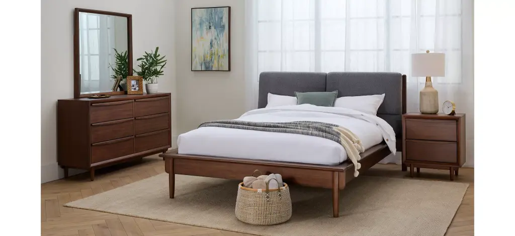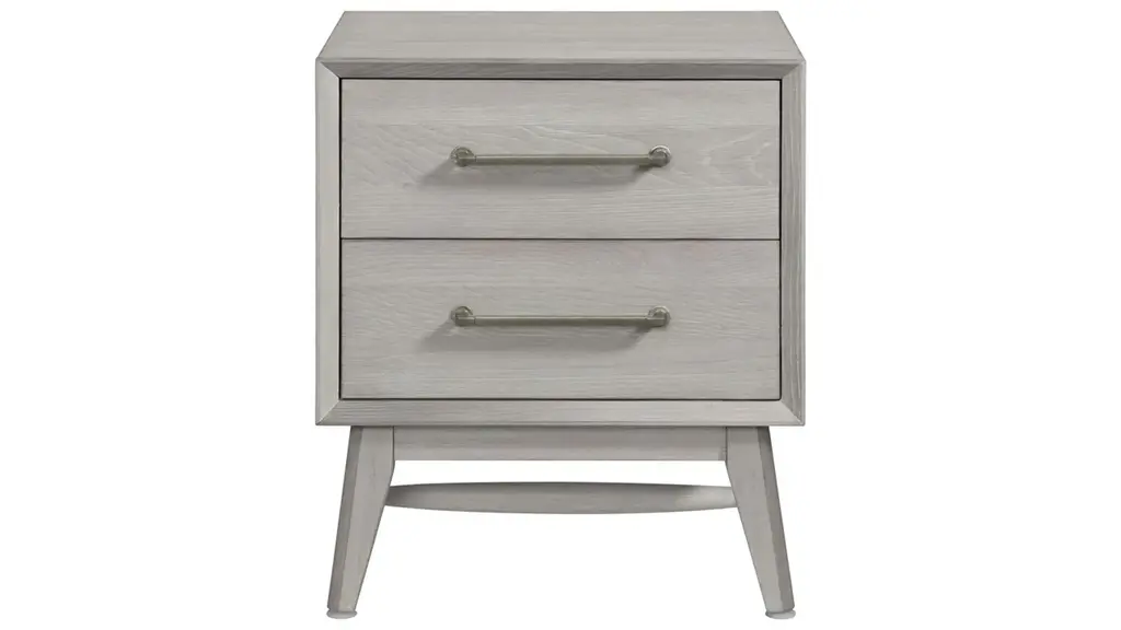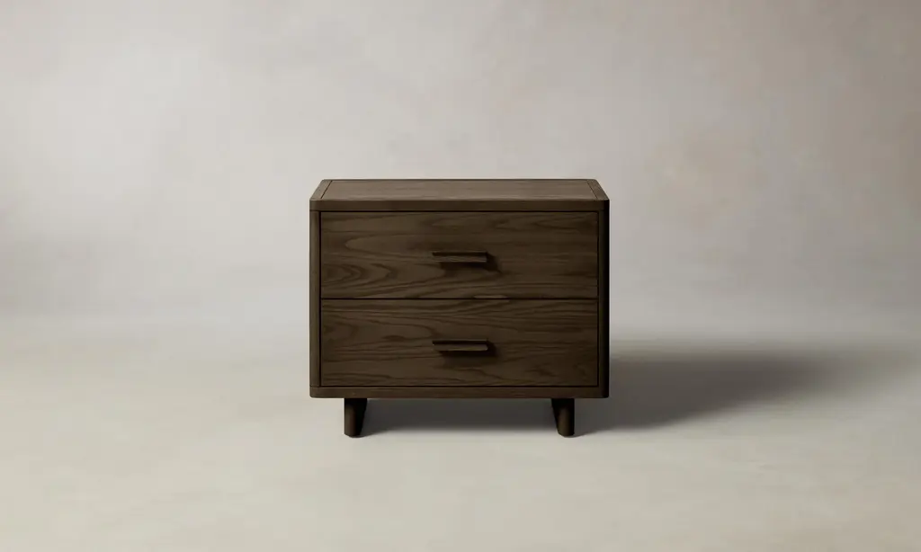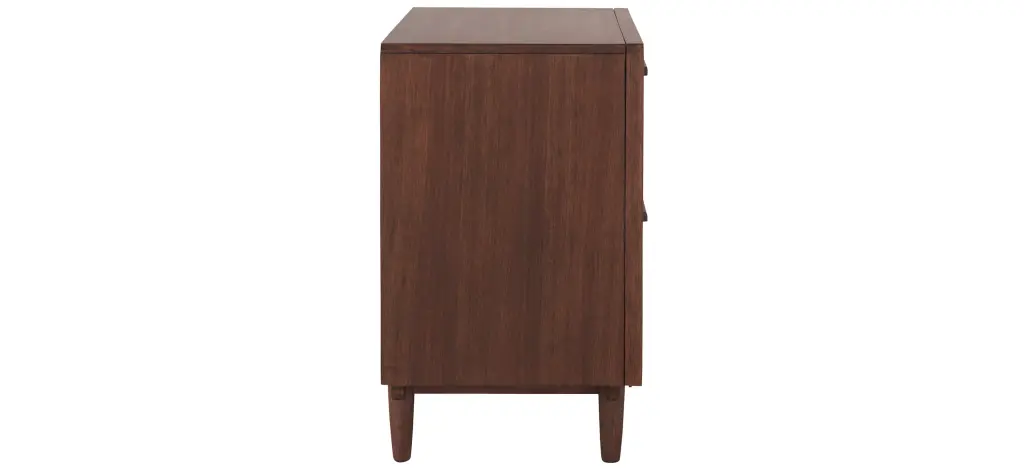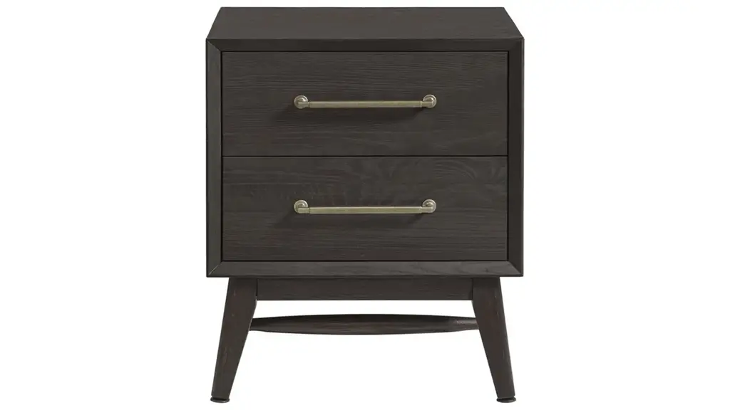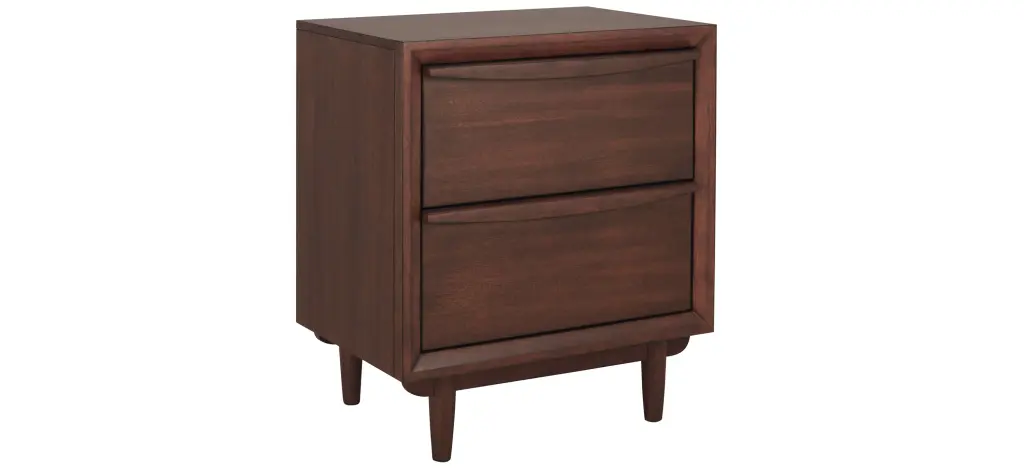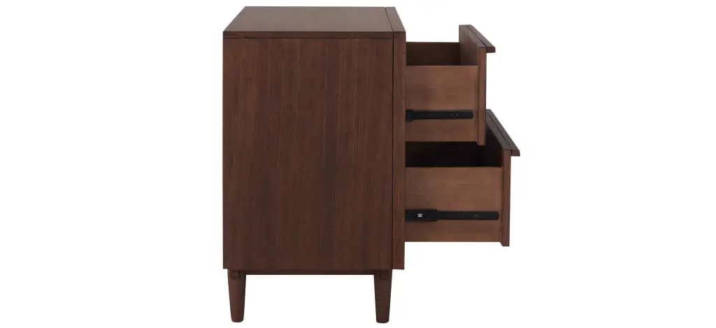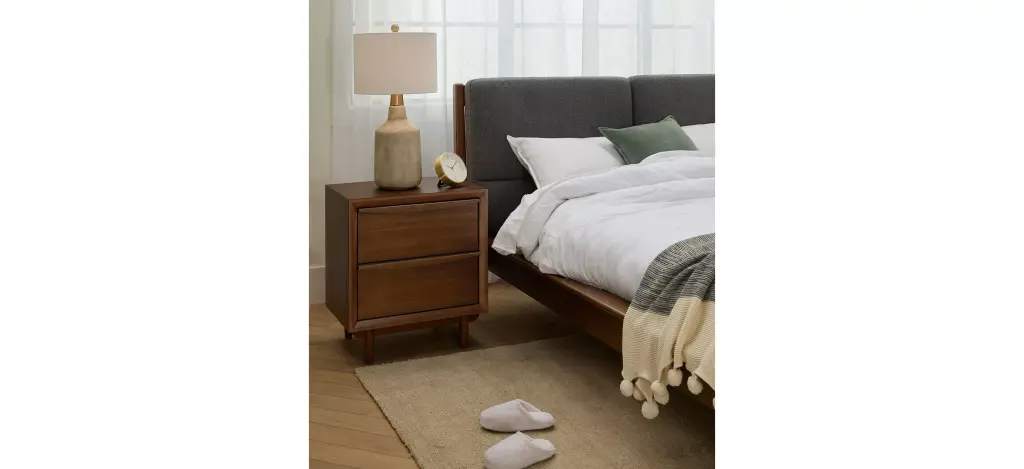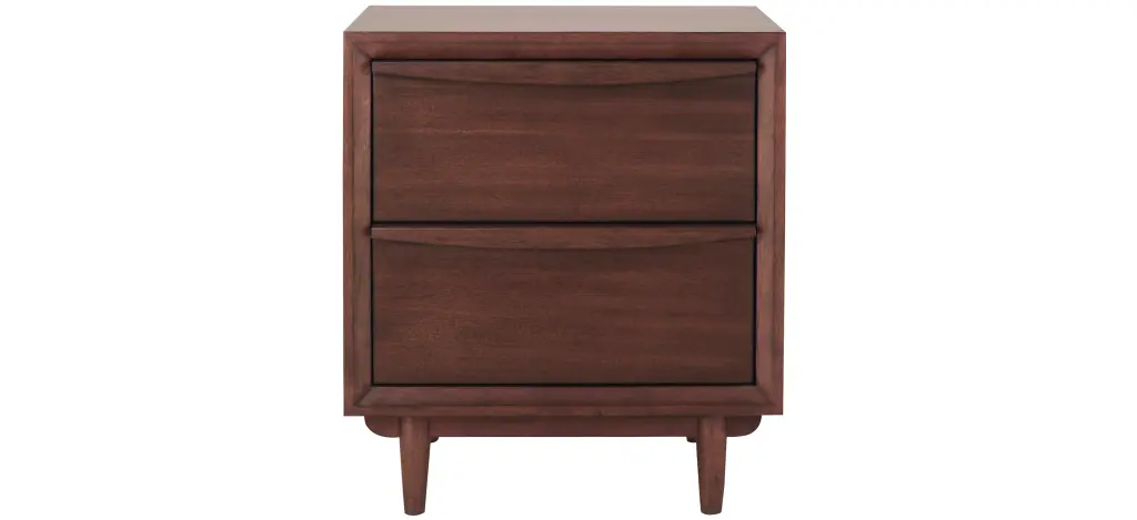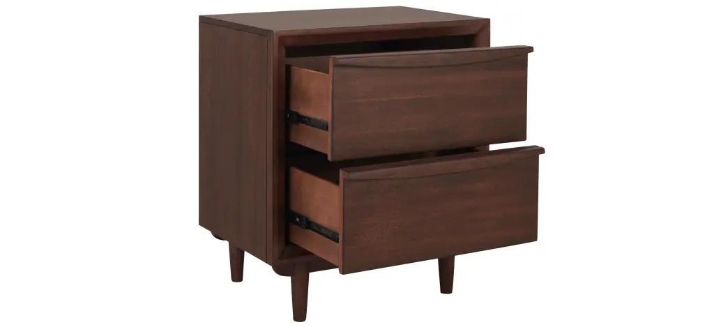 Wake up to modern midcentury style with the Marcelo nightstand. This handsome collection features a rich walnut finish and contemporary bar hardware. With two roomy drawers, USB port, and a sleek silhouette, this nightstand is a defining choice for a look that transcends trends.