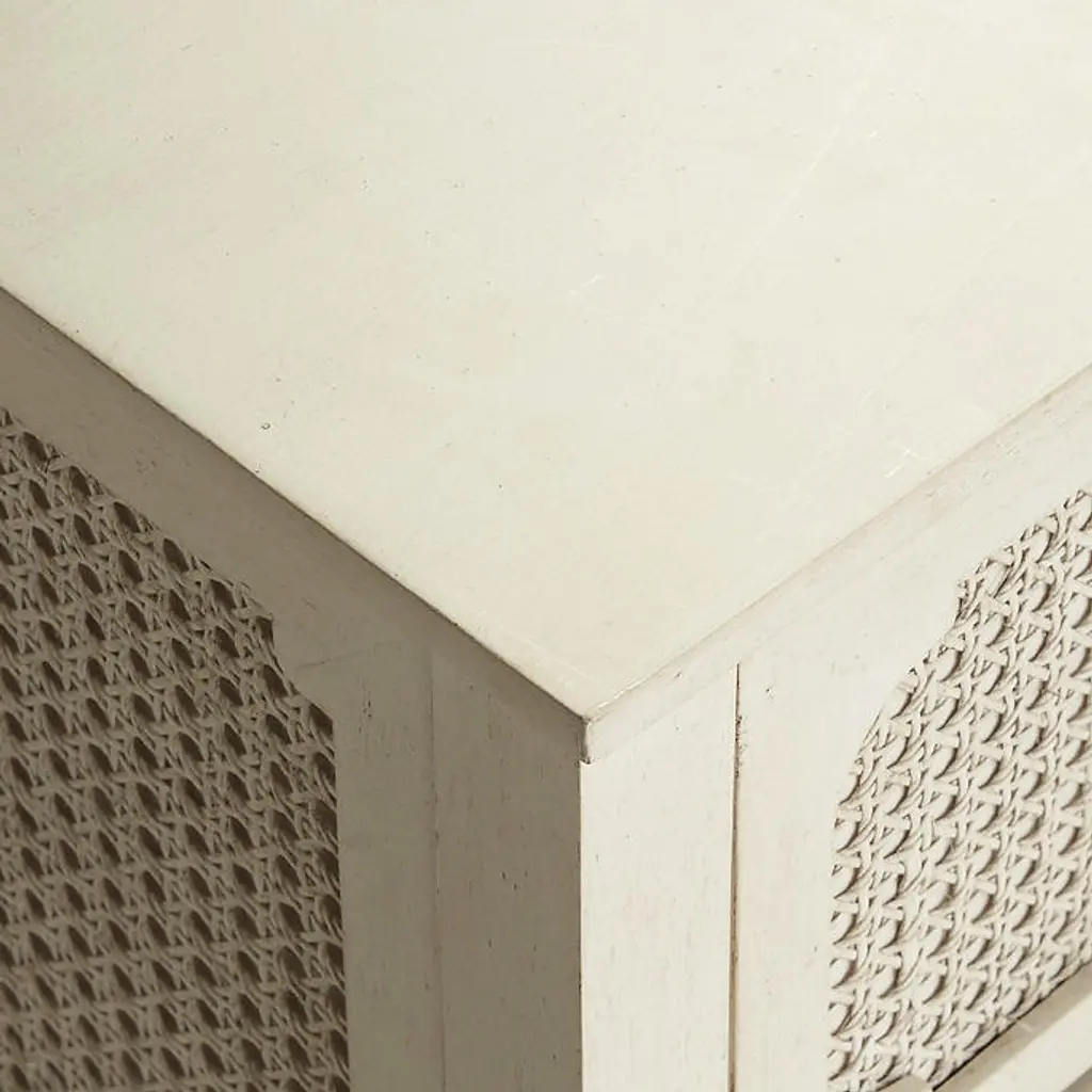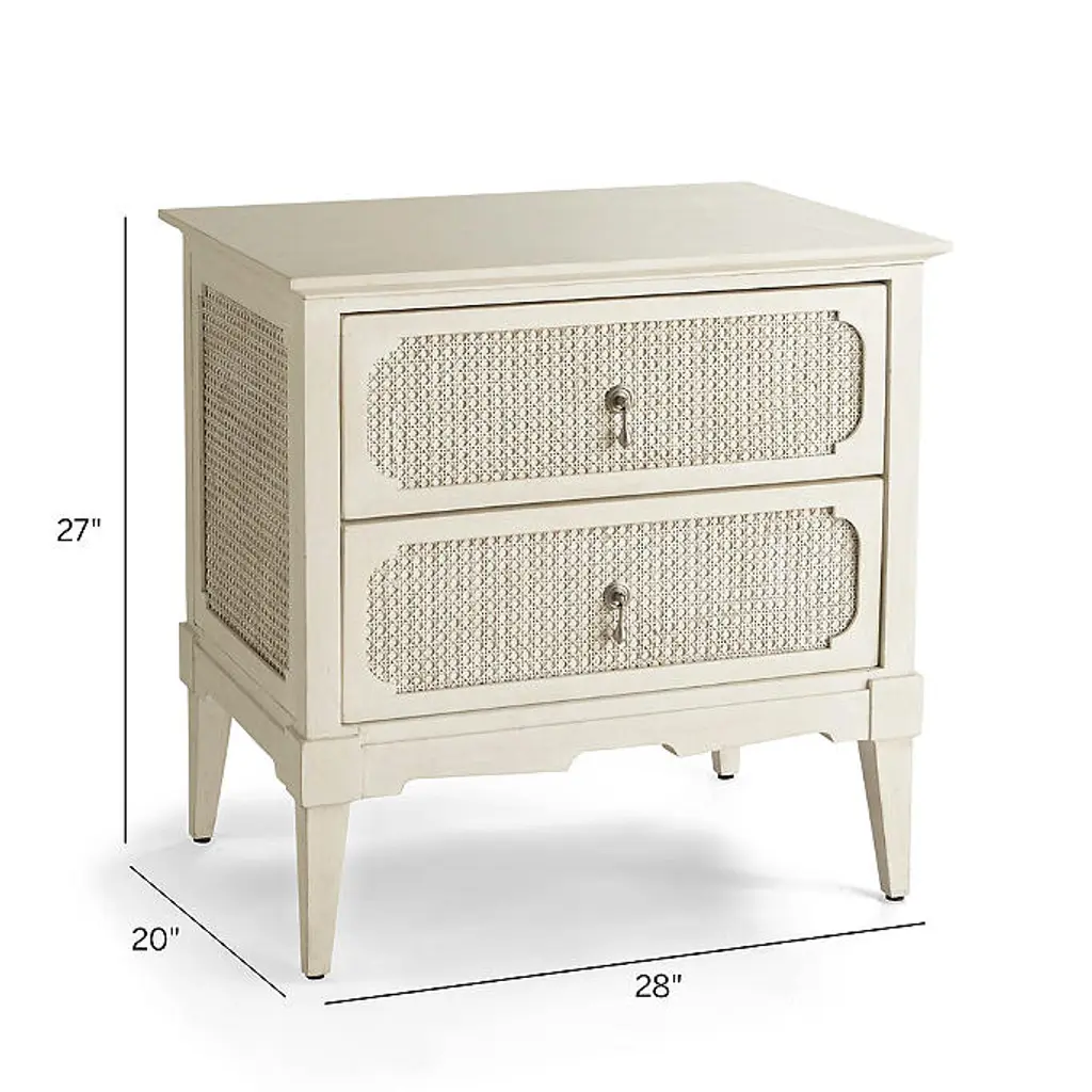 The smooth lines of the Marion Nightstand profile are crafted in sturdy, solid wood and given extra texture with handwoven rattan facades on the door and sides in the same finish. It's finished with tapered legs and accented with silver teardrop drawer pulls. Solid mahogany and engineered wood with mahogany veneer Handwoven rattan caning accents on doors and sides with matching finish Soft White finish has cream undertones Due to the hand-finishing process, finishes may slightly vary Two drawers with slow-close, full-extension drawer glides Inside of drawers features a natural mahogany finish Silver teardrop drawer pulls Tapered legs with non-marring floor glides For indoor use Included anti-tip kit is required for installation; kit consists of safety-tested mounting hardware, a nylon strap, and instructionsTo prevent injuries from furniture tipping over, this item must be permanently affixed to the wall; professional installation is recommended To prevent injuries or damage to item, recommended team lift (two or more people) for furniture placement Arrives assembled Imported A Frontgate exclusive. At Frontgate, our primary focus is quality. We guarantee that every product we sell will stand up to the supreme test – our customers' satisfaction. To learn more about our policies, visit our Shipping & Processing, Returns & Exchanges and Warranty & Price Guarantee pages.