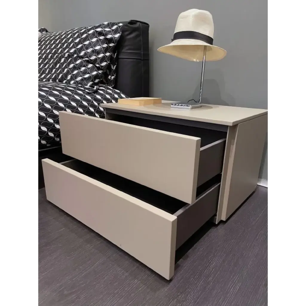 The Matte Grooved Nightstand by Lema is a floor container system comprised of drawers, night tables, and seven-drawer dressers, all with great capacity, that become part of the bedroom through their discreet charm. Rigorous geometric purity of essential and compact volumes, monoliths of material, and color marked by the shape of the grooved profile of the handle, at times lateral and at others central. The attention given to proportion, the slight differences in alignment between the parts, and the material palette enhanced by the top in wood, matt or glossy lacquered, or natural stone, characterize a group of understated and elegant products, easy to combine with diverse styles of beds.