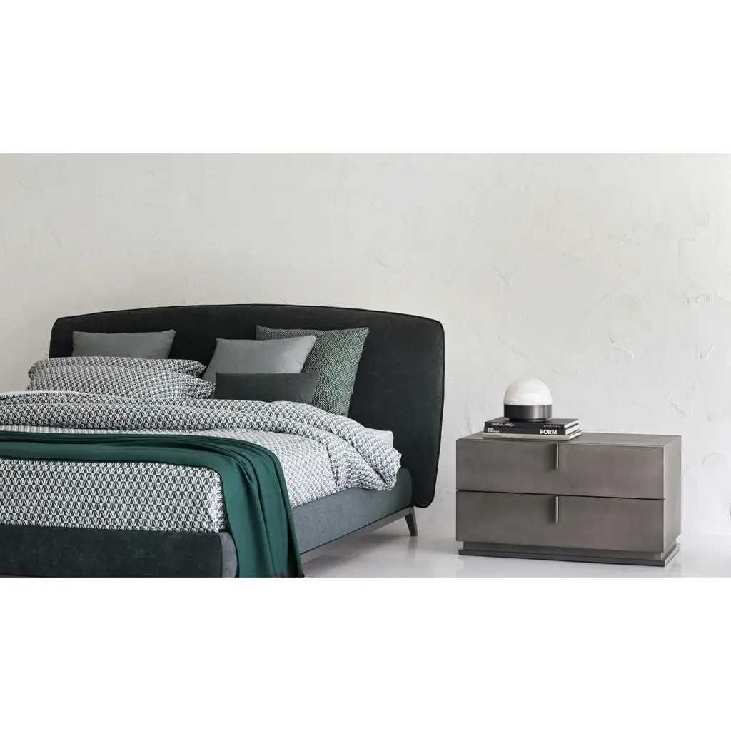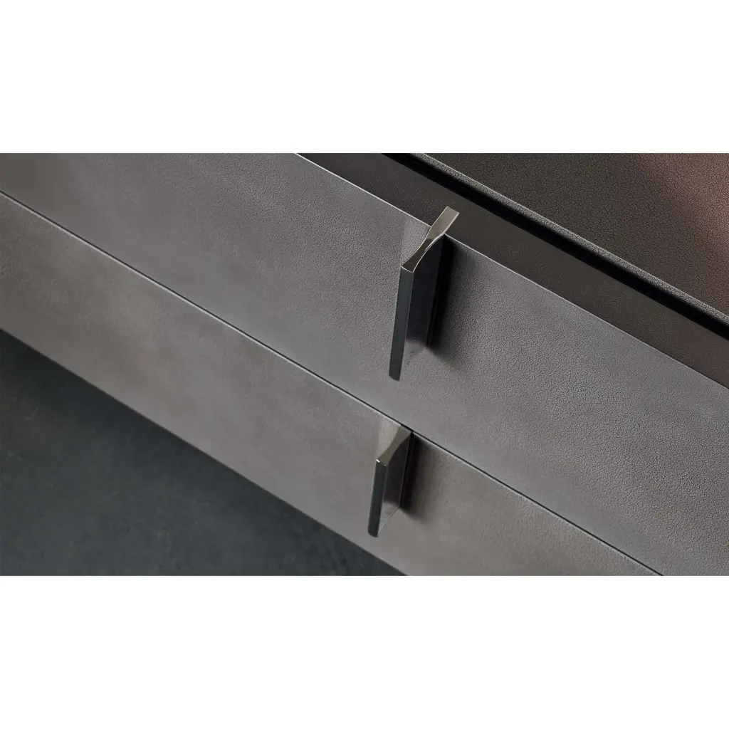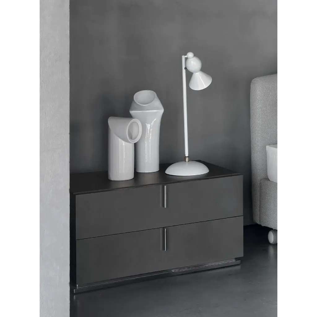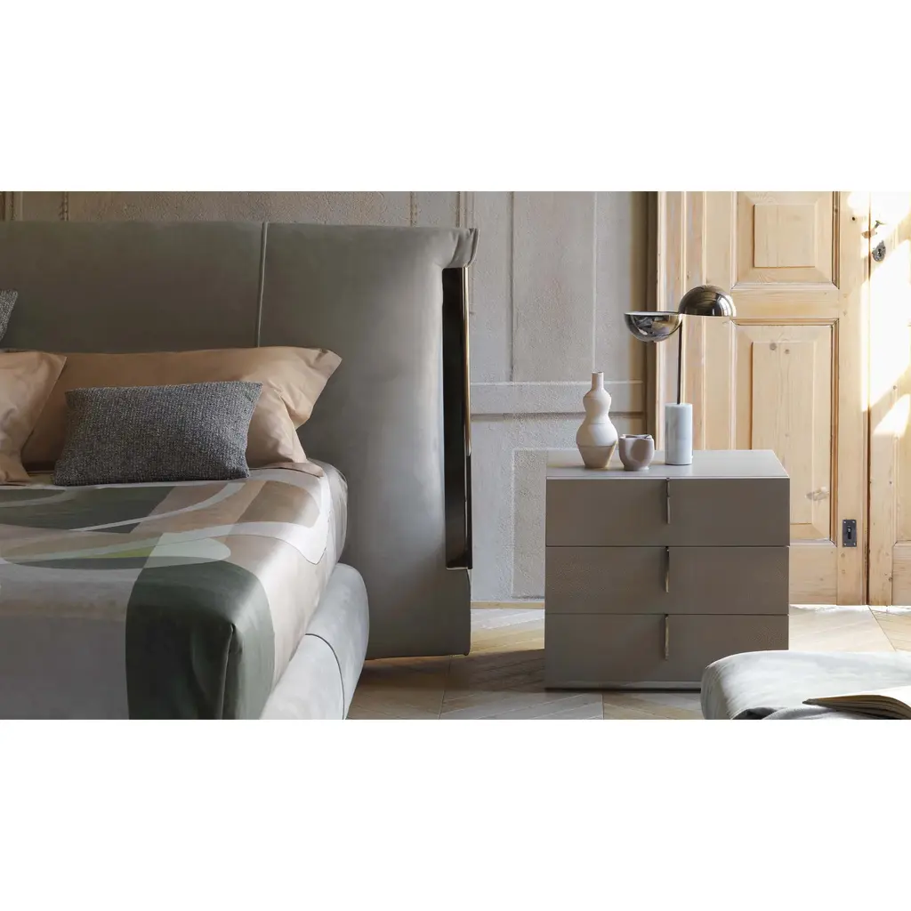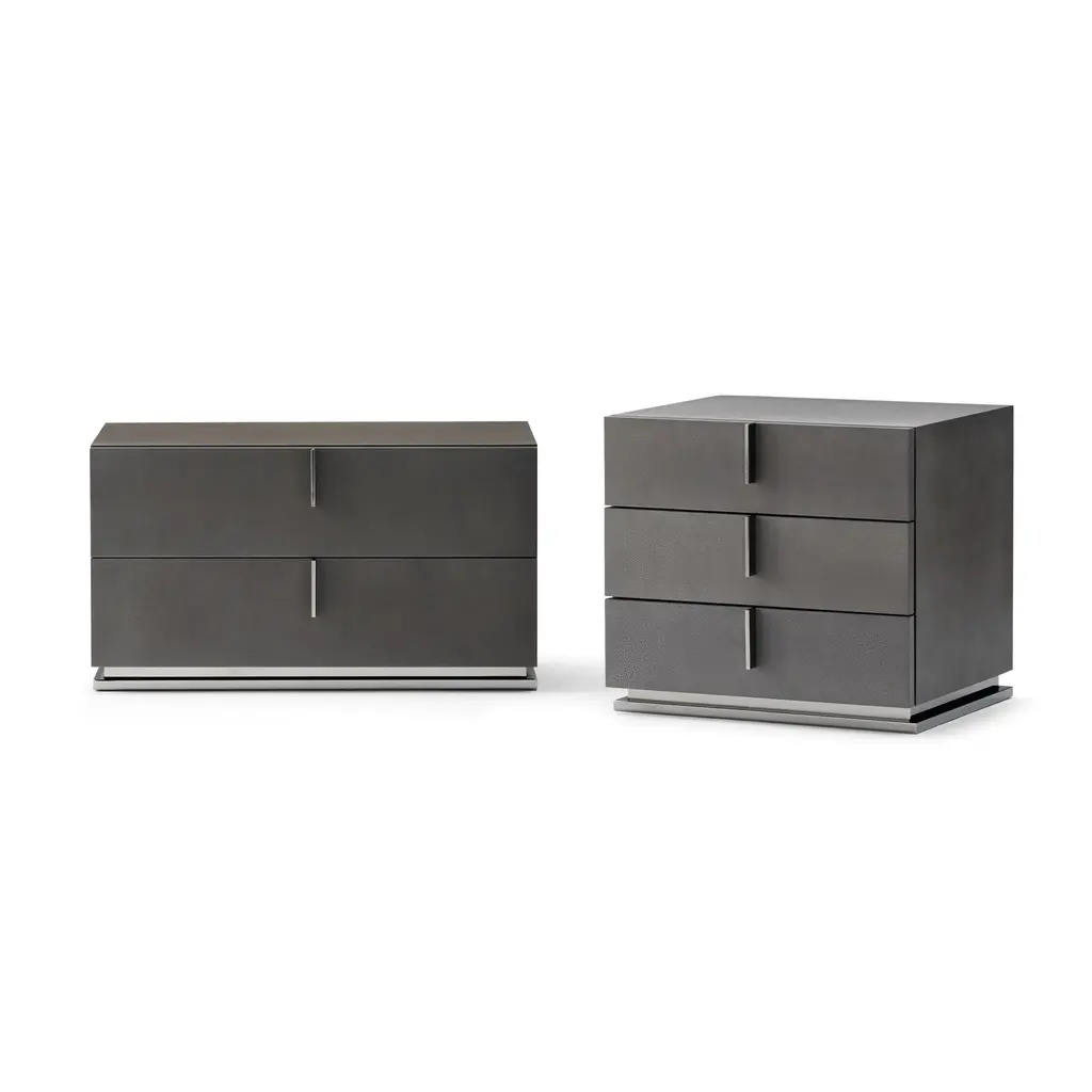 Experience luxury and elegance with the Ari Nightstand. Its wooden structure is adorned with a matt finish and a lacquered 'galuchat' effect, adding a touch of sophistication. The soft-close drawers, black stained interiors, and polished black nickel handles and base provide convenience and style. Add a touch of exclusivity to your bedroom with this premium nightstand.
