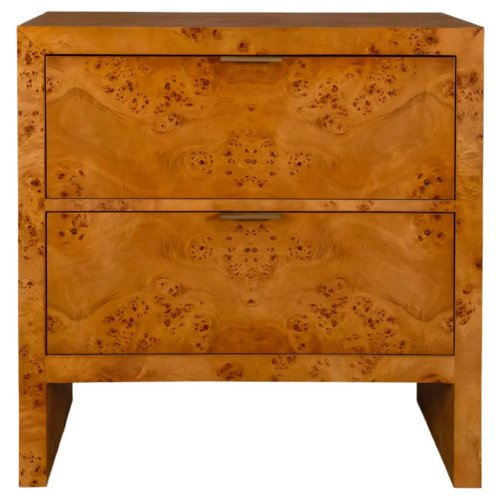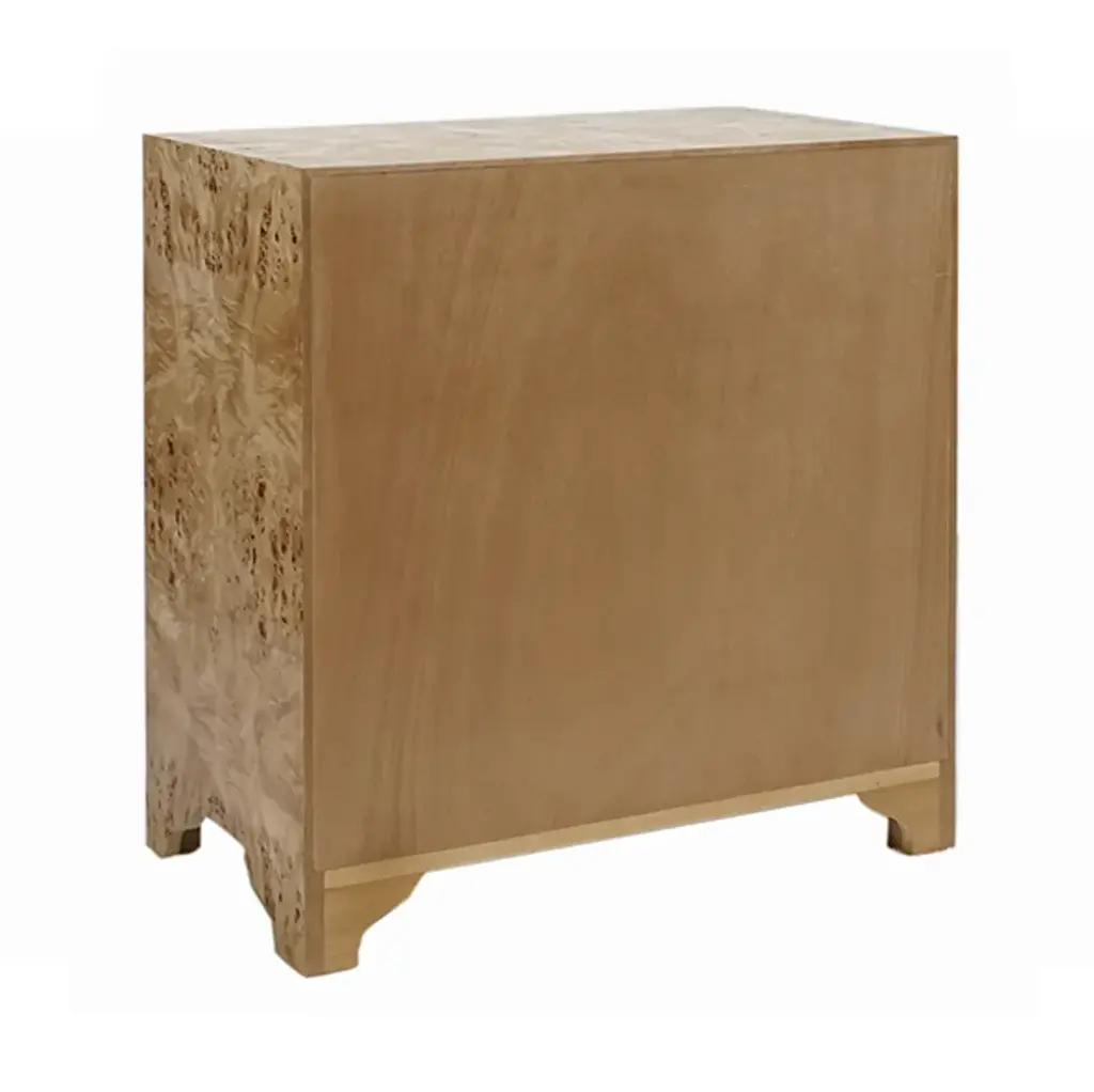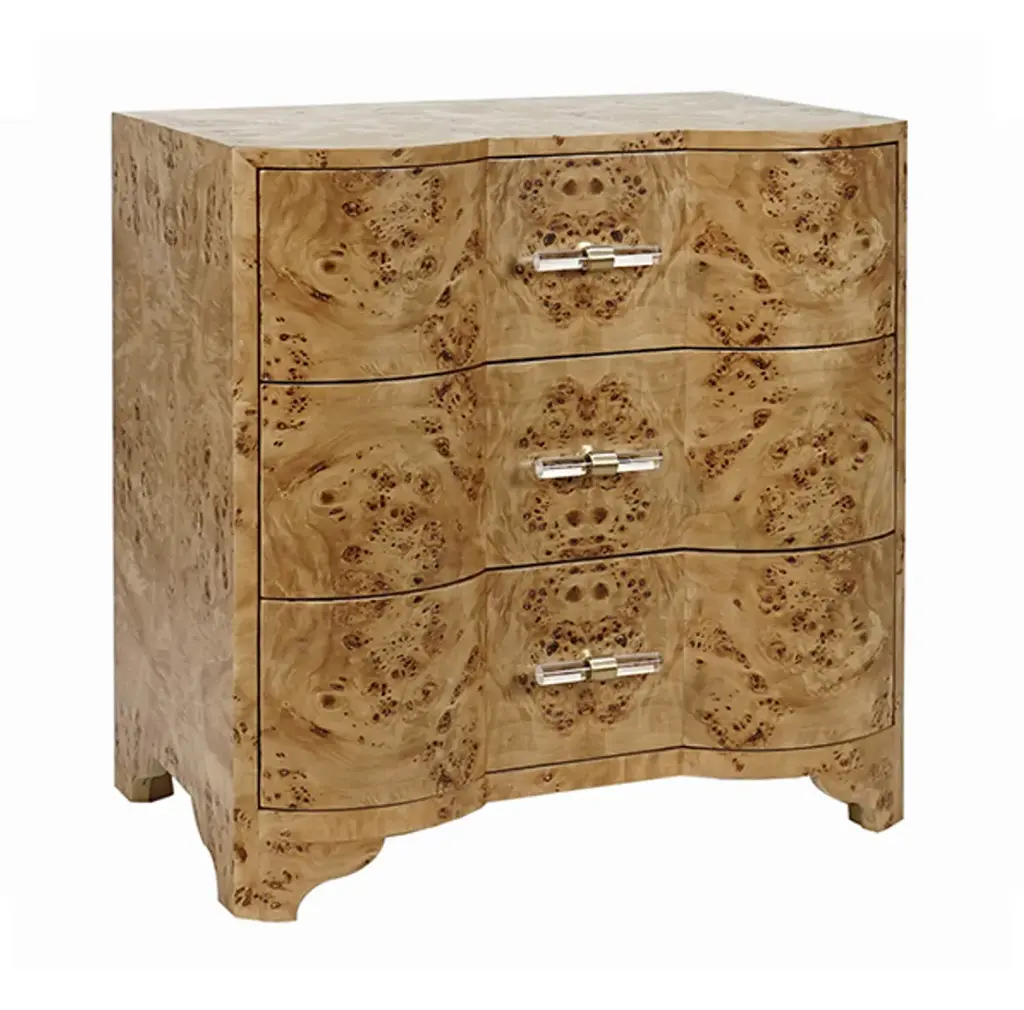 Matthew Izzo Home - Calvin Light Burlwood, Three Drawer Nightstand With Acrylic & Brass Hardware