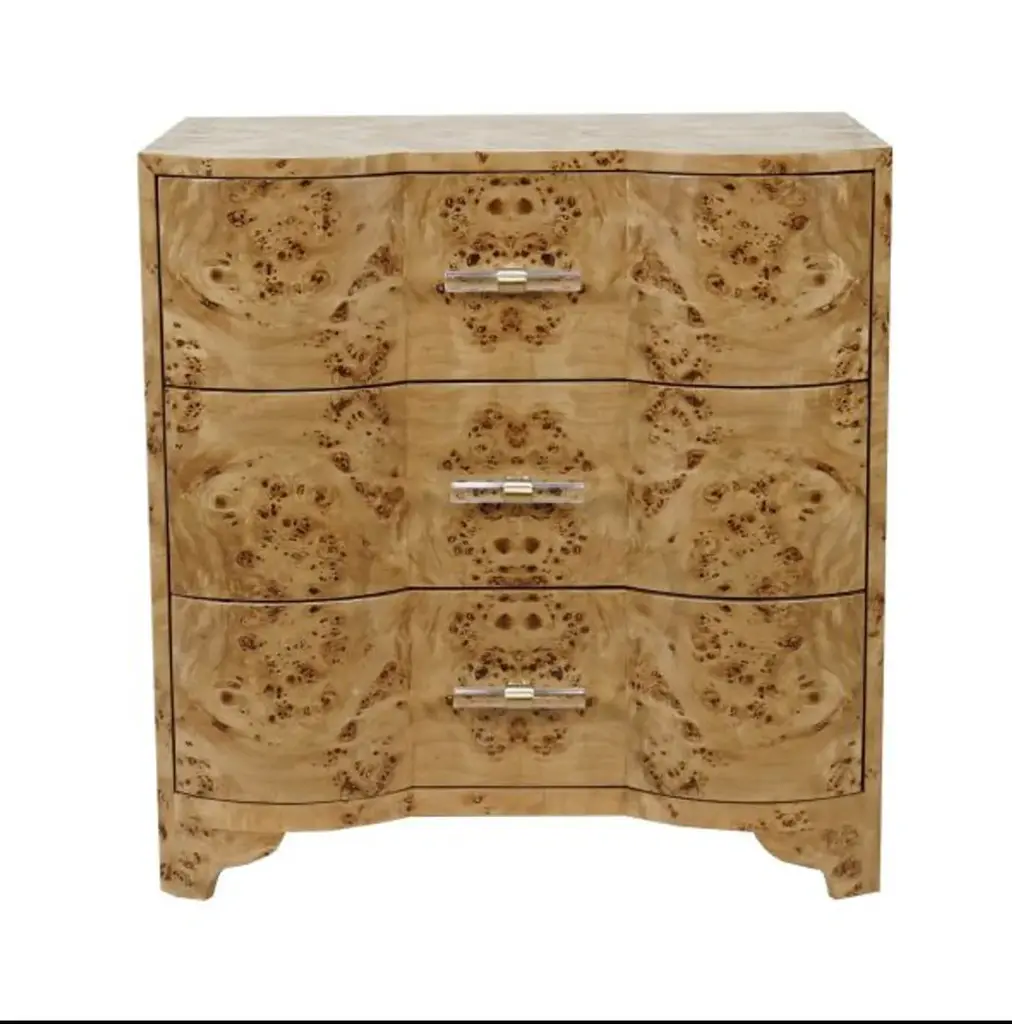 Our stunning Calvin three drawer side table is a modern heirloom in the making! Distinctive, serpentine profile is dressed in exquisite, matte burl finish and accented with acrylic cylinder & brass hardware. Three generously scaled drawers make Calvin an elegant storage solution for any interior. *Burl wood has natural variations and may differ slightly between panels. Width:28.00" Height:29.00" Depth:18.00" Free Delivery