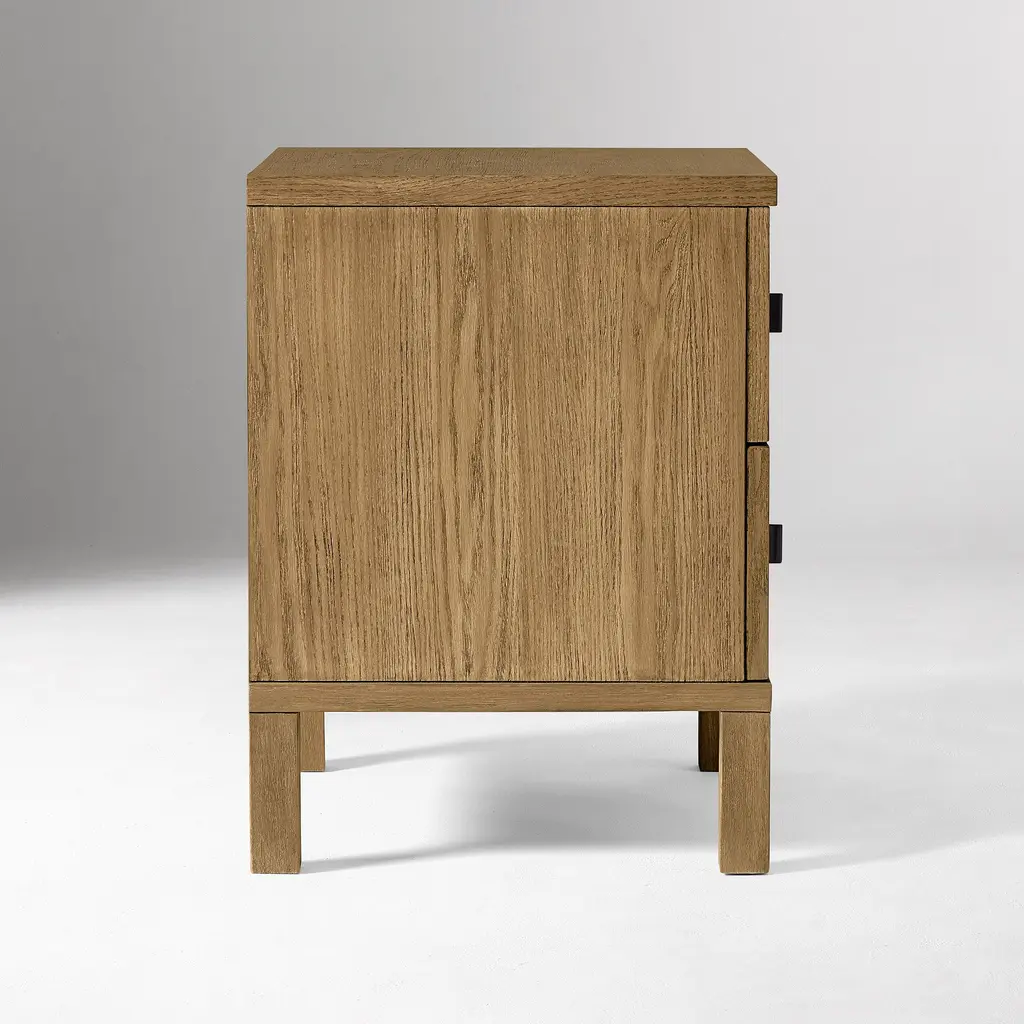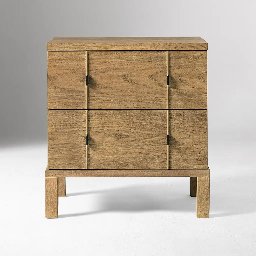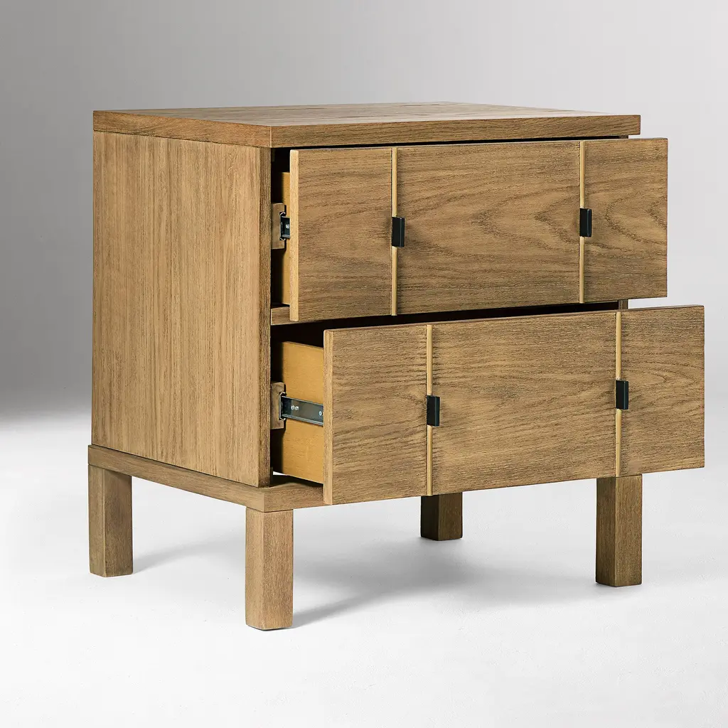 Grid-like patterned drawer fronts for modern symmetry. Integrated metal pull tabs in Dark Bronze contrast with the warm finish. Two drawers provide access to plentiful storage space. Contract Grade, so you know it’s built to last.