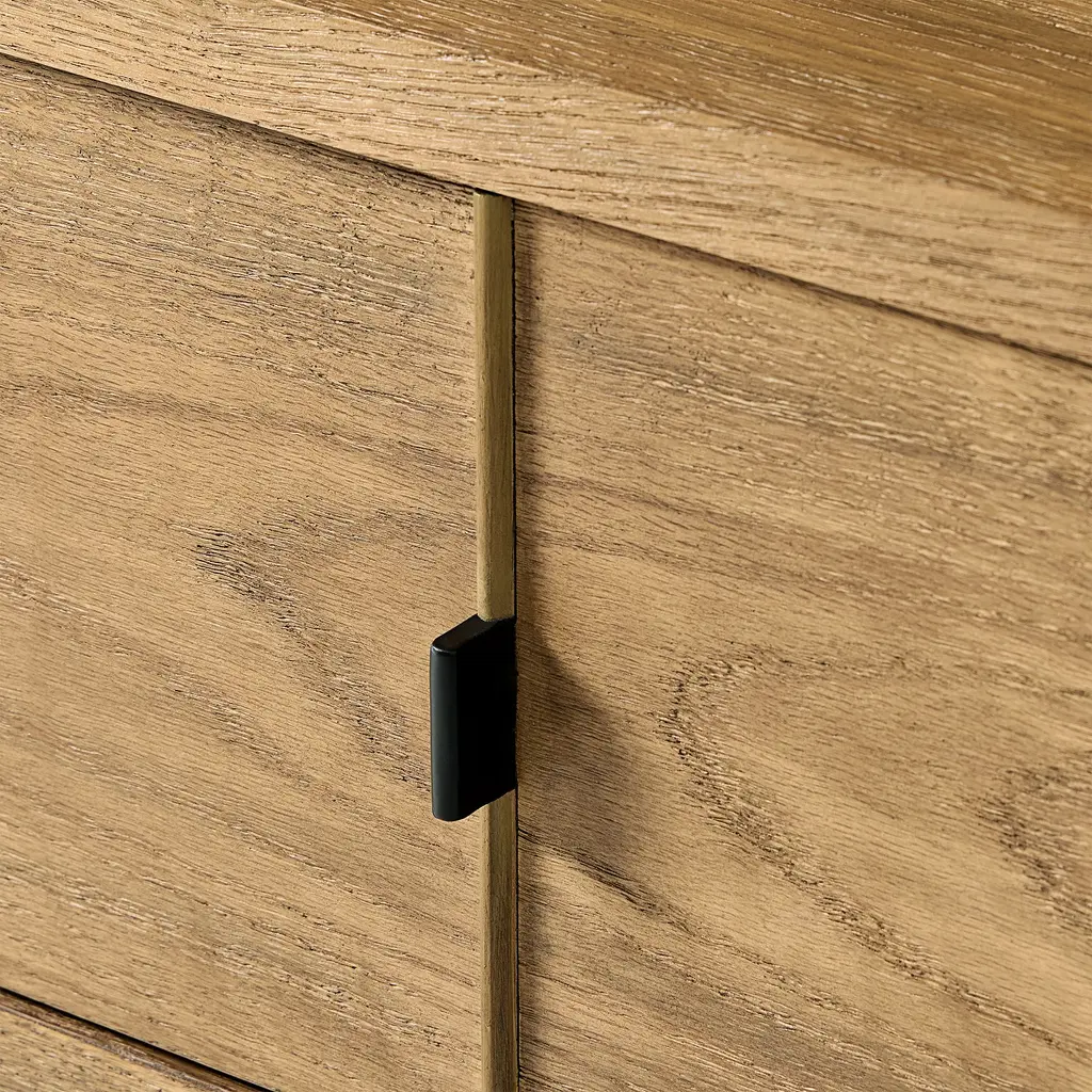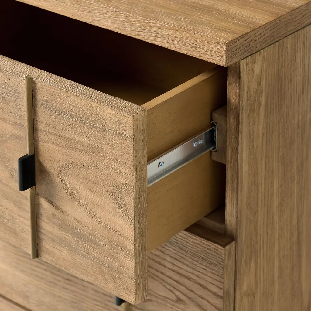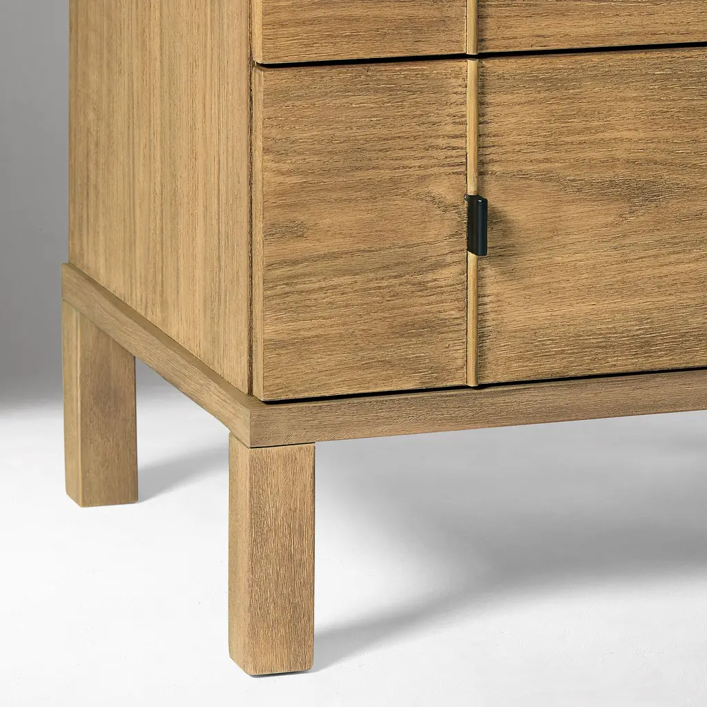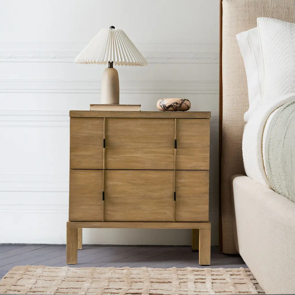 Grid-like patterned drawer fronts for modern symmetry. Integrated metal pull tabs in Dark Bronze contrast with the warm finish. Two drawers provide access to plentiful storage space. Contract Grade, so you know it’s built to last.