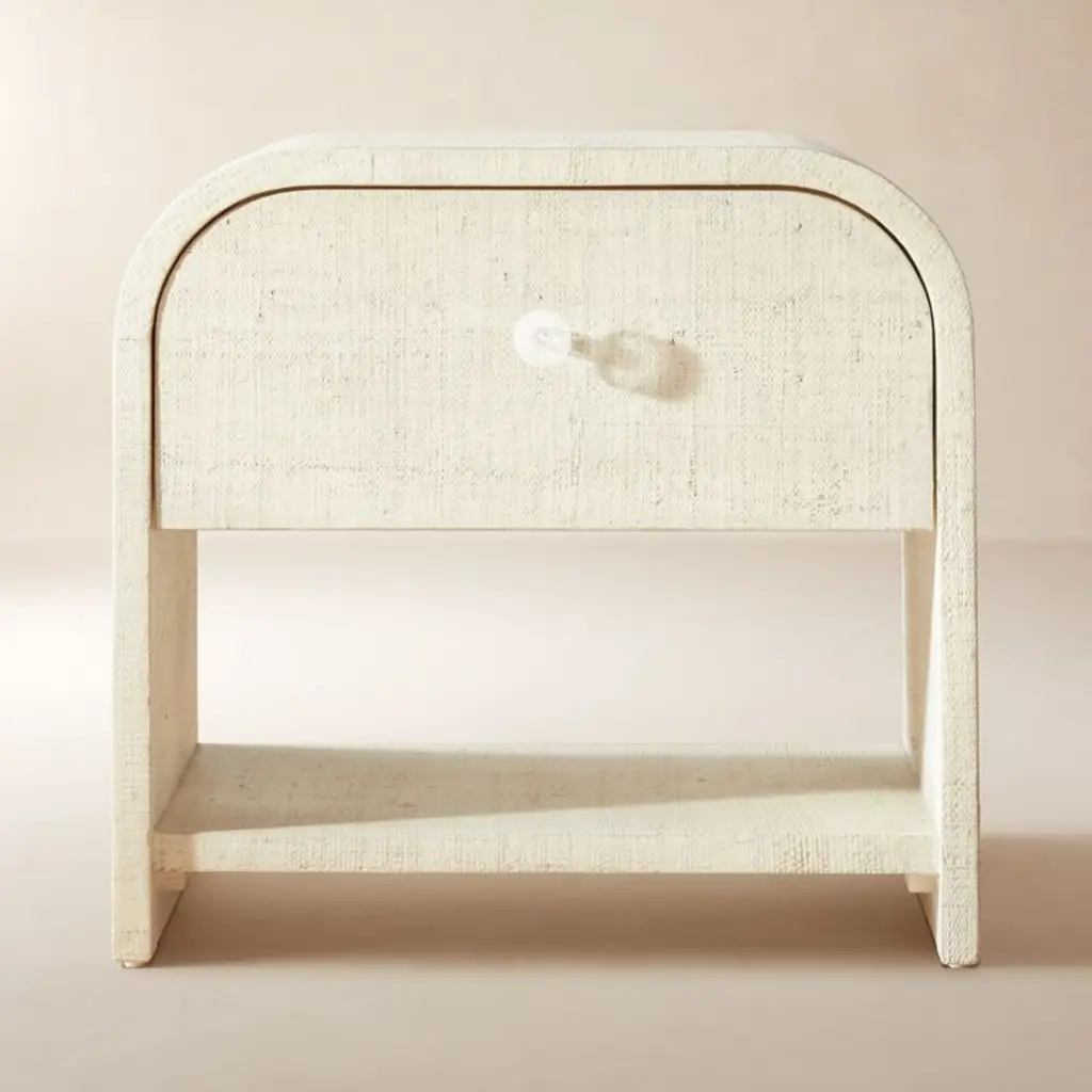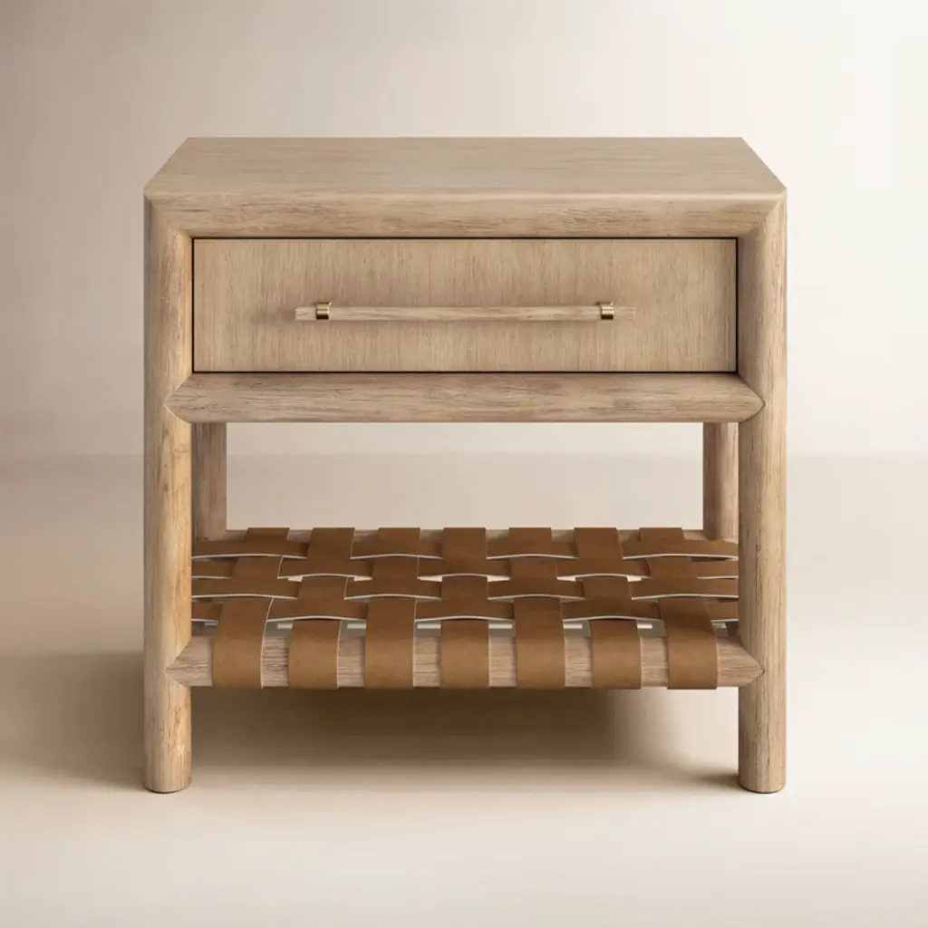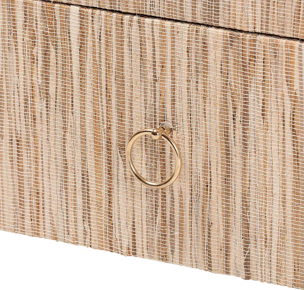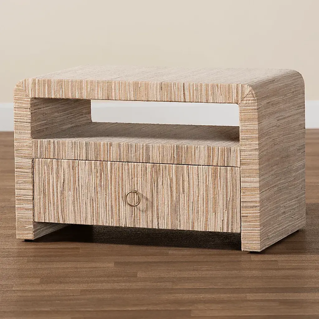 Bring the tranquility of paradise to your bedside with the exuberant Mazehive light brown nightstand. This bohemian piece consists of a sturdy wood frame beautifully embellished with woven natural grass cloth. The drawer and open shelf adeptly organizes bedside essentials and reserve the tabletop for nightly use. The Mazehive will arrive fully assembled and is fitted with a metal ring pull that adds a glamorous touch against the rustic grass cloth exterior. Grass cloth is a product of nature and may have variations in areas such as, but not limited to, color, pattern, grain and texture. The hair-like strands of wicker/wicker-like fiber are common due to the nature of the material. Customer assembly is required.