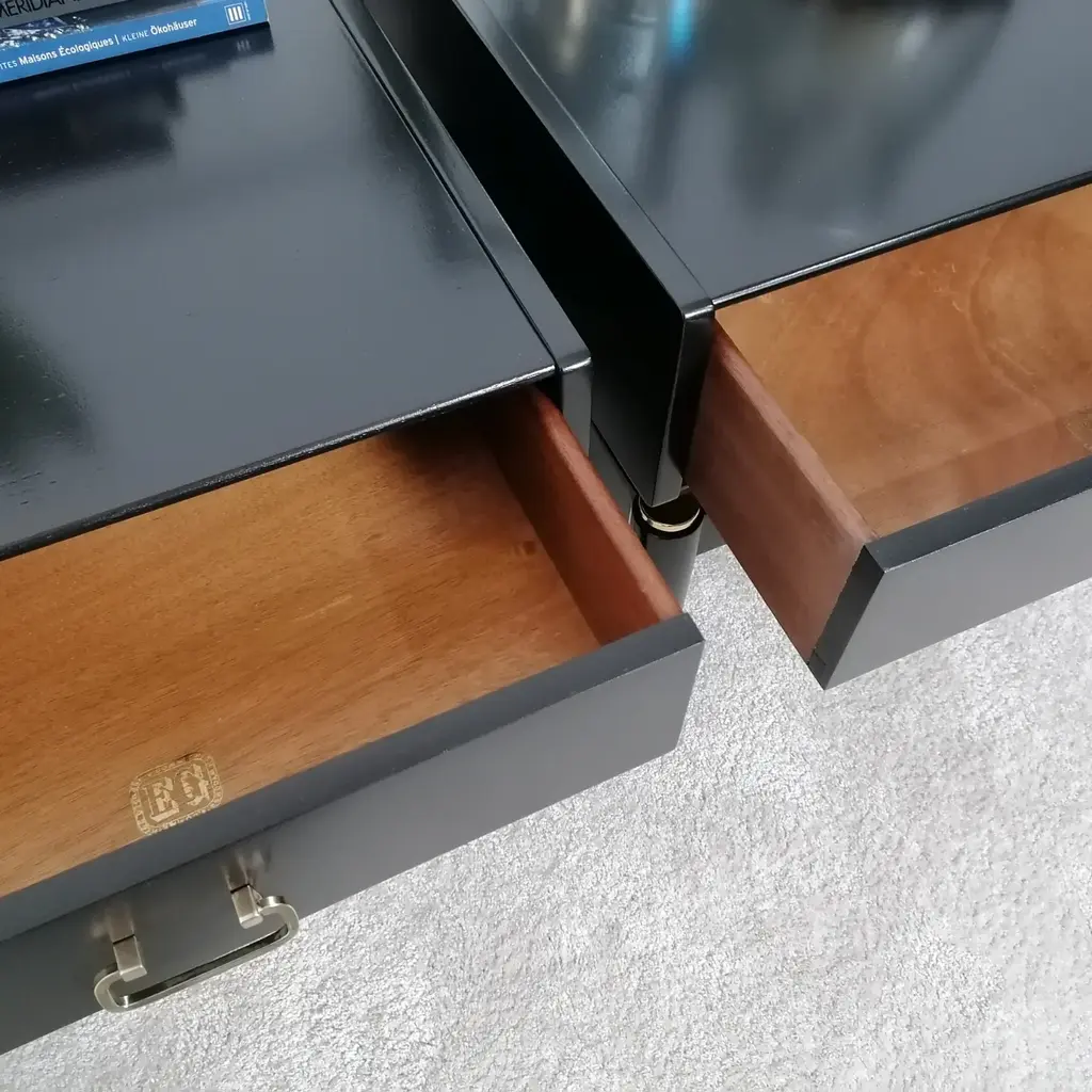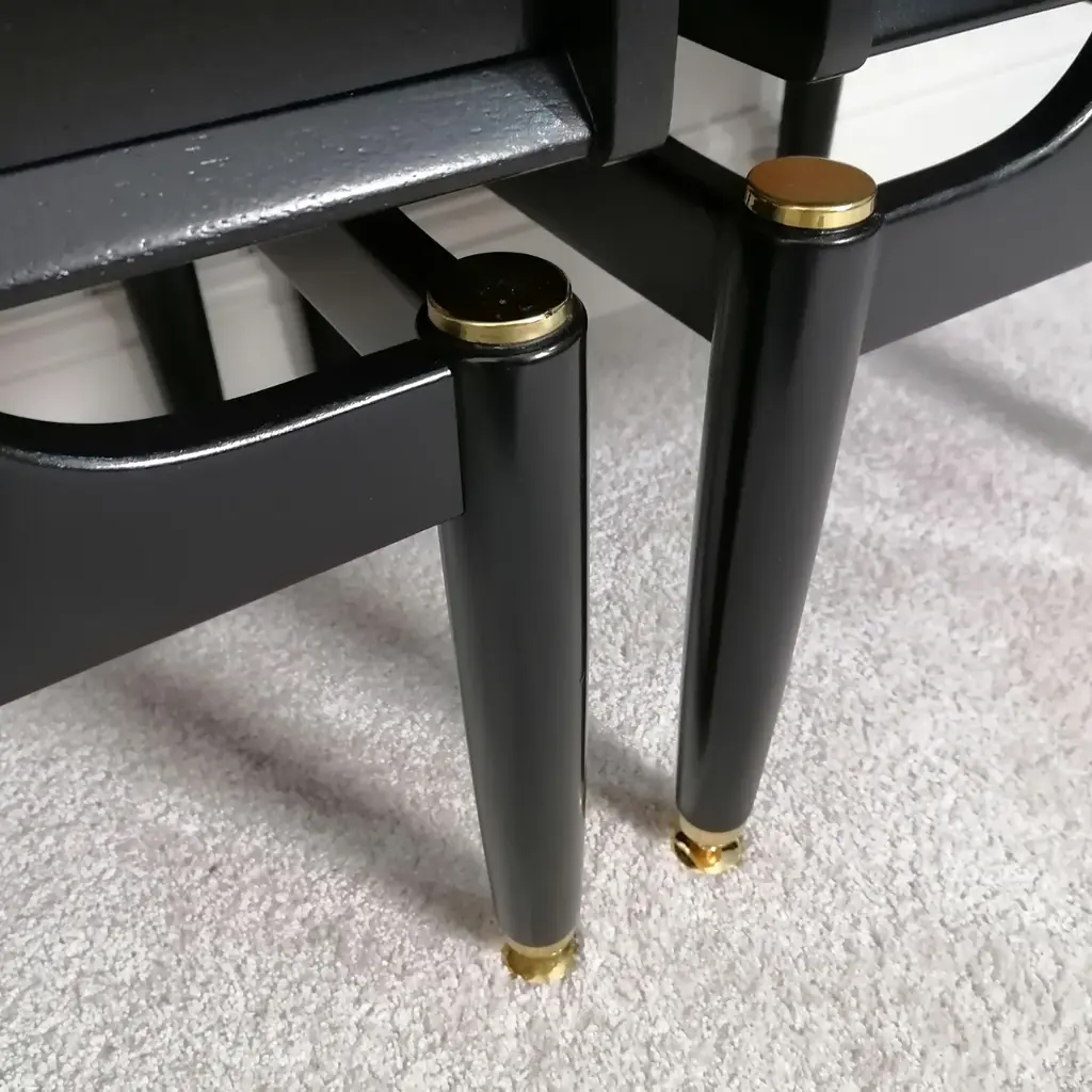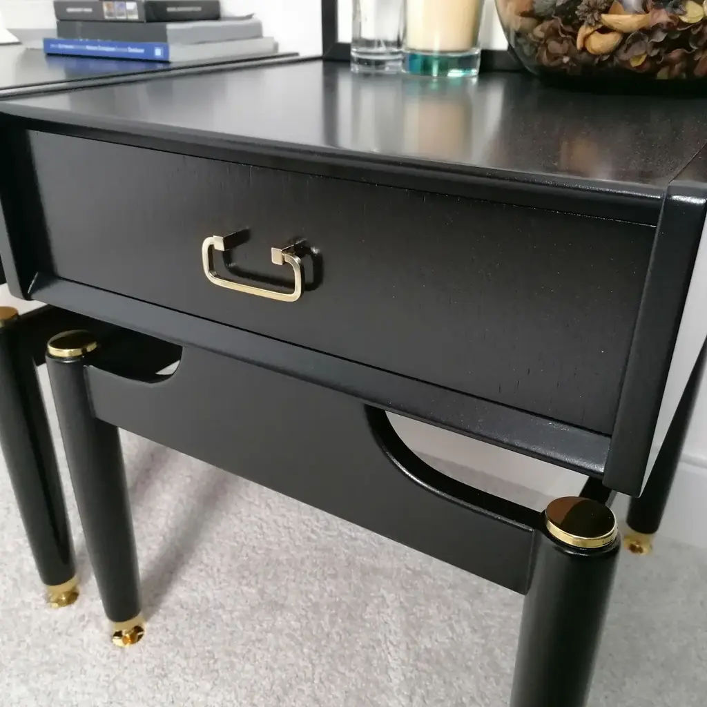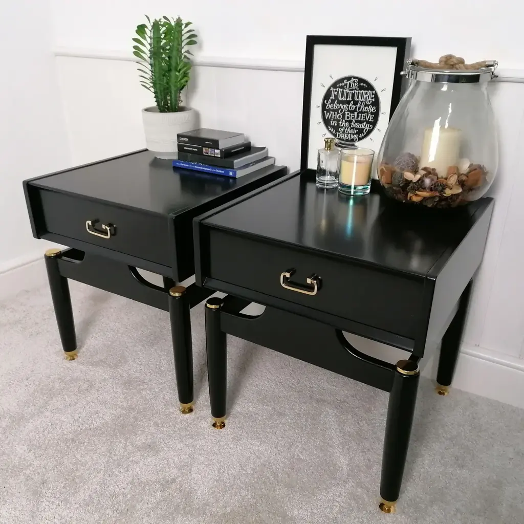 Pair of g plan bedside tables in black, gold. beautiful vintage piece lovingly restored stripped down and painted with silk touch satin finish paint in carbon black. the original solid brass feet and hardware have been stripped back and polished to their former glory. mid century g plan e-gomme adjustable feet for uneven floor english circa 1960 original g plan retail stamp inside drawer measurements 48cms wide x 46.5cm depth x 53cm height matching dressing tables are also available on our shop this piece has an attribution mark, i am sure that it is completely authentic and take full responsibility for any authenticity issues arising from misattribution