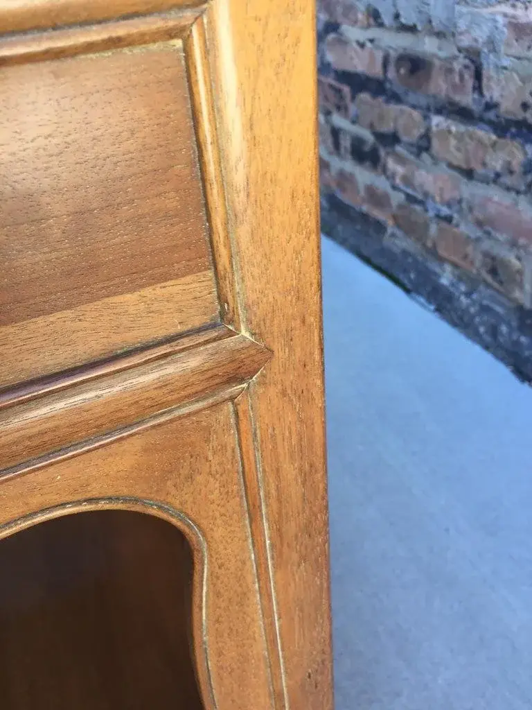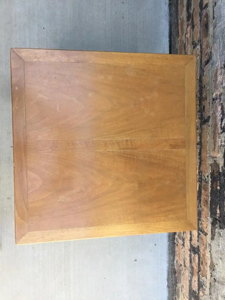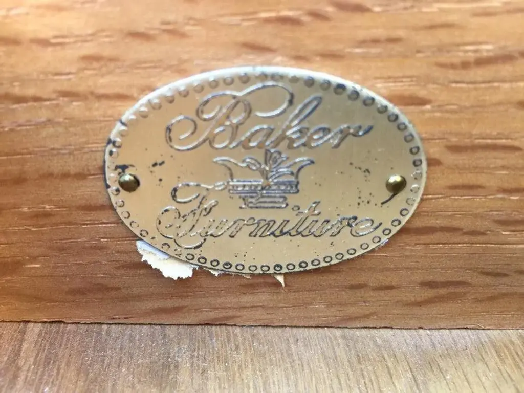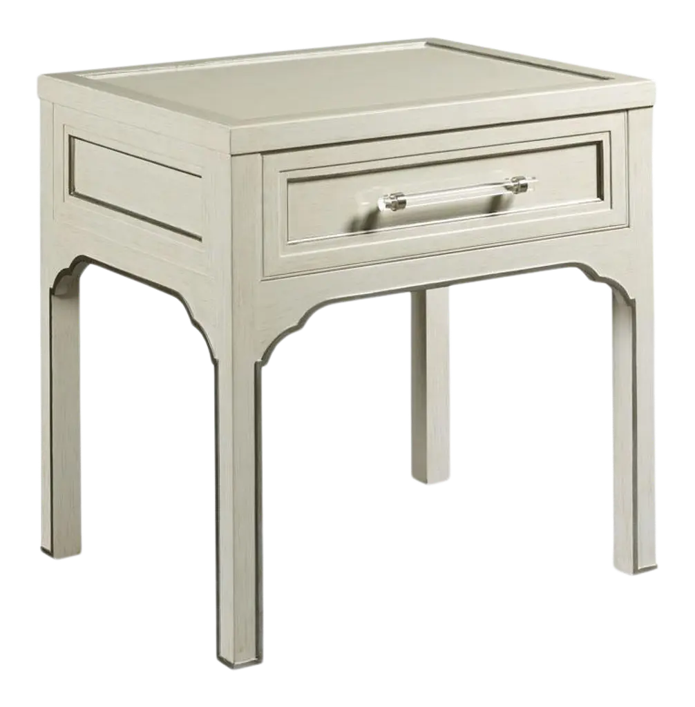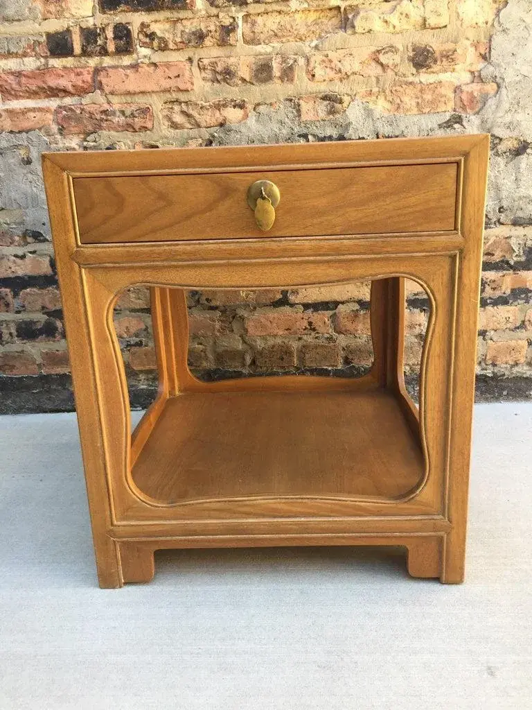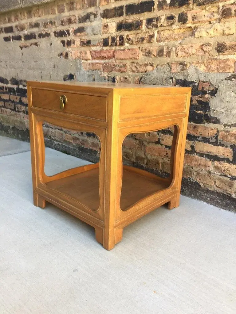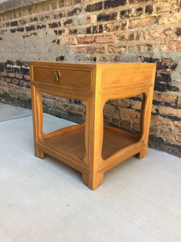 Mid-century Baker nightstand or end table with Asian influence. One drawer at the top of the piece and open storage underneath the drawer. Lovely brass hardware. Very good original condition. Some wear consistent with age and use. 20"Wx 20"D x 23"H