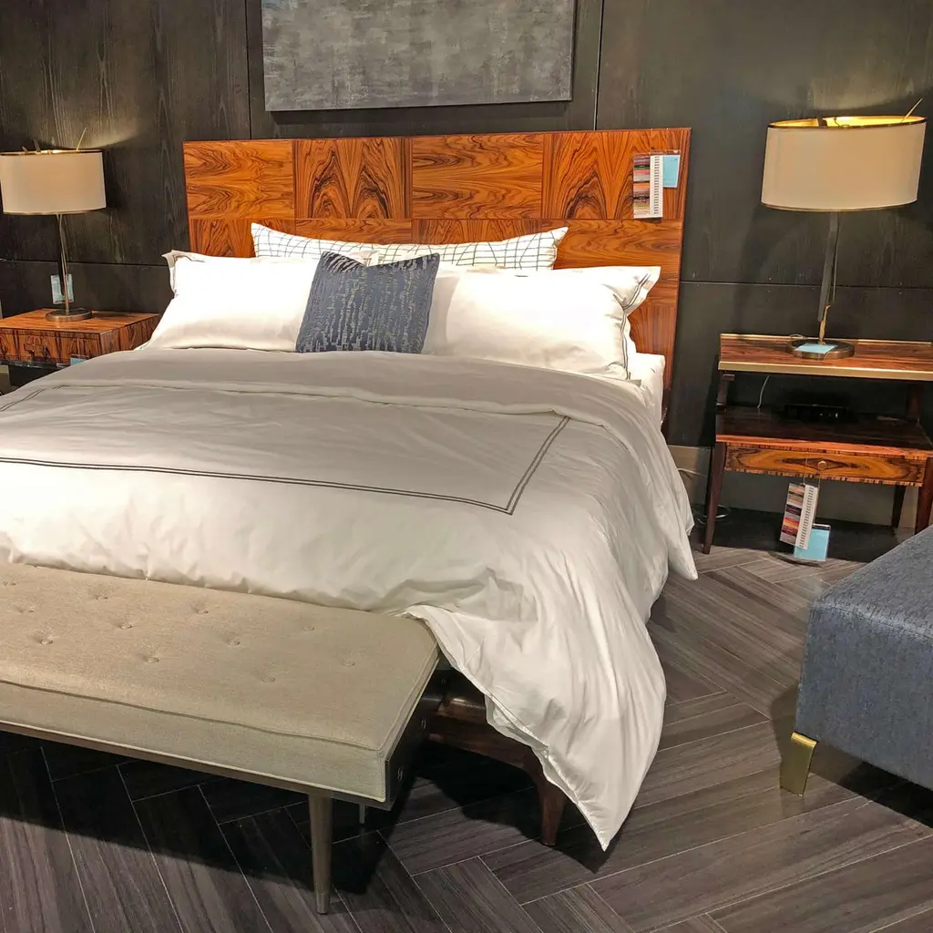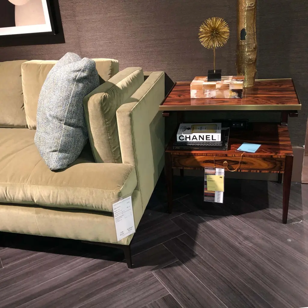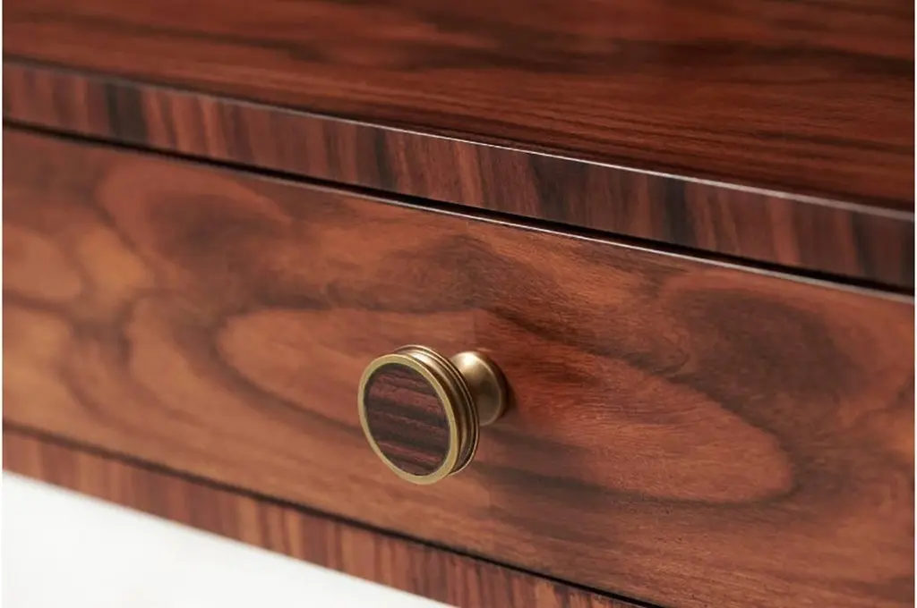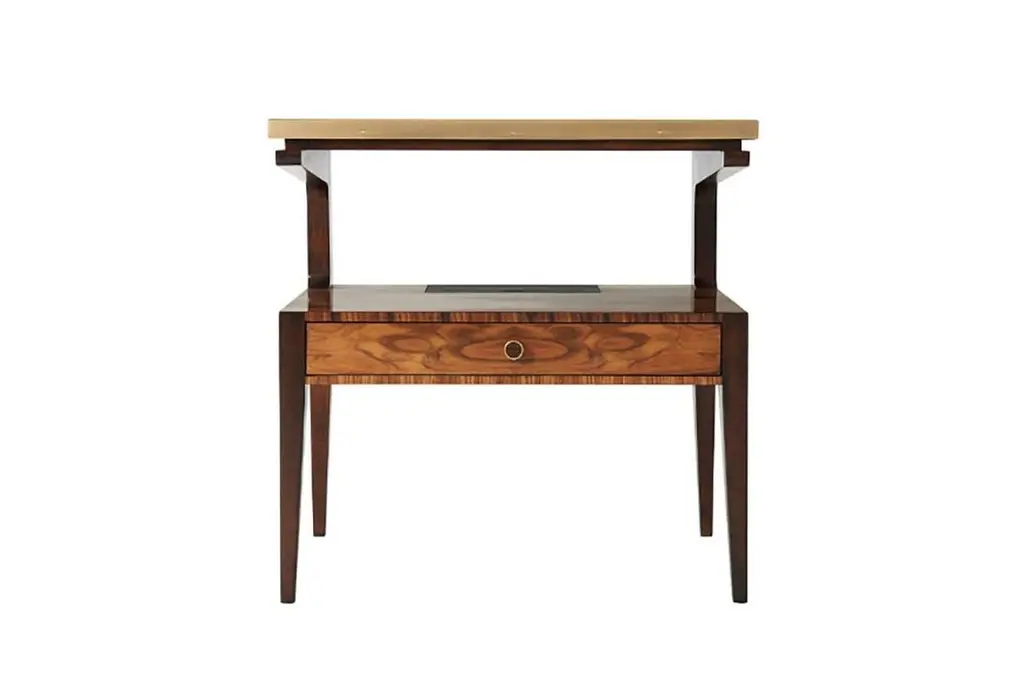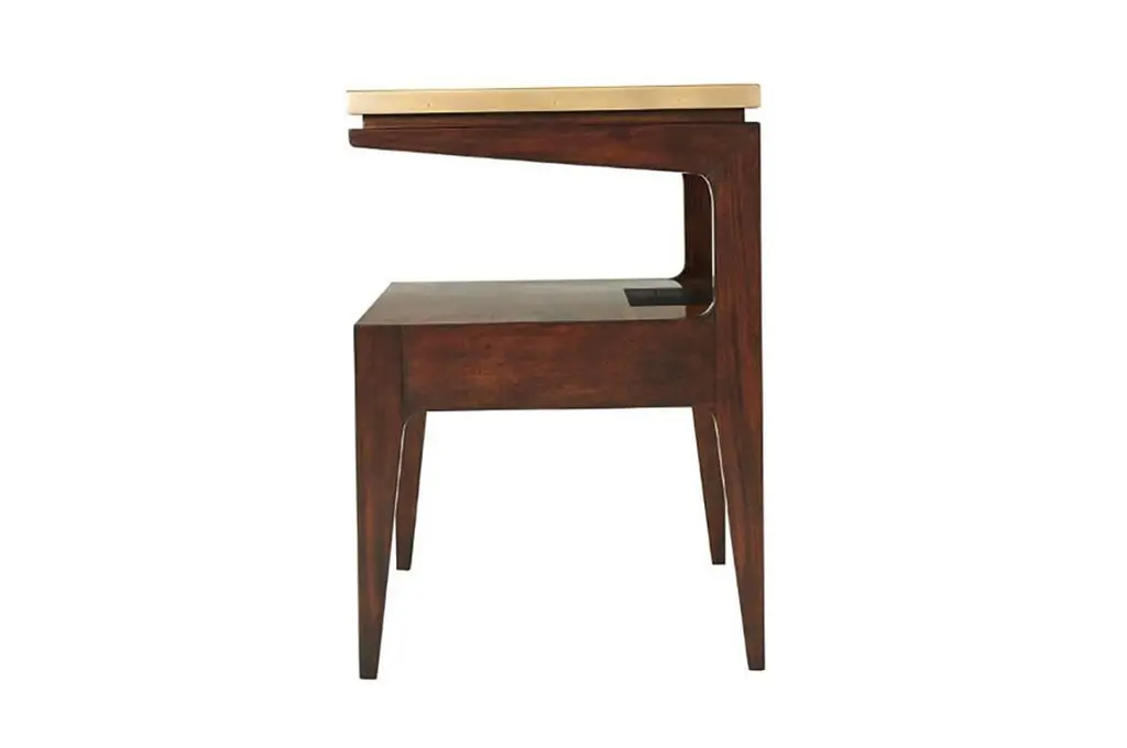 Mid Century bedside table with Wild Rosewood and Mahogany, two tiers and single long drawer, and a brass charging unit.Dimensions: 26" W x 18" D x 26" H