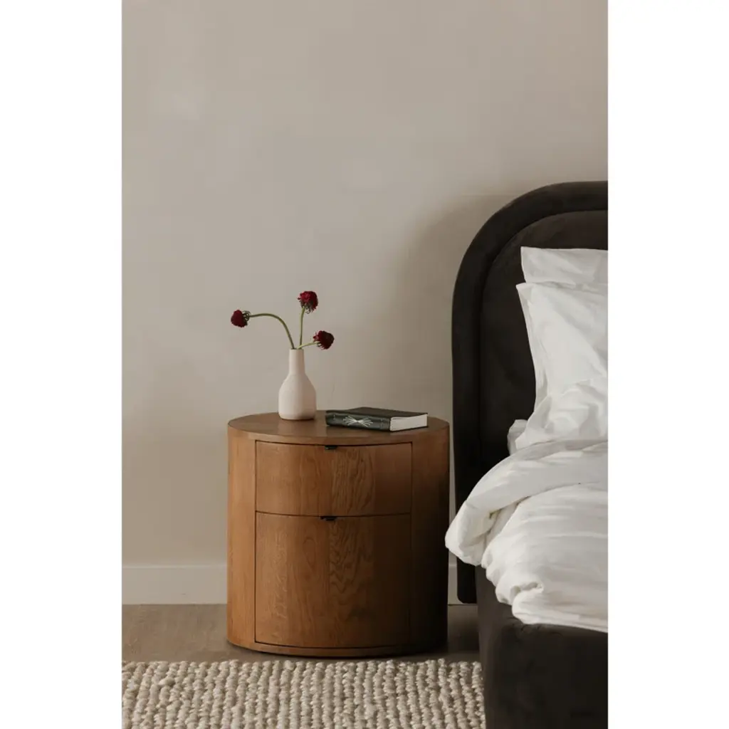 Made for the modern home, the Scandi-chic Theo nightstand has it all. Crafted from solid oak, Theo’s cylindrical silhouette and natural semi-gloss finish bring all the organic luxury to your bedroom. With two soft-close drawers, you’ll have more than enough storage space for all your bedside knickknacks, making Theo an essential bedside companion.