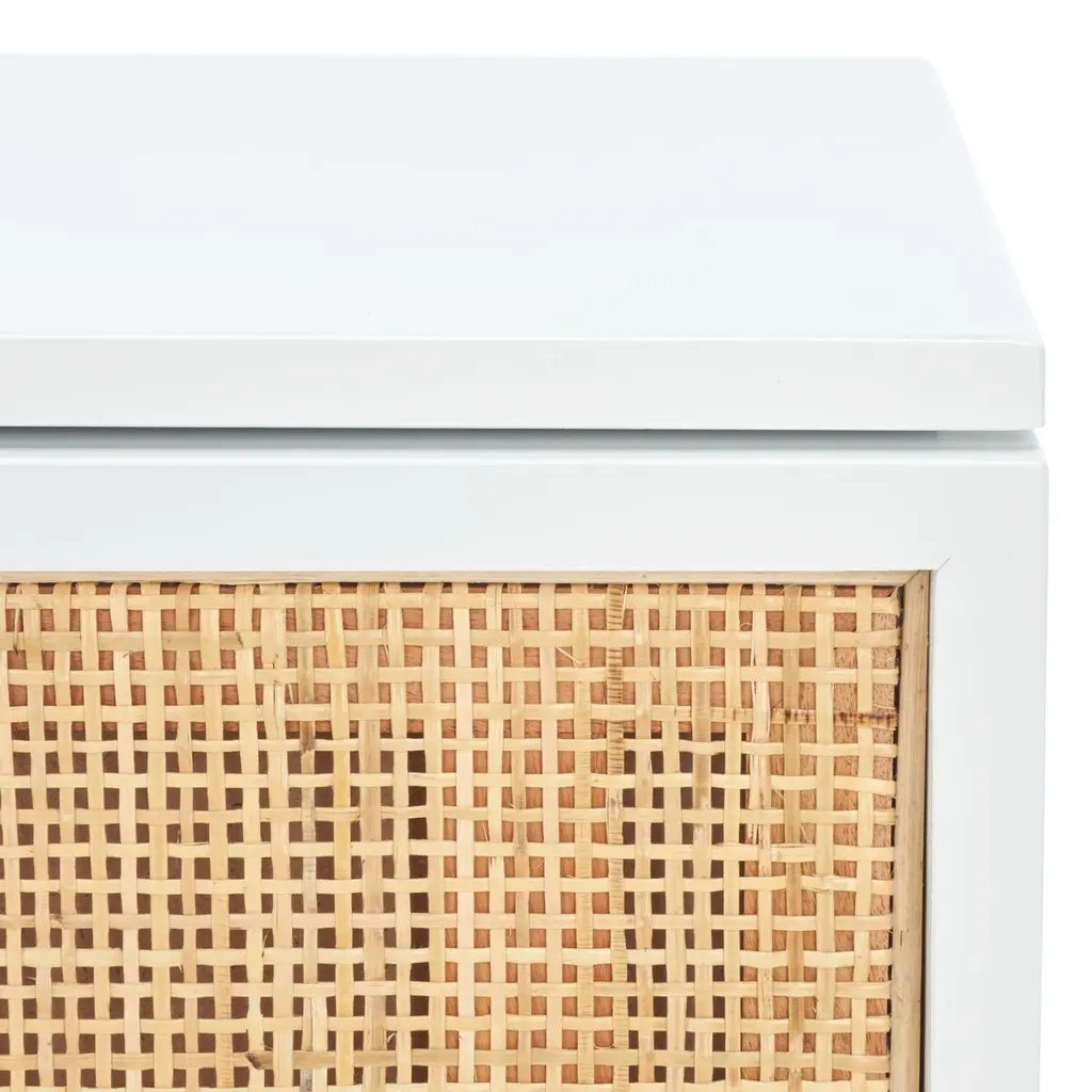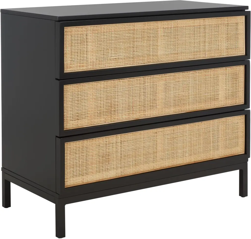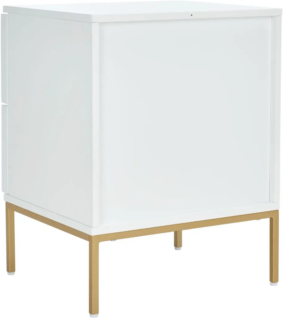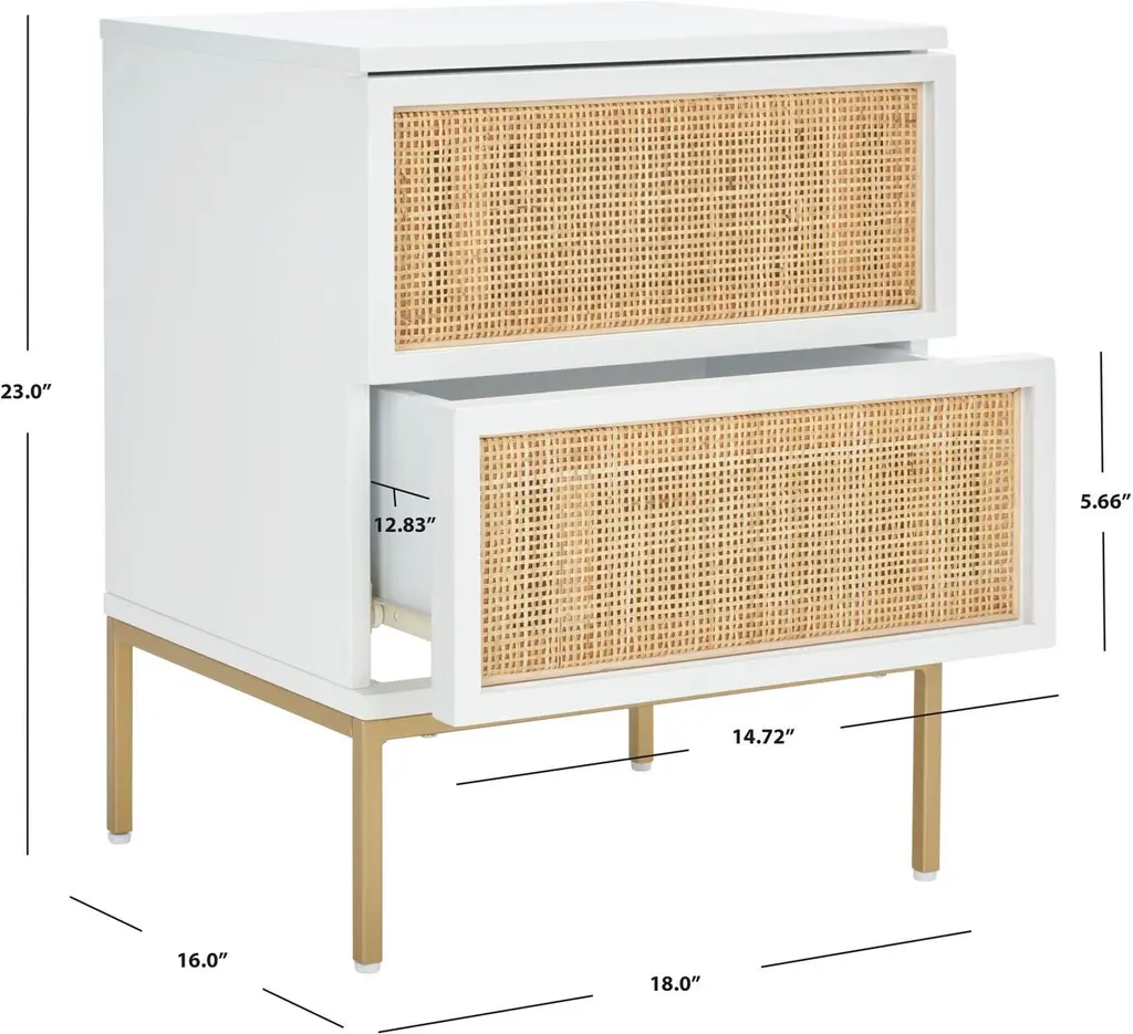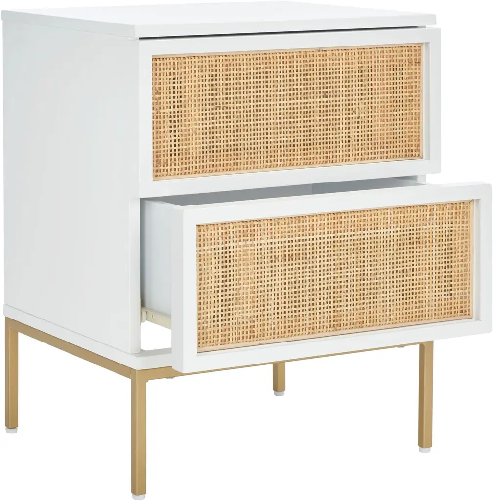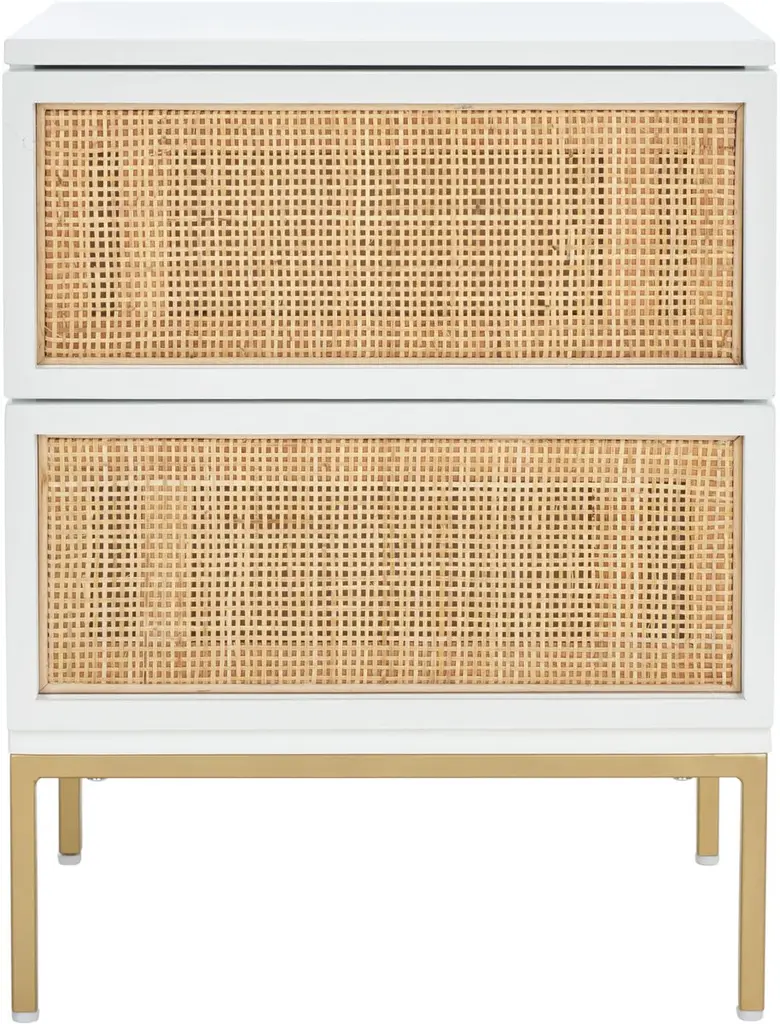 The woven rattan panels of this nightstand's two drawer fronts provide organic elegance and tropical breeziness. The metal legs or frame add a touch of glamour and contemporary flair, making it a versatile piece for any bedroom decor.