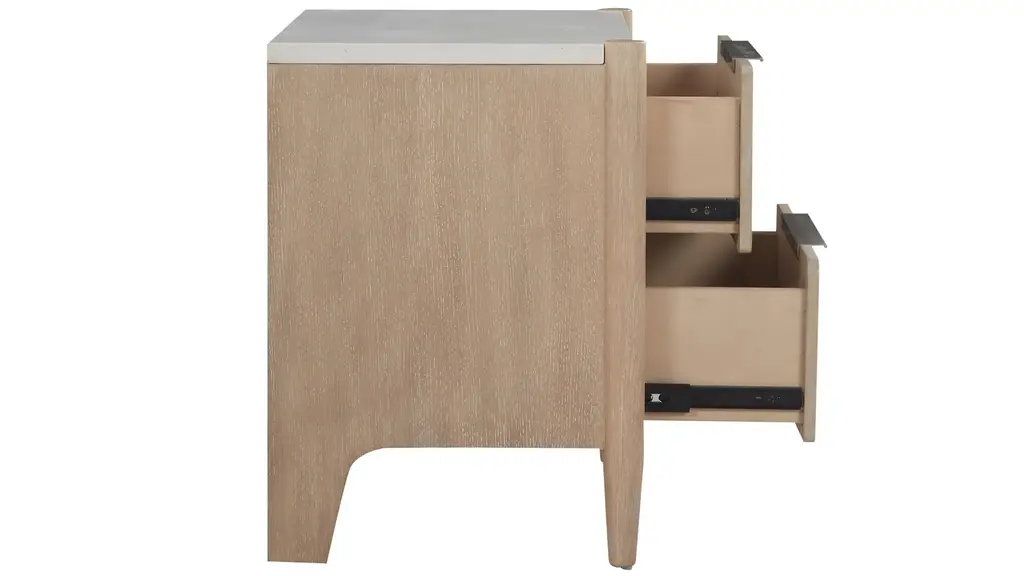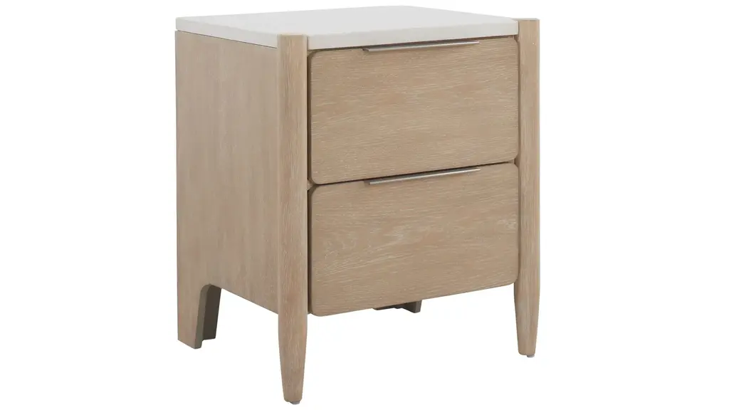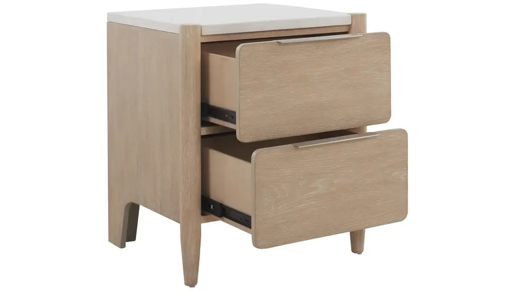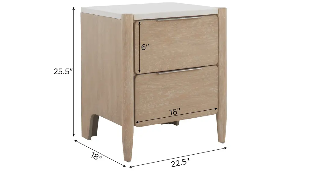 If an organized and sophisticated sleep oasis is on your wish list, the Mirra nightstand with marble top is here to check it off! This minimalist design is loaded with character and function, including USB charging and a cool, veined marble top. Rounded dowel posts strike a balance with sleek nickel hardware and the warmth of the wood.