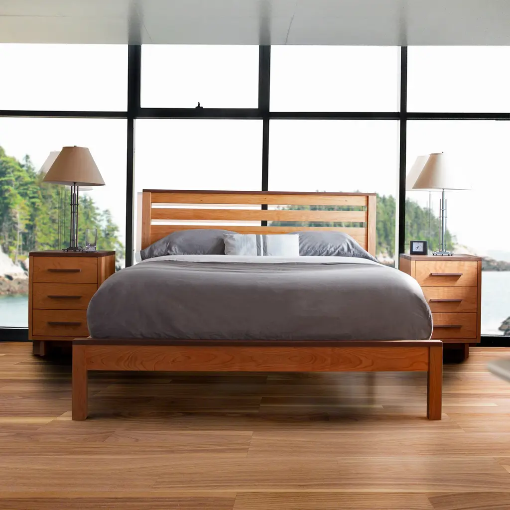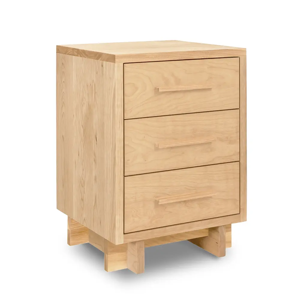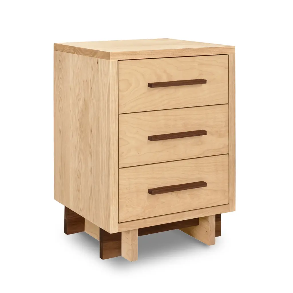 Our Arts and Crafts style Modern American 3-Drawer Nightstand features a wonderful contemporary flair with its modern black walnut accents. A perfect addition to your contemporary bedroom. Our luxury bedroom furniture is crafted in Vermont and built to last for generations. Made from natural, solid hardwoods with eco-friendly oil finish. Available in Cherry, Maple or Walnut woods.Base price represents nightstand in natural cherry with black walnut top and walnut accentsShown in natural cherry with black walnut top and walnut accentsMatching furniture available in our Modern American Furniture Collection