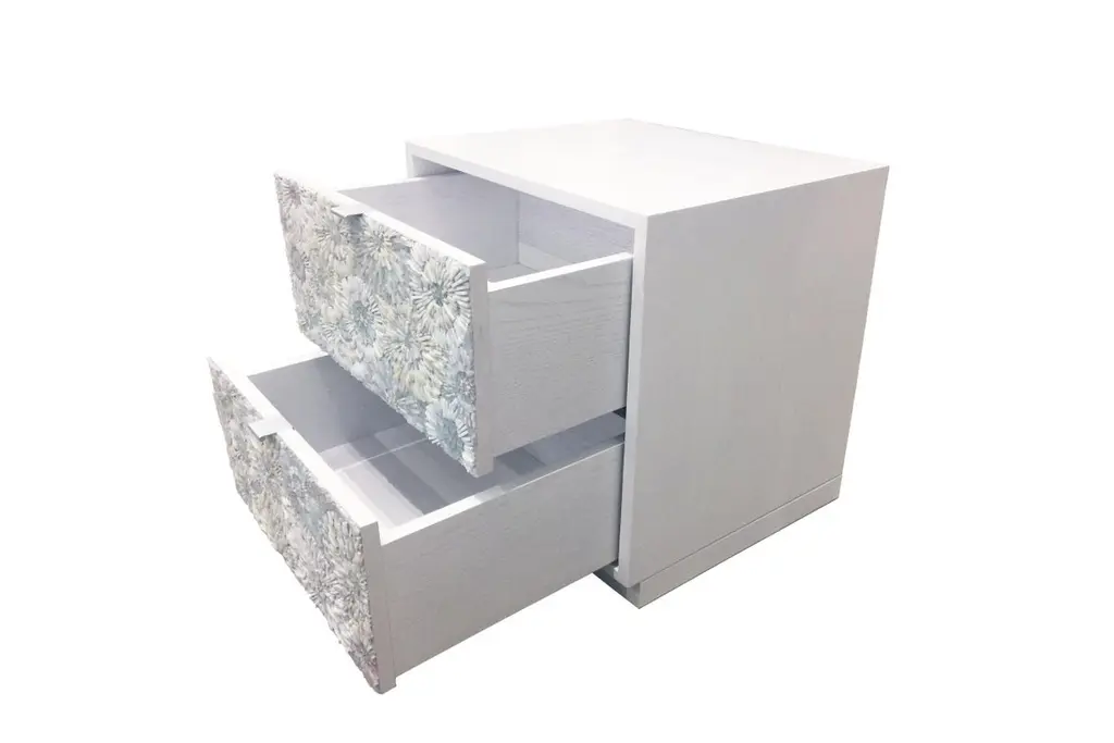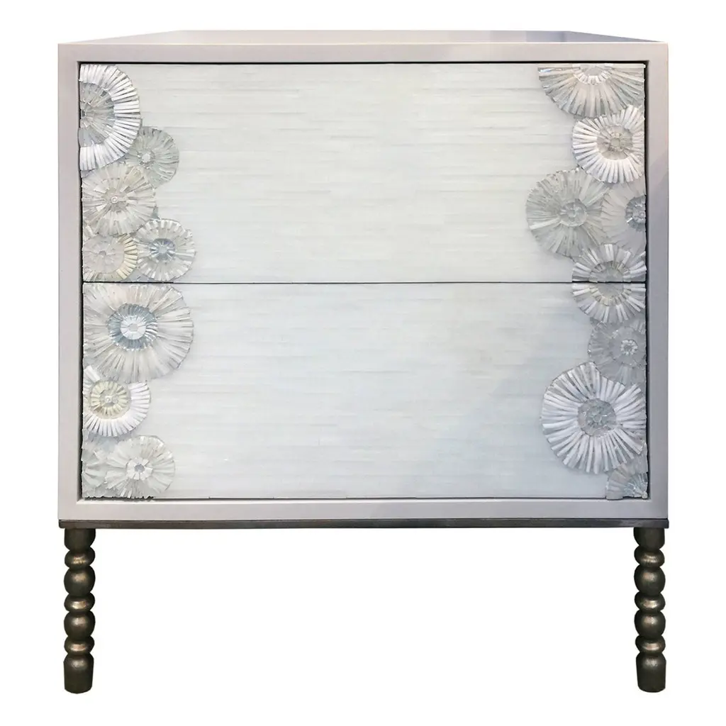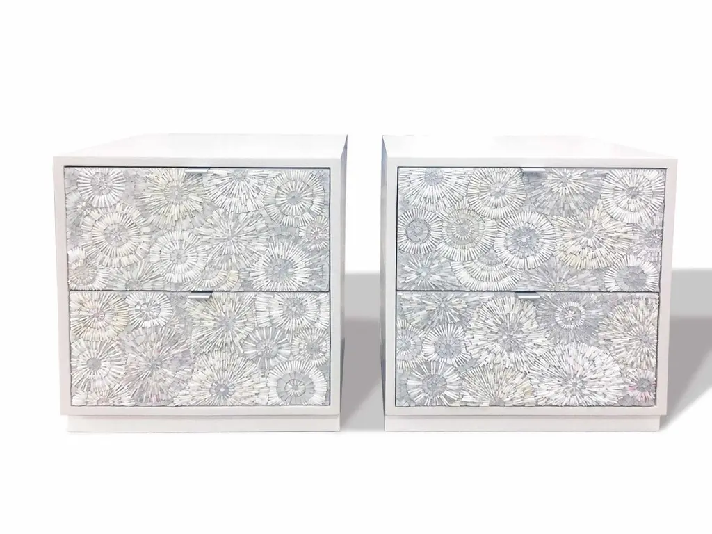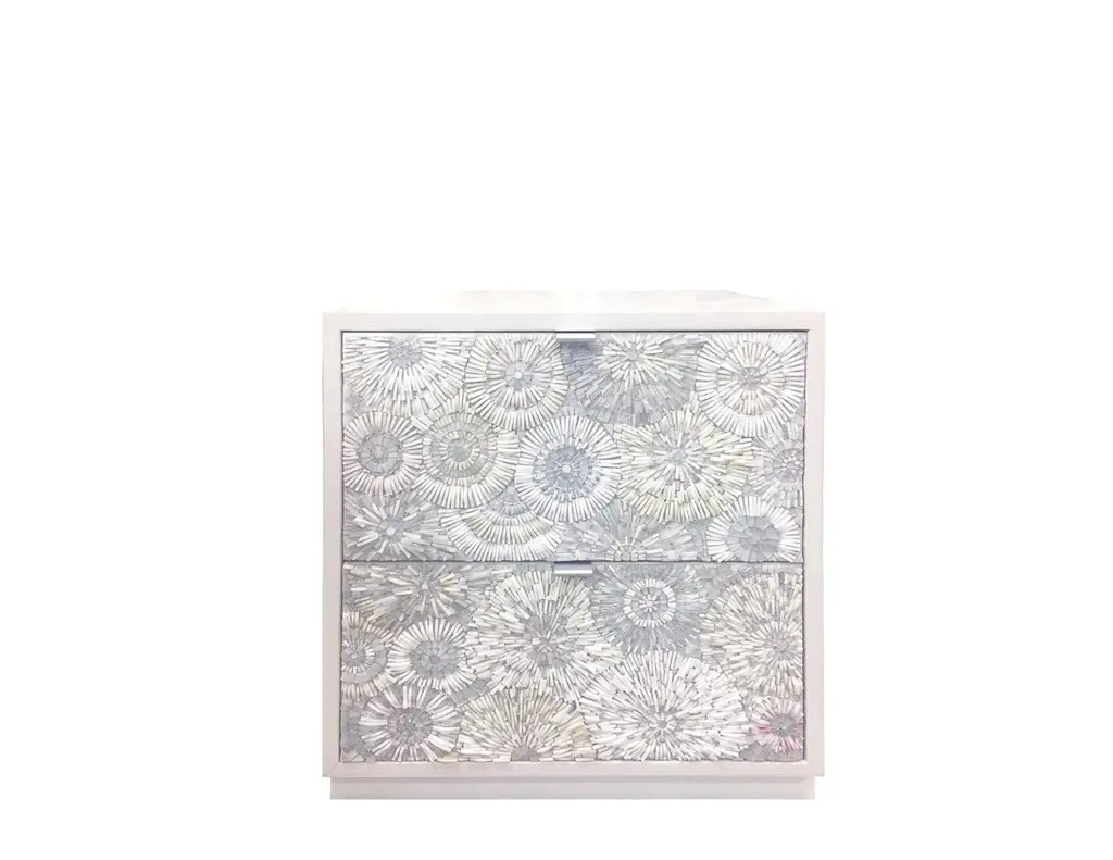 The Blossom 2-drawer Platform nightstand by Ercole Home is a two drawer bed side table, raised on a platform base. The case of this nightstand is has a Painted White finish on Oak, and the drawers are adorned in our hand-cut blossom mosaic with glass in a mix of white tones.