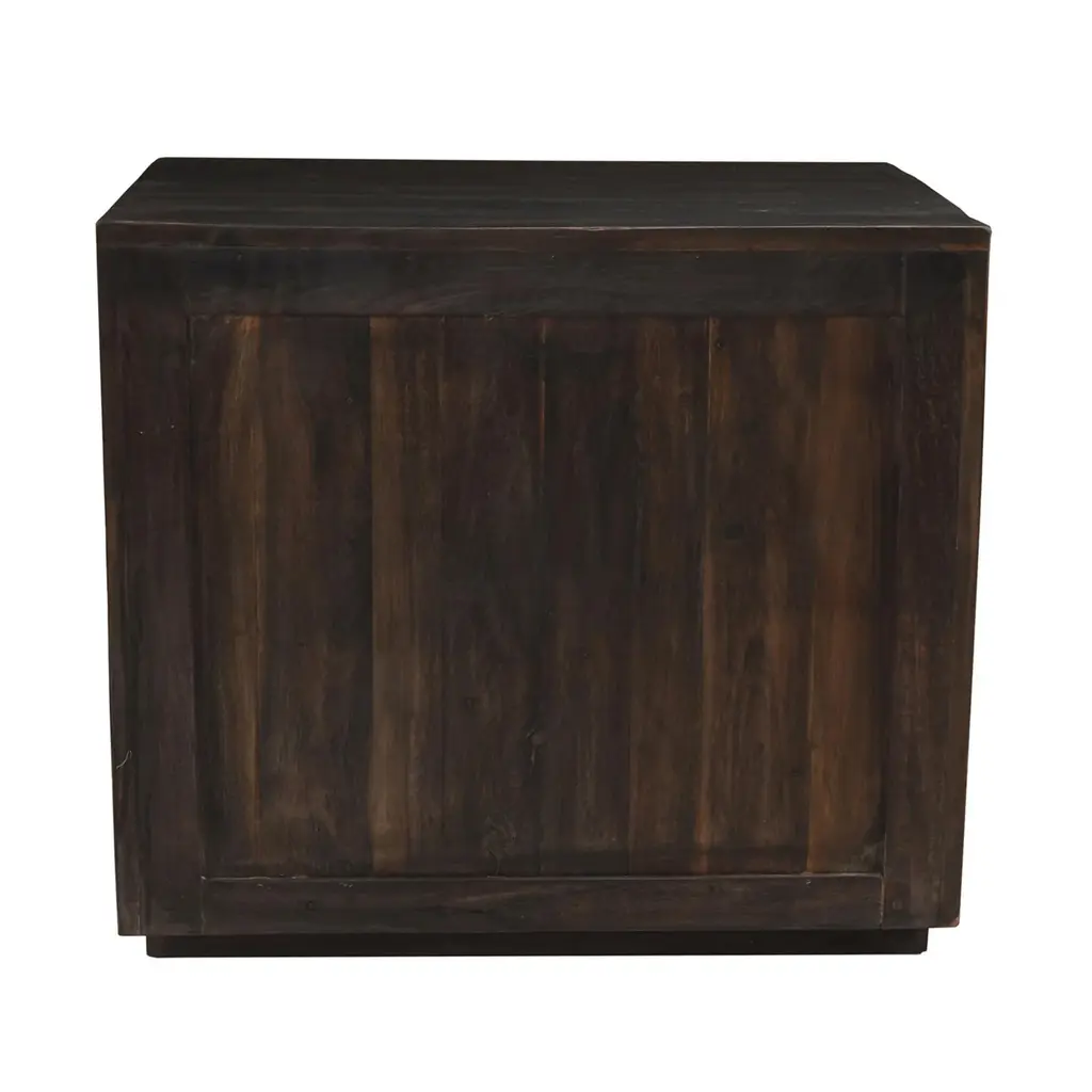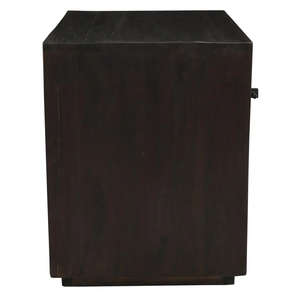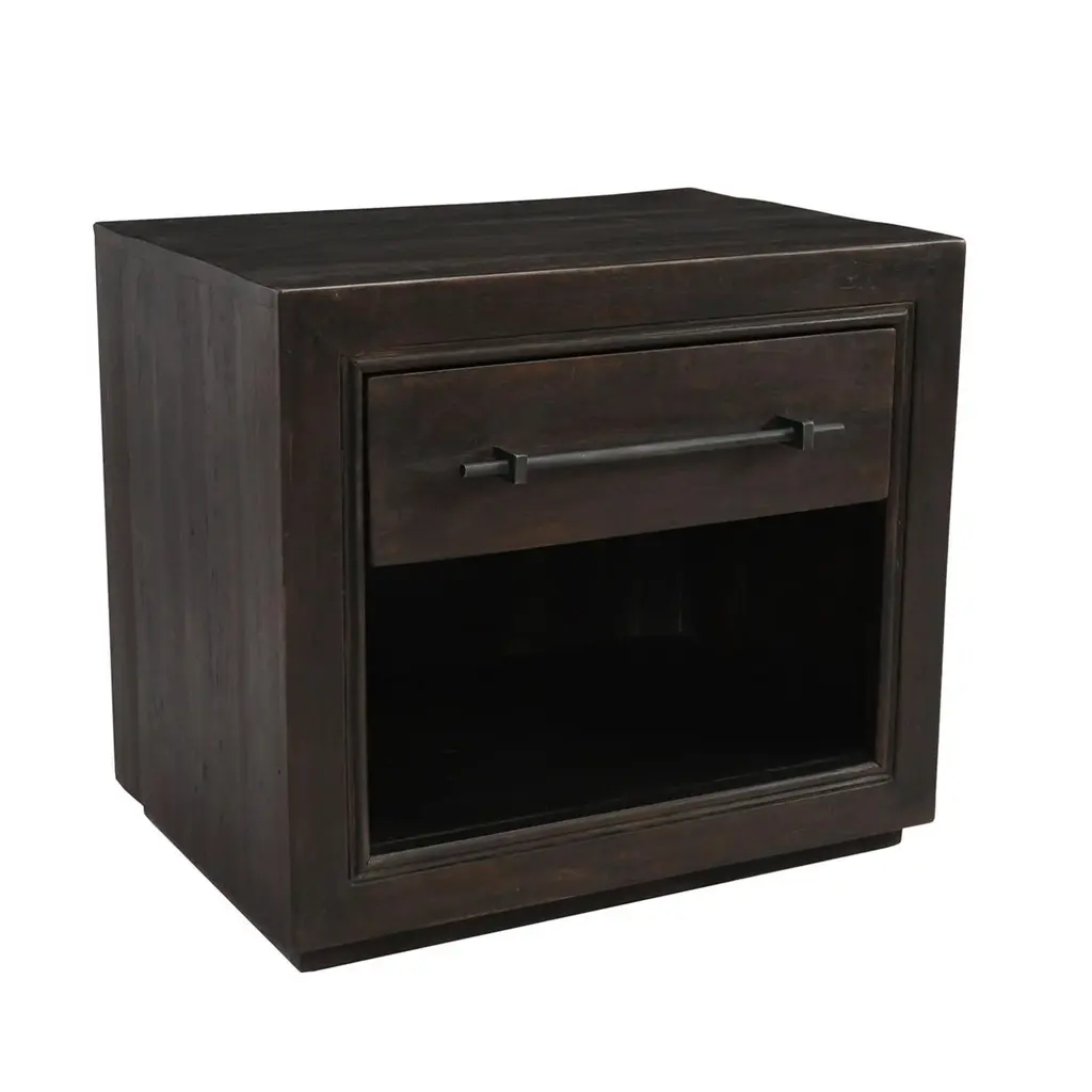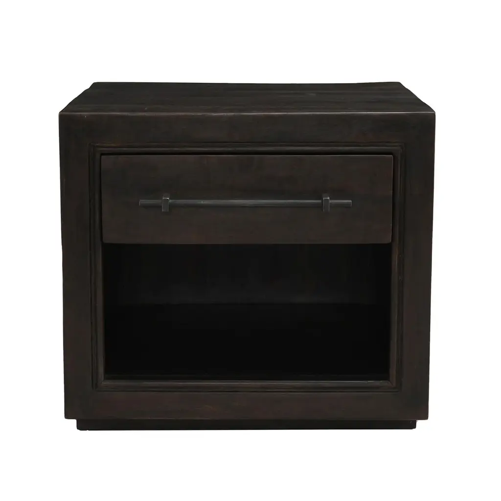Modern rich dark espresso finish mango wood nightstand. Features one drawer with cast iron pull and shelving area below. Hand distressed finish. Each may have unique qualities of exact tones, grain, and natural imperfections. This piece weighs approx. 60 lbs.