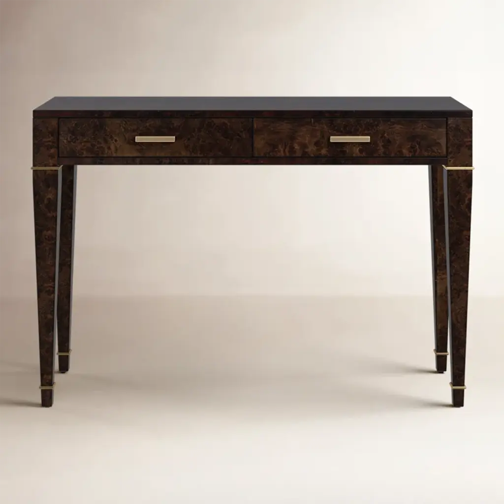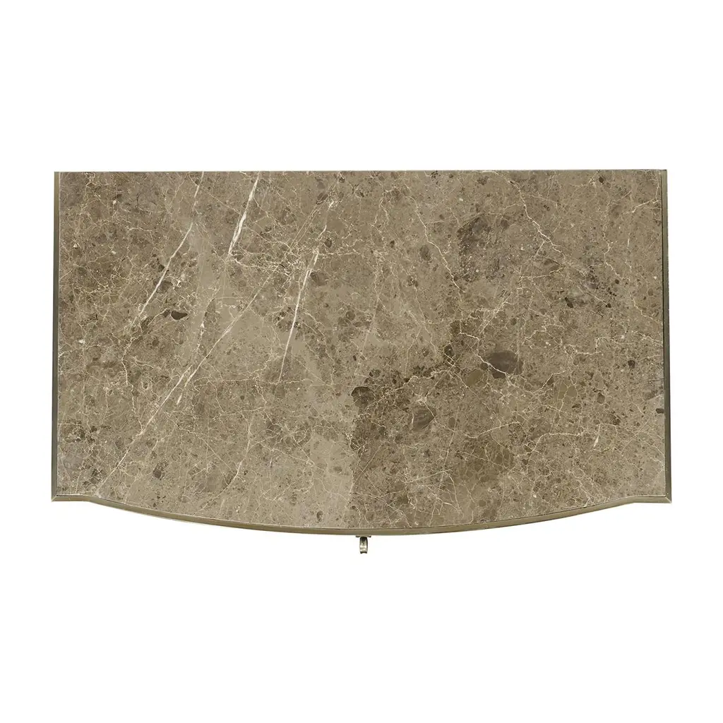 Modern French marble top walnut Nightstands, features figured Spanish marble. Drawer fronts feature walnut swirl veneer with a transparent, low luster finish. Hardware is cast in our foundry and finished in a light champagne patina.Dimensions: 32" W x 19.75" D x 28" H..