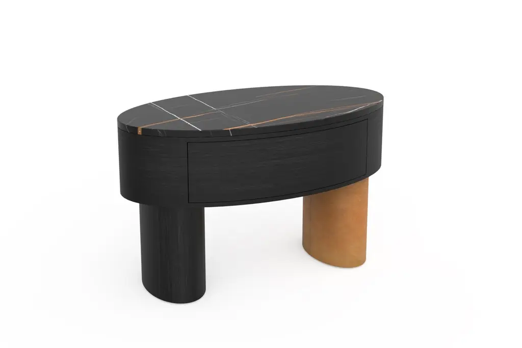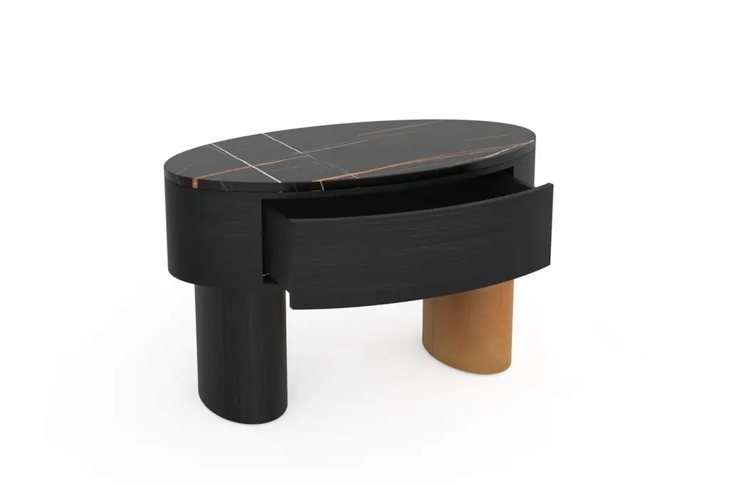 Lindoso Bedside Table, Modern Collection, Handcrafted in Portugal - Europe by GF Modern.The Lindoso bedside table draws its name and inspiration from the village of Lindoso. Its subtle yet modern design, crafted from premium materials, elevates the Lindoso bedside table to an exquisite furniture piece distinguished by exceptional craftsmanship. The elegant legs, crafted in American oak and caramel leather, are further accentuated by the captivating allure of the Sahara Noir marble surface.Lindoso Bedside Table Material CodesWD107 American Oak; open-pore black stained; matt finishST041 Sahara Noir marble; polishedM103585 Caramel premium Italian leatherHandcrafted in Portugal - Europe by GreenappleUnique by design, Crafted by peopleFounded in 2005 by Sérgio Rebola and Rute Martins, Greenapple designs and produces in-house luxury furniture for exclusive customers worldwide.Our own in-house production facility allows us to be obsessed with detail, and gives us the freedom to dedicate ourselves to the most demanding tailor-made and customized work. As Rute designs all the unique pieces, Sérgio assures the high-quality standards through the whole process - from design to production; from production to your home. Fine craftsmanship, whether perfected by experienced hands or state-of-the-art machinery is quintessential in delivering top quality experiences.