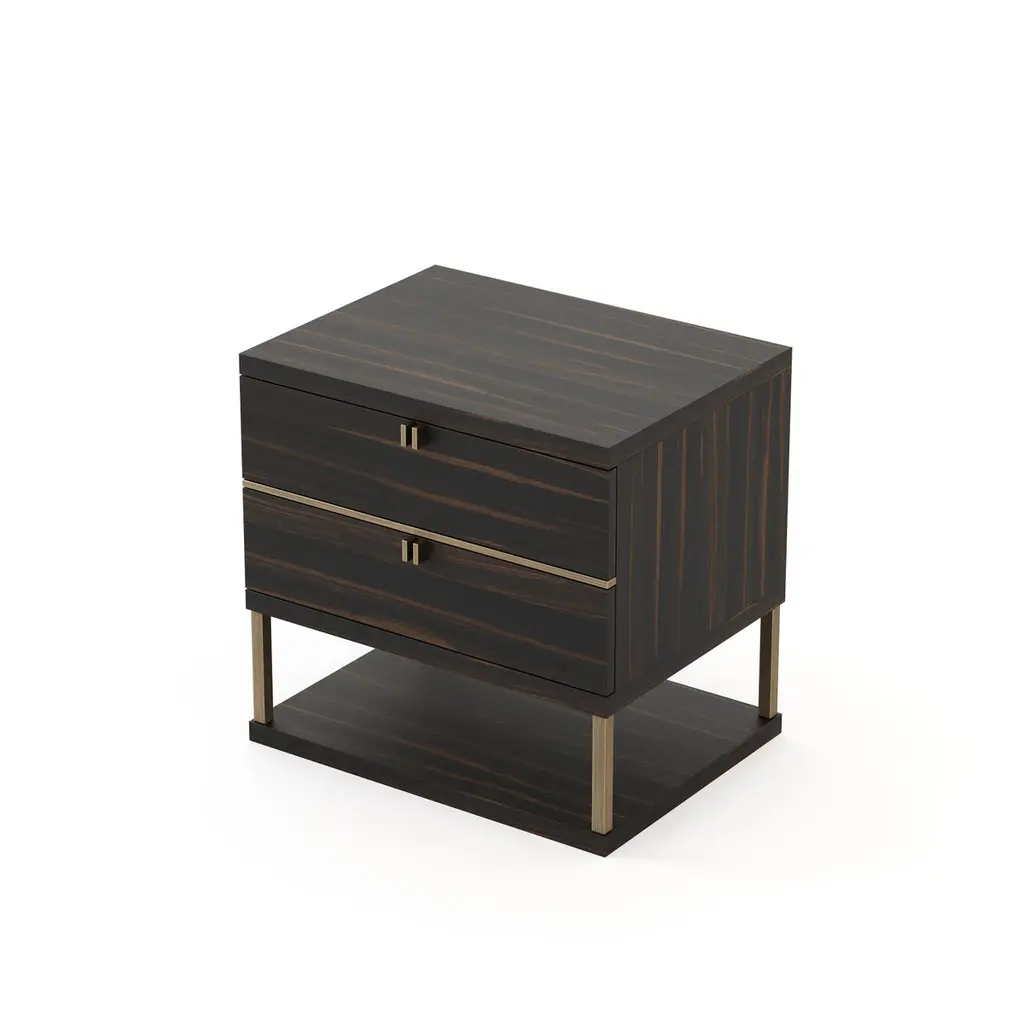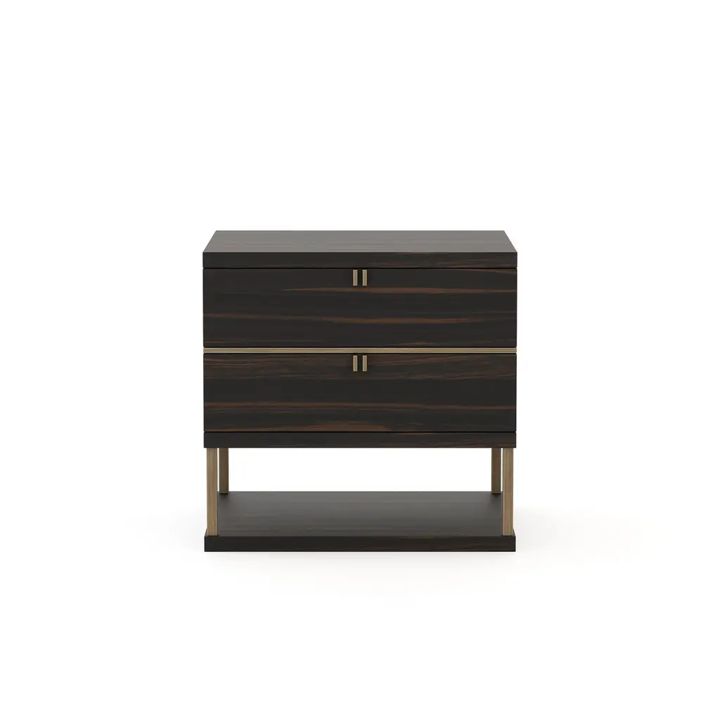 The Manhattan collection presents itself with a straight and rhythmic silhouette on both horizontal and vertical lines, invoking the constructions in height, provided by the technical/technological developments of modern architecture. The Manhattan night table has a simple design that can be combined with more industrial or modern spaces. It has two drawers for additional storage. Sophisticated finishes and luxury details give elegance to the piece. Combine it with pieces from the same range, making your bedroom a cosy yet sophisticated space. The Manhattan collection is inspired by a famous New York "Neighborhood". This area is characterized by the urban and cosmopolitan lifestyle combined with modernity and sophistication. In mate walnut wood, the Manhattan night table features a solid structure and a firm look. A versatile piece that matches easily with any decor style.As the product can be personalised, the image of the presentation is merely illustrative.NotesLacquered metal or other metals - Price on requestPossibility of marble and glass tops - Price on request.