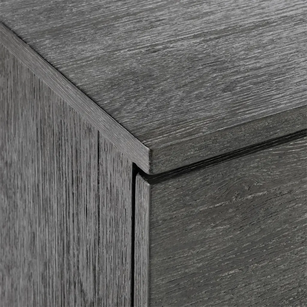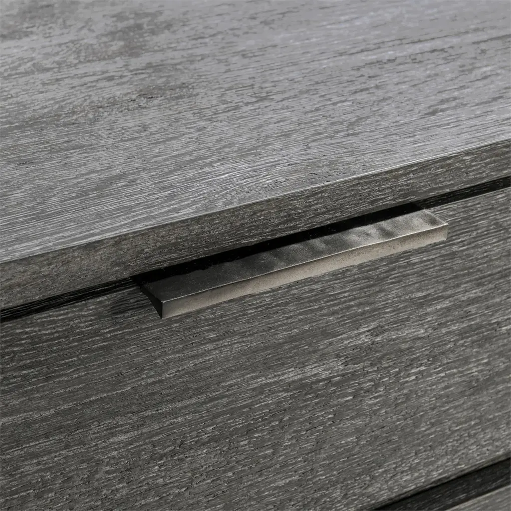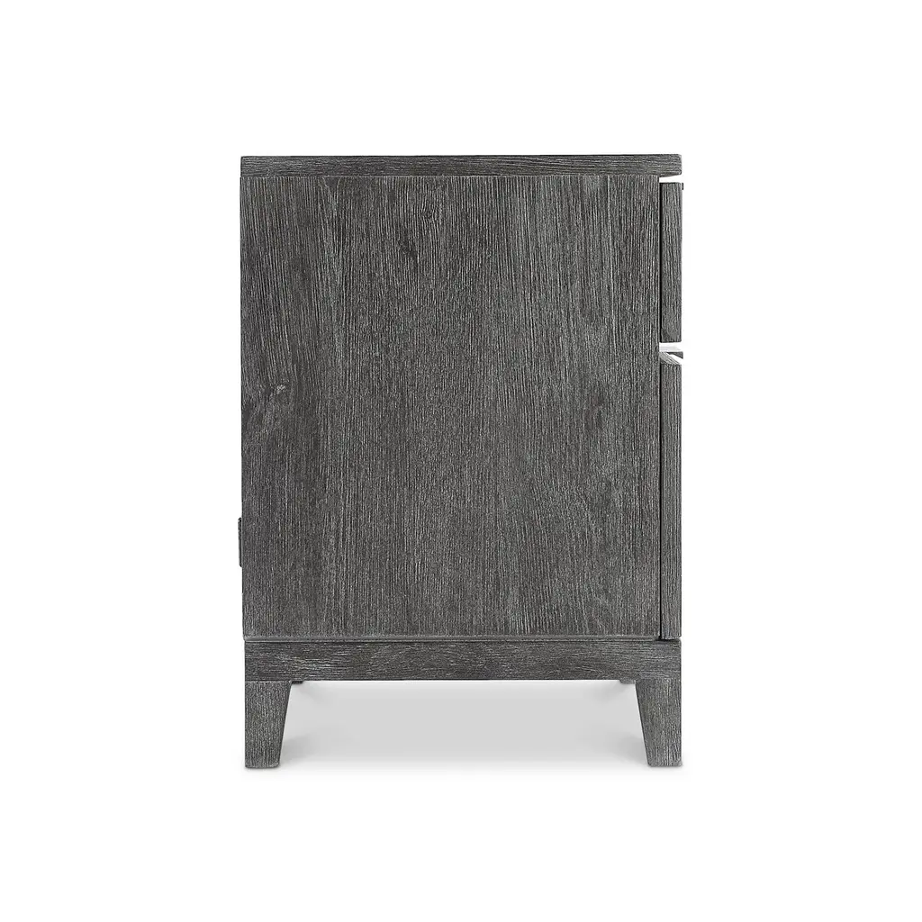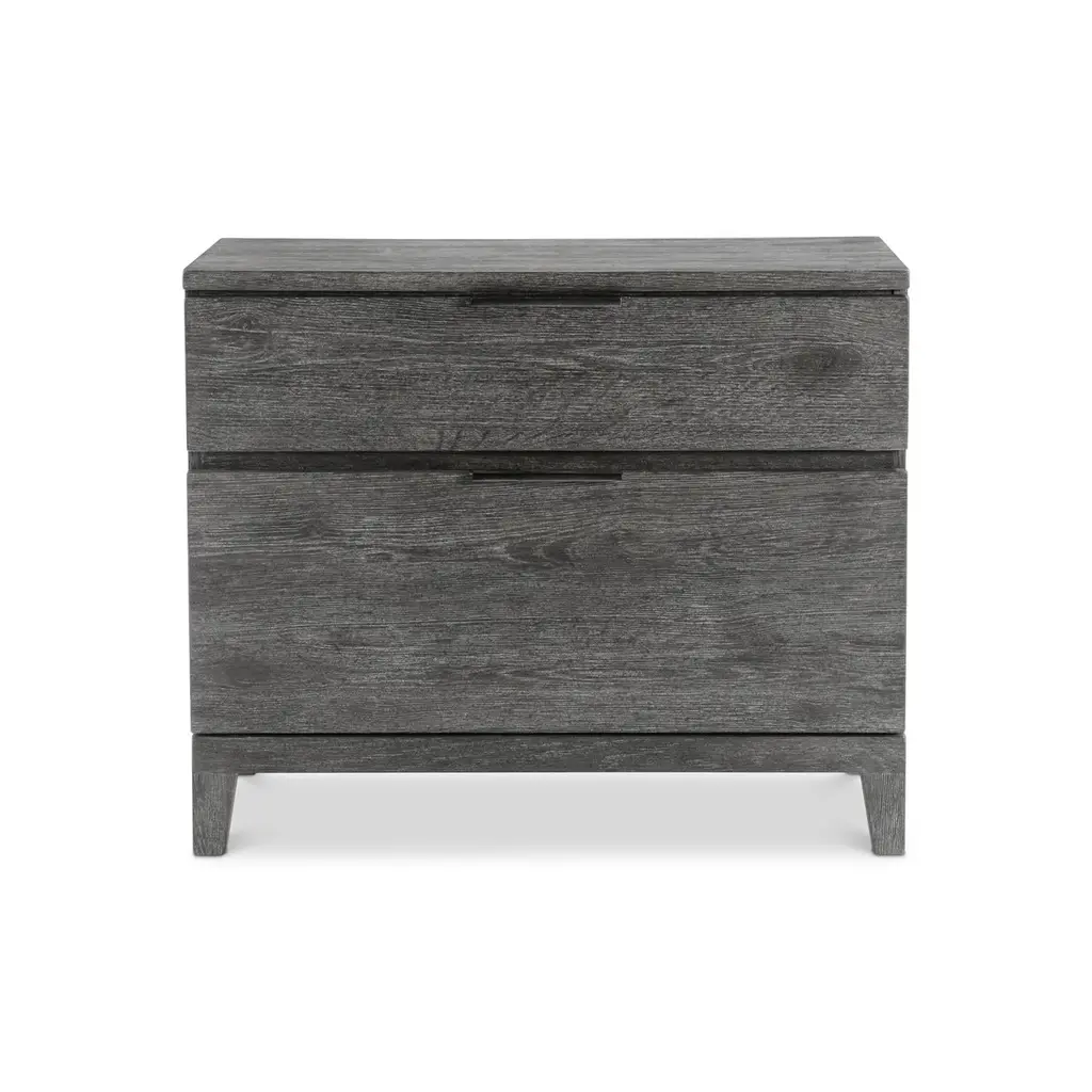 The Menton nightstand updates a traditional design with an earthy Sutton finish, highlighting the beautiful woodgrain. Two pull-to-open drawers have cast aluminum tab pulls, and the back offers a two-port A+C USB charging unit. The case rests on a base with four slightly curved legs for a casually sophisticated style.