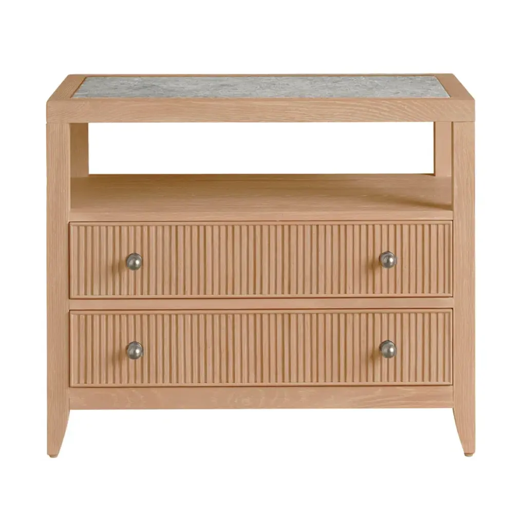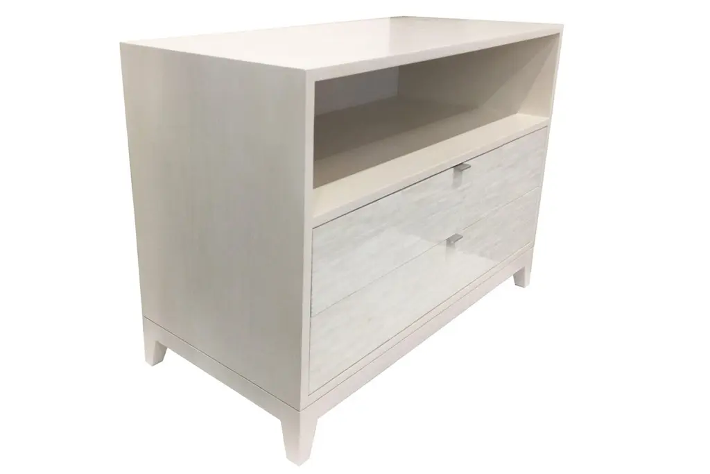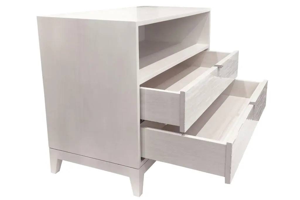 The Milano nightstand by Ercole Home has a 2-drawer front and open shelf, with Washed Ivory wood finish on oak. Hand cut glass mosaics in Ivory decorate the surface in a horizontal regular stripe pattern. There are two brushed aluminum pulls.Custom sizes and finishes are available. You can add drawers and compartments in varying sizes to the interior as well.Made in New York City.