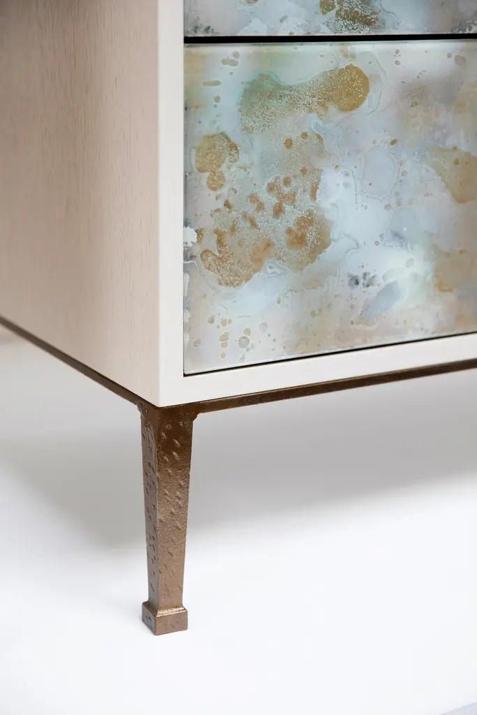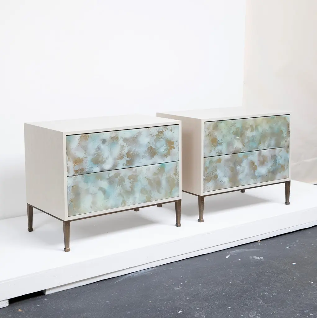 The Modern Milano Metal Two-Drawer Eglomise Nightstands feature two touch-latch drawers with fronts of hand-painted Mare/Celadon Eglomise, in a Rift Oak case with custom painted finish, and raised about Milano metal legs with an Antique Brass Patina. Custom sizes and finishes available. Made in Brooklyn.