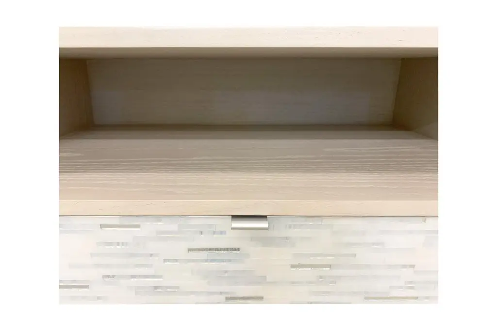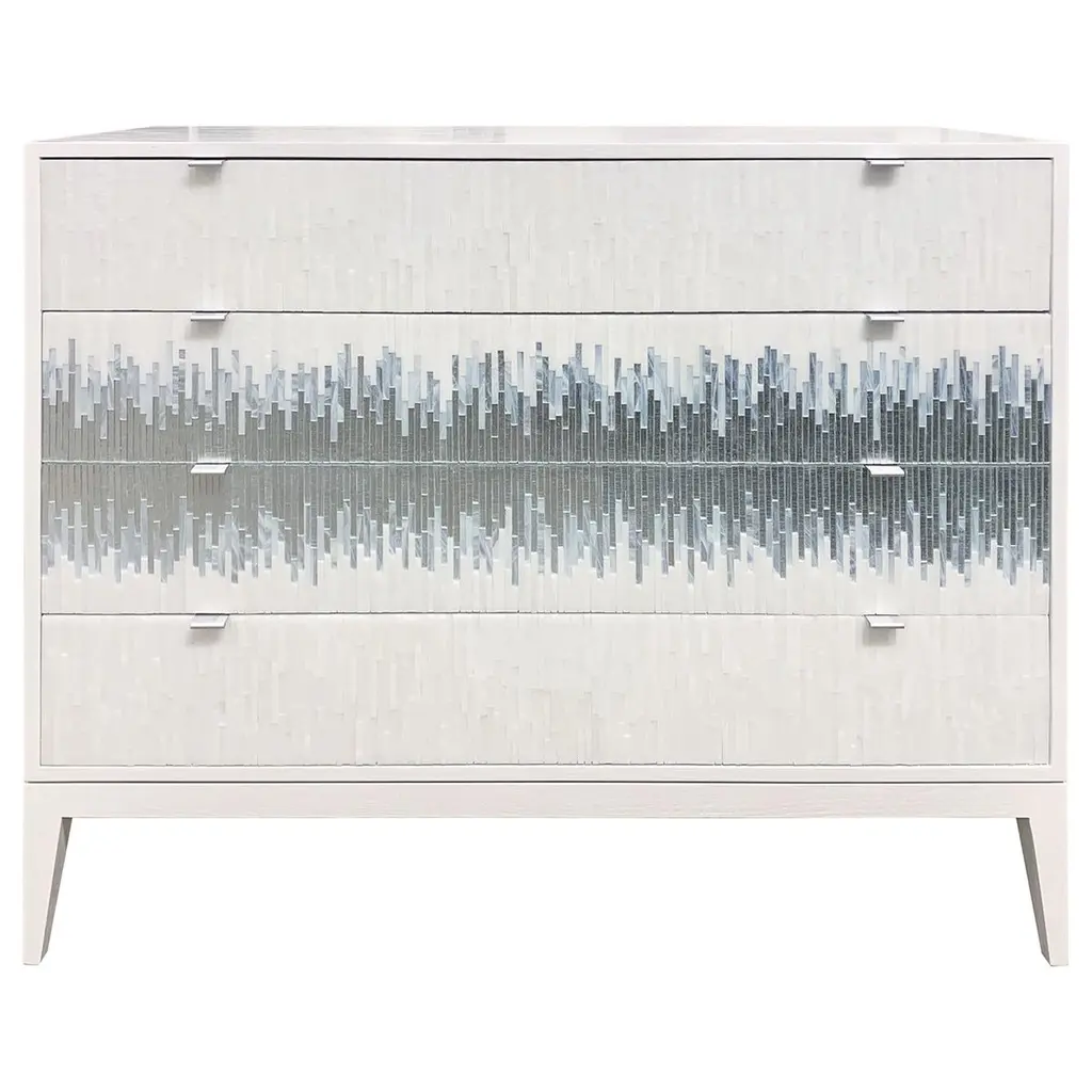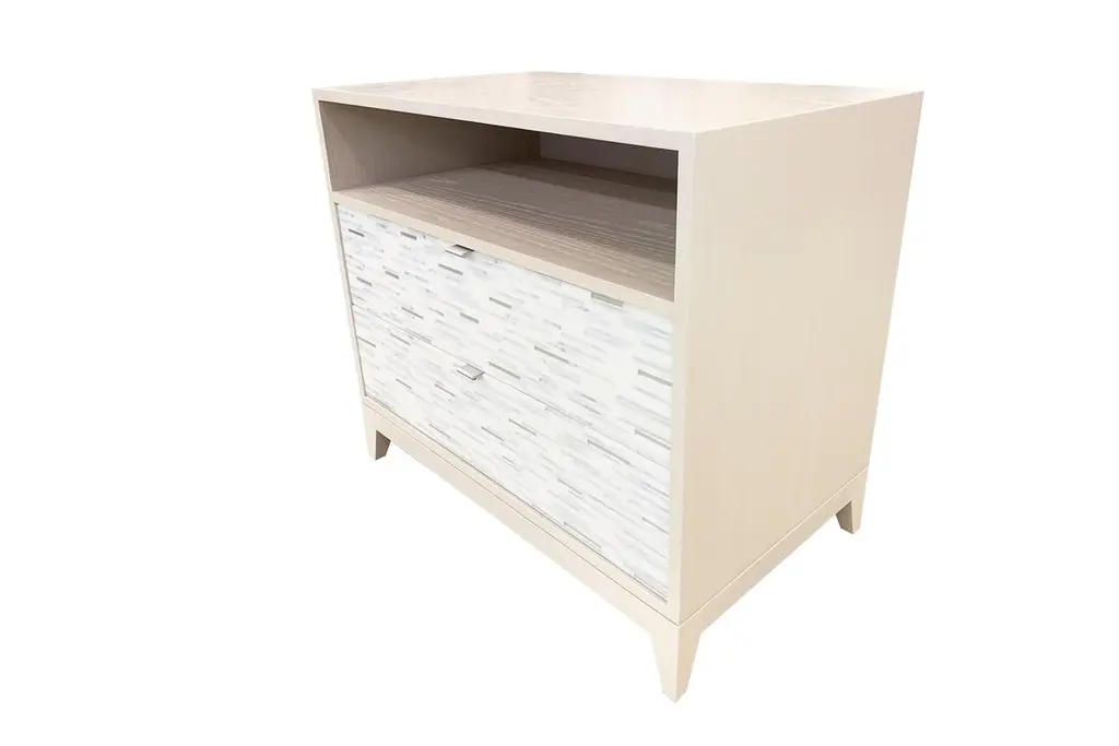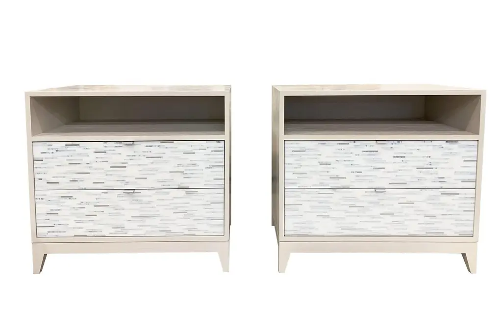 The Milano nightstand by Ercole Home has a 2-drawer front and open shelf, with washed ivory wood finish on oak. Handcut glass mosaics in icy white, wispy white, and silver decorate the surface in a horizontal regular stripe pattern. There are two brushed aluminum pulls.Custom sizes and finishes are available. You can add drawers and compartments in varying sizes to the interior as well.Made in New York City.