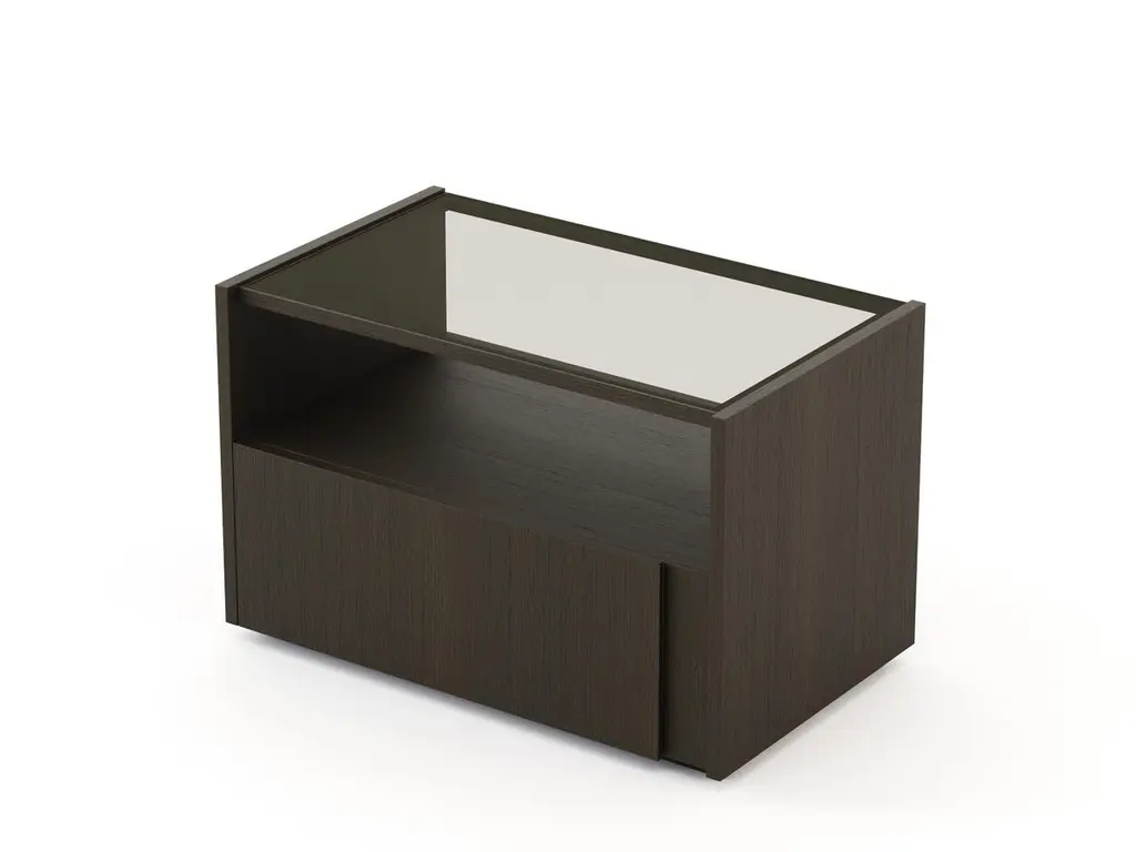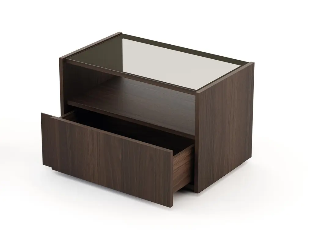 Measurement UnitsLarge - D 45 x W 75 x H 48 cm Small - D 45 x W 56 x H 48 cmA minimalist collection that reveals the importance of incredible design combined with the best materials, the Seville collection offers functionality, magnificent designs and distinctive materials so that the pieces are the ultimate result of precision and pride.The Sevilha night table is a functional piece that charms with its simplicity and elegance. It features one drawer offering plenty of storage. A piece of furniture in warm tones and luxurious finishes that fits in with any bedroom decor. In a mate walnut structure, the Sevilha night table offers all the organization you need in your daily routine. A piece designed to give you an incredible functionality in your bedroom. The bronze glass of the Sevilha night table brings to this piece an extraordinary practicality. The connection between wood and glass creates a luxurious and unique dynamism to any bedroom.As the product can be personalised, the image of the presentation is merely illustrative.NotesPossibility of marble and glass tops - Price on requestPrice is given including top with clear glass or bronze mirror.