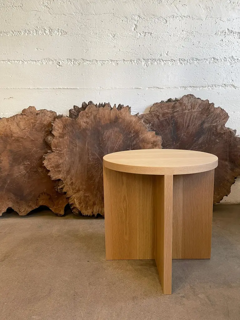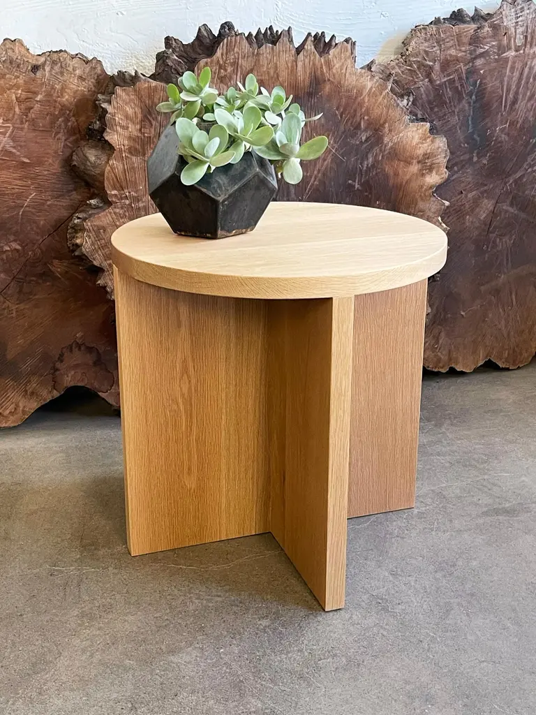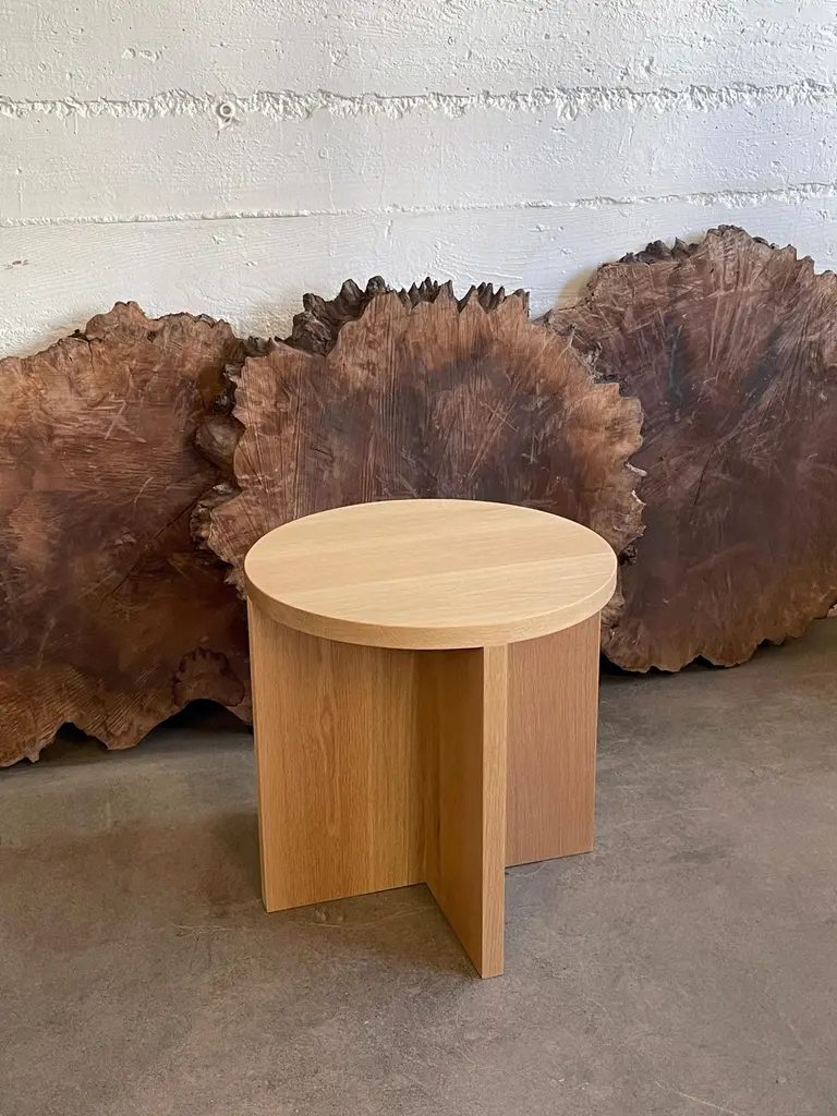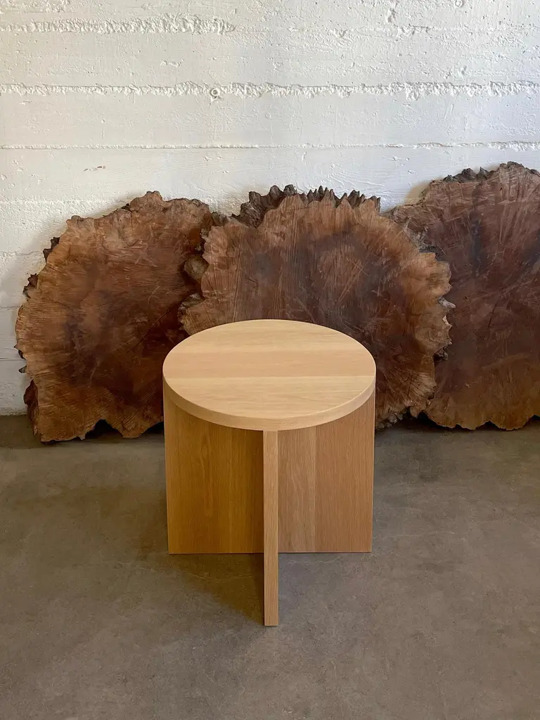 Solid oak side table in white oak with round top measuring 21" diameter and 21" tall. Also works great as a nightstand. With a clean and minimal design, these stools are handmade in Material's workshop in Portland, Oregon with mortise and tenon joinery in Material's workshop. Also available with a square top, in a number of wood species.This piece is customizable, if you have preferred dimensions, just let us know, we are here to help!