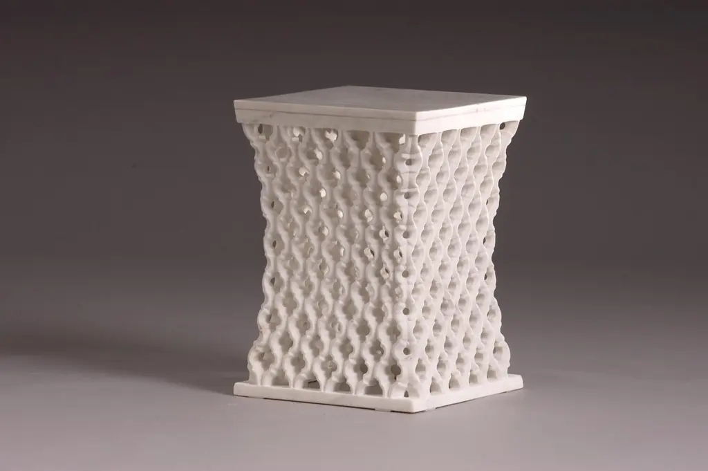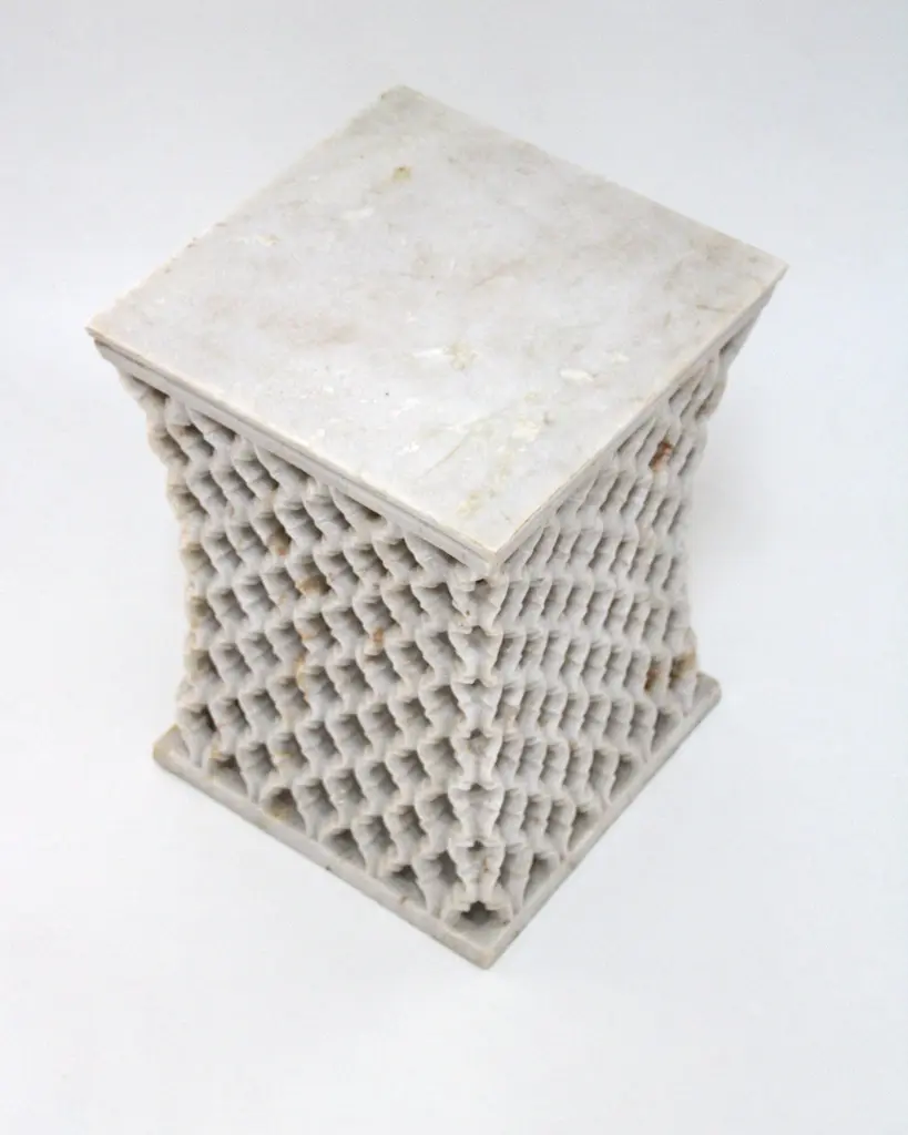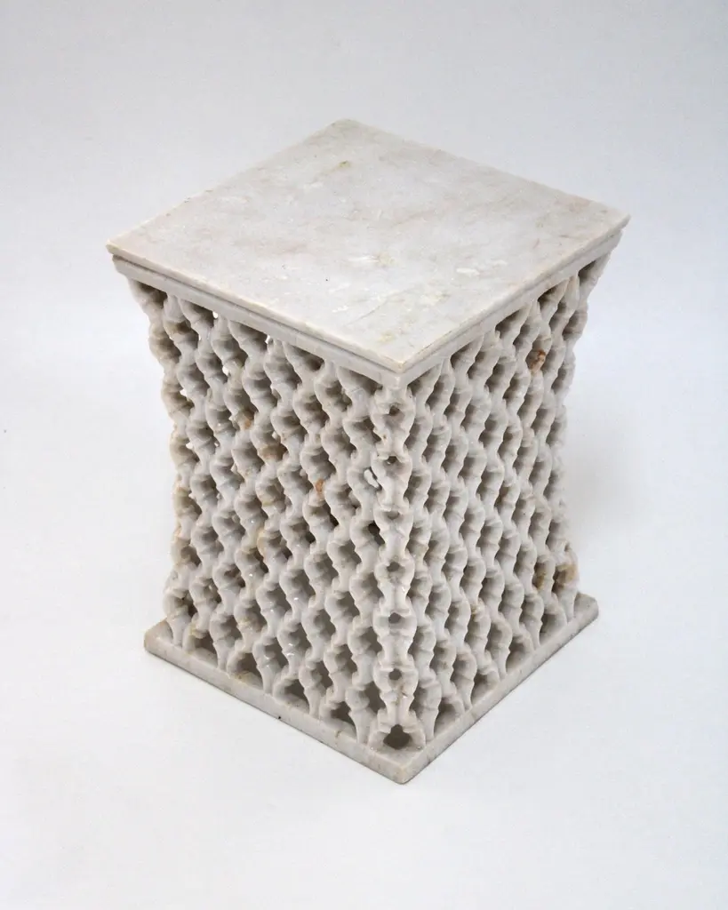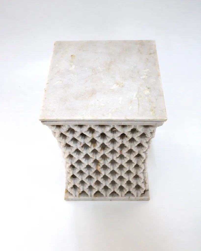 Modern marble side table or bedside tables by Paul Mathieu for Stephanie Odegard are inspired by the elegant pierced marble “Jali” screens and windows he saw in the palaces of Mughal India. These bedside tables or this marble side table is a true piece of art and is hand-made or hand-carved in white colour which also looks modern and contemporary. The renowned designer Paul Mathieu has created a unique collection of hand-carved marble side tables and bedside tables.These marble side tables or bedside tables are handcrafted and hand-carved with great precision by our professional artists, designers, carpenters and craftsmen. Every piece is hand-crafted with precision by our professionals. This marble side table sits like a charm in every environment which also looks modern and contemporary. Every piece of marble is hand-picked by our professionals for this hand-carved marble side table.Marble side table manufacturing process: Solid blocks of marble are hollowed out and hand-carved into low elegant tables through which light and air pass with ease. The intricate "Jali" patterns are first traced onto the surface of the stone. Craftsmen then hand chisel and form hundreds of intricate, interlocking patterns in each piece before the marble side table is polished by hand.Hand-Carved White Marble Side Tables by Paul Mathieu for Stephanie OdegardSize: 12" (L) x 12" (B) x 18" (H)Materials: white marbleTechniques: handmade, hand-carved and semi matt polished.Categories: Side tables, bedside tables, tables, marble tables, modern tables, hand-carved tables, hand-made tables, bed side tables, contemporary marble side tables, furniture, marble furniture, living room furniture, out-door furniture, marble furniture.
