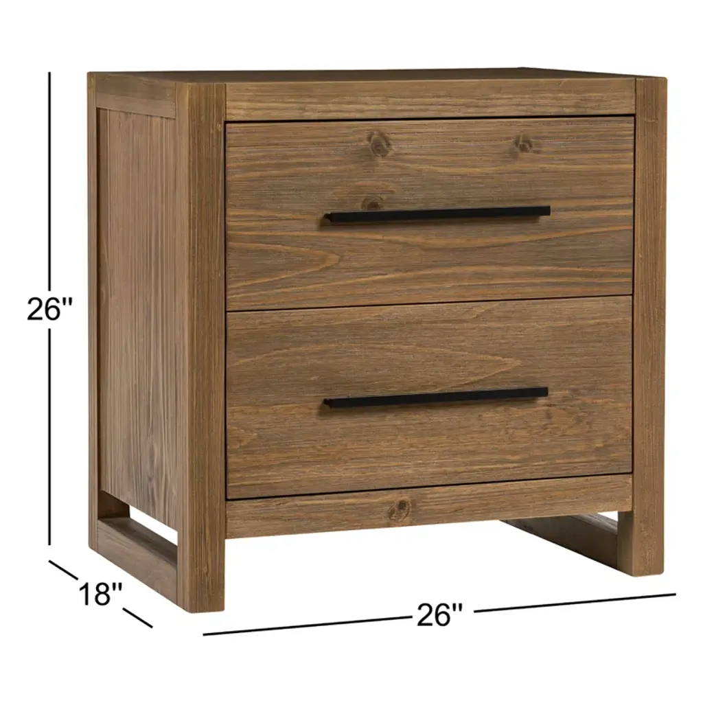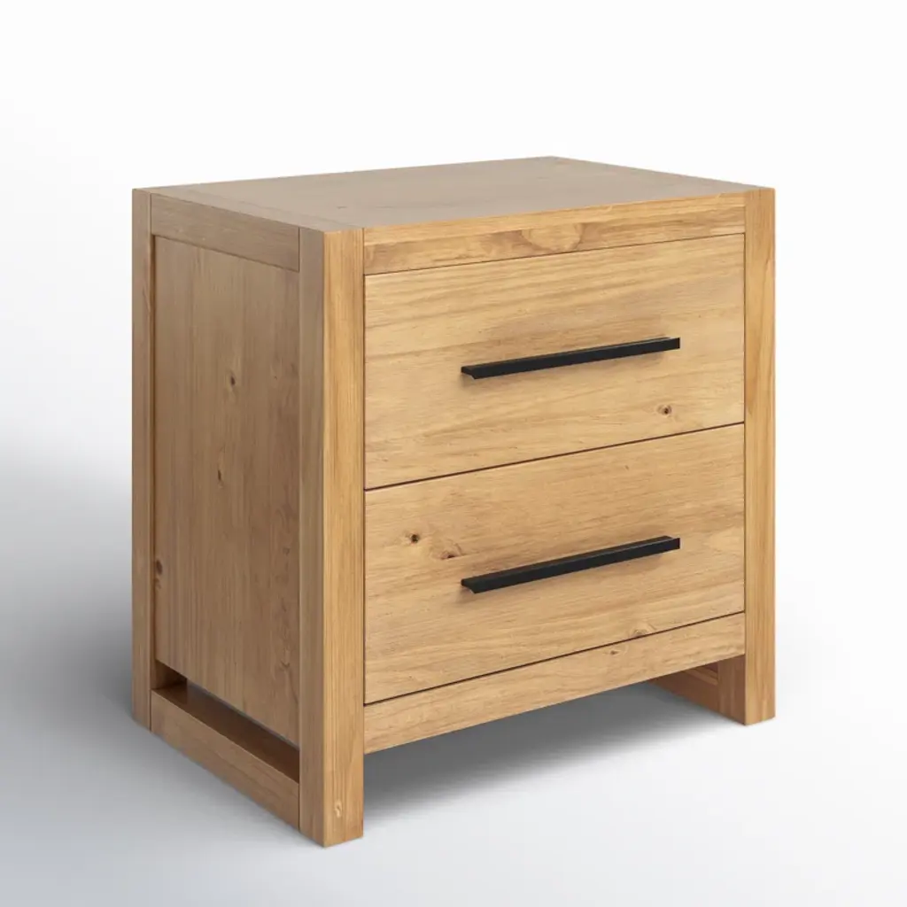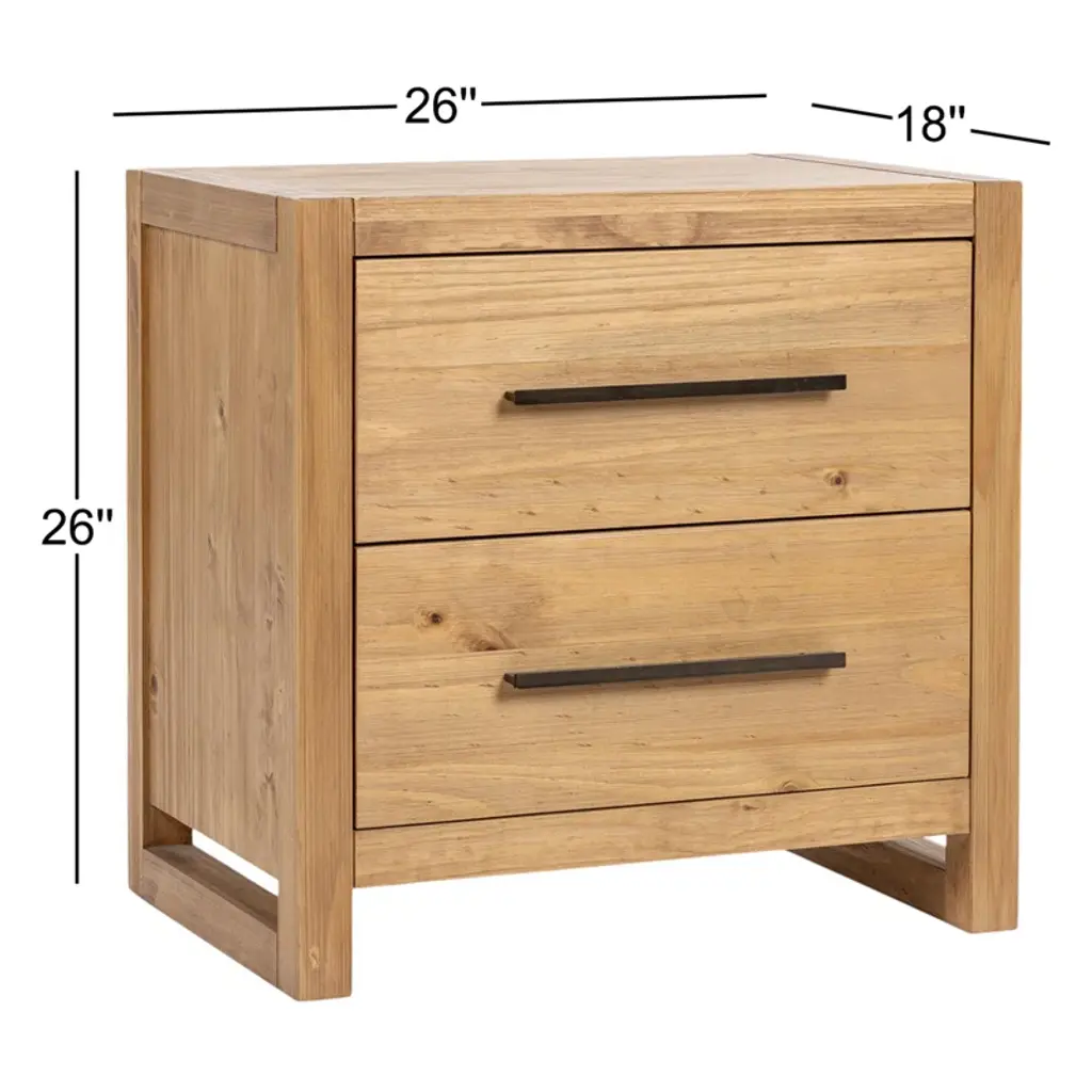 Complete your bedroom setup with this modern nightstand, designed with clean lines and a streamlined silhouette. Made from solid pine, it showcases the unique texture of natural wood grain and subtle knotting for added visual interest. Two spacious drawers open smoothly on ball-bearing glides and are finished with sleek black metal pulls. Thoughtful details like adjustable levelers and protective plastic feet make it a practical addition for everyday use.