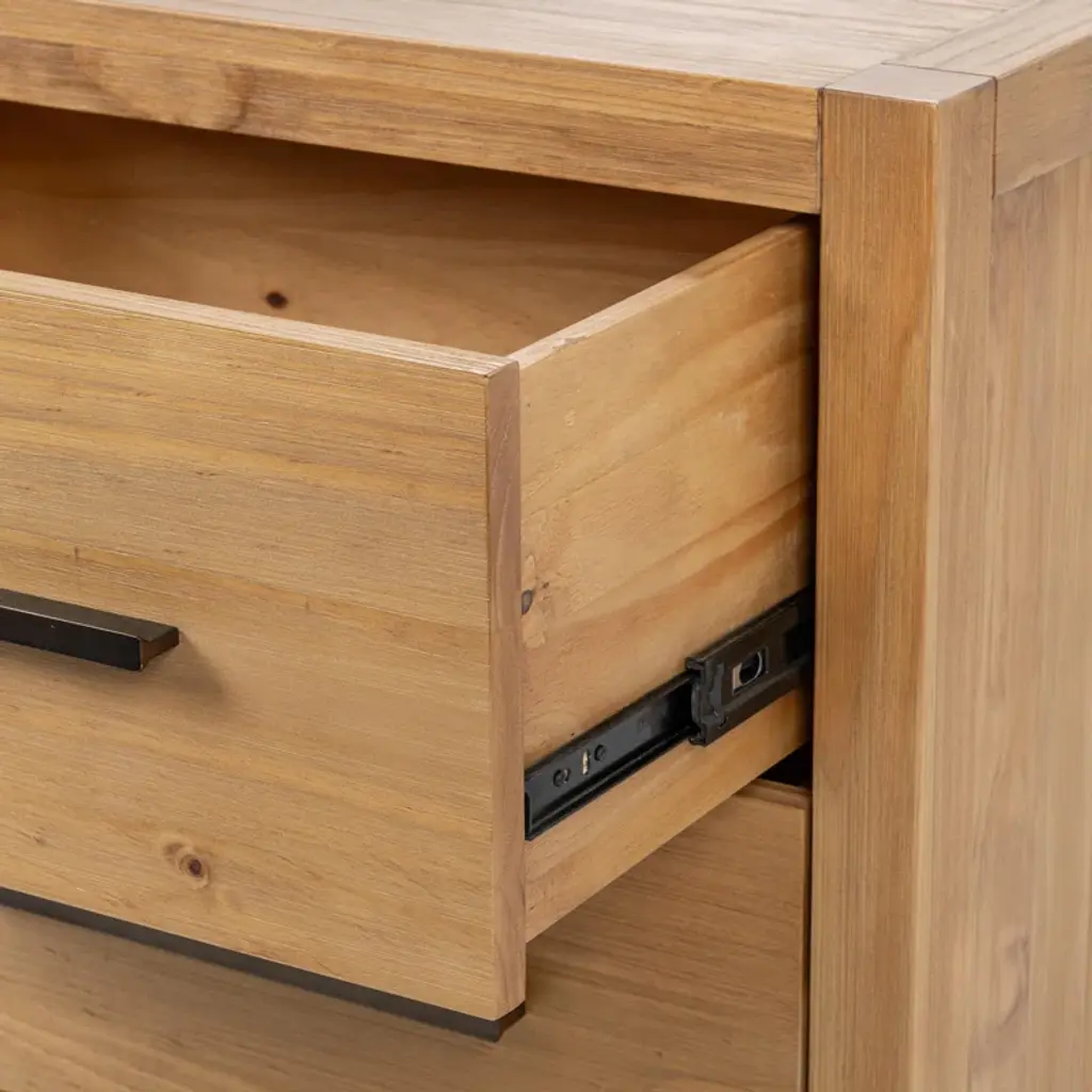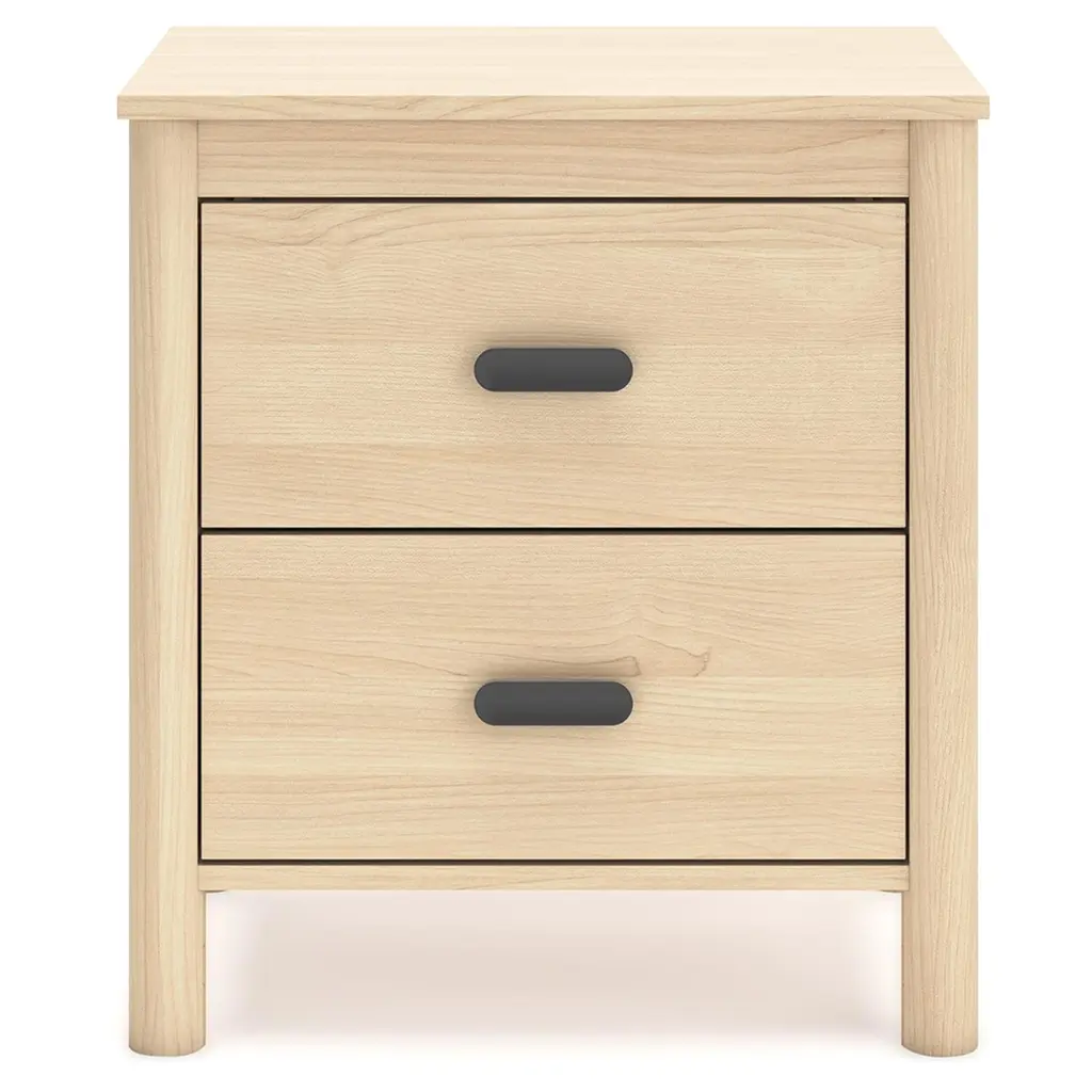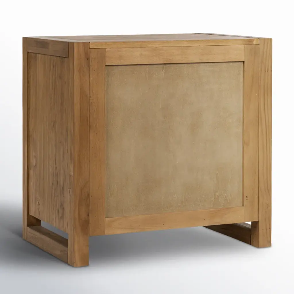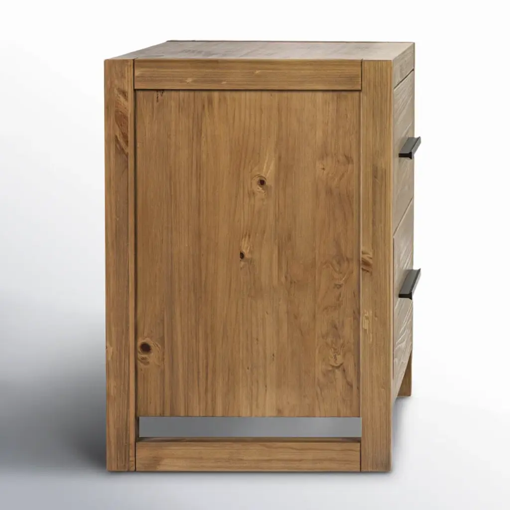 Complete your bedroom setup with this modern nightstand, designed with clean lines and a streamlined silhouette. Made from solid pine, it showcases the unique texture of natural wood grain and subtle knotting for added visual interest. Two spacious drawers open smoothly on ball-bearing glides and are finished with sleek black metal pulls. Thoughtful details like adjustable levelers and protective plastic feet make it a practical addition for everyday use.