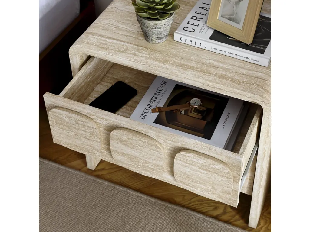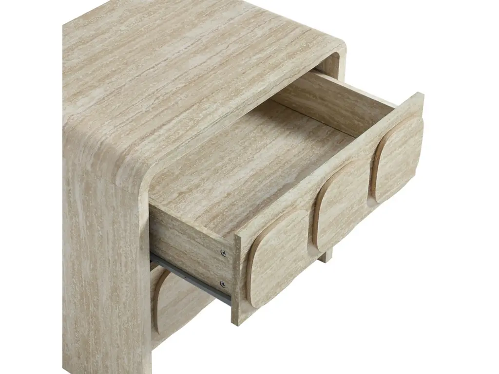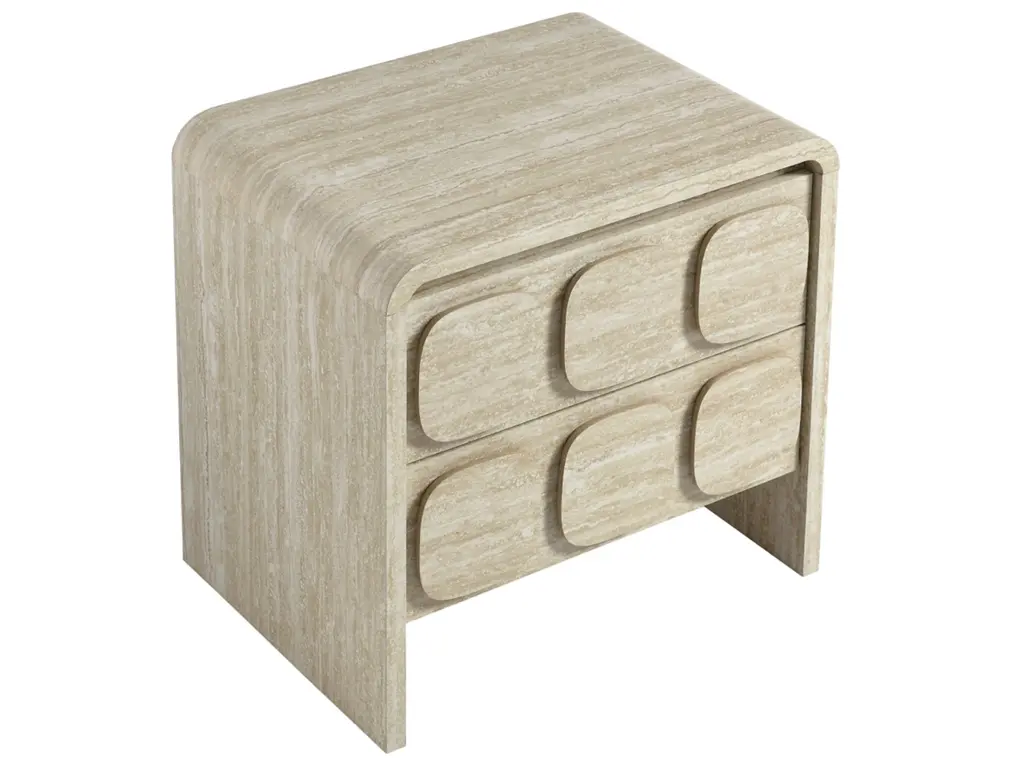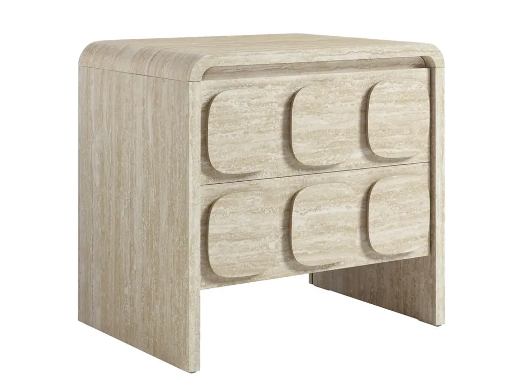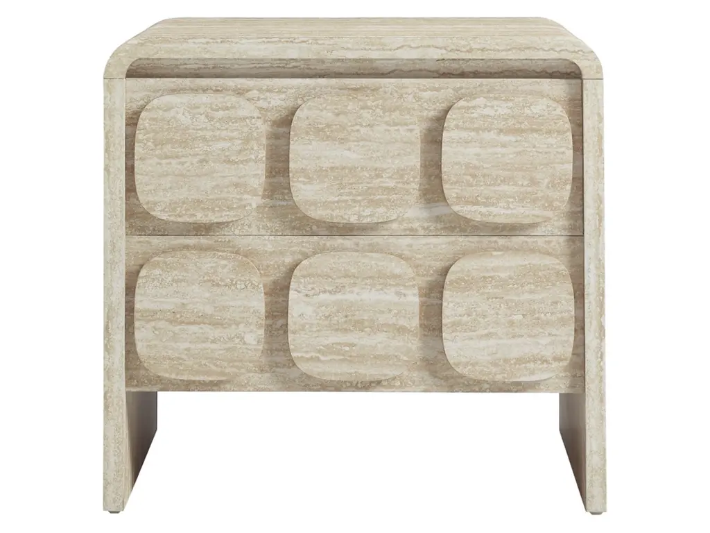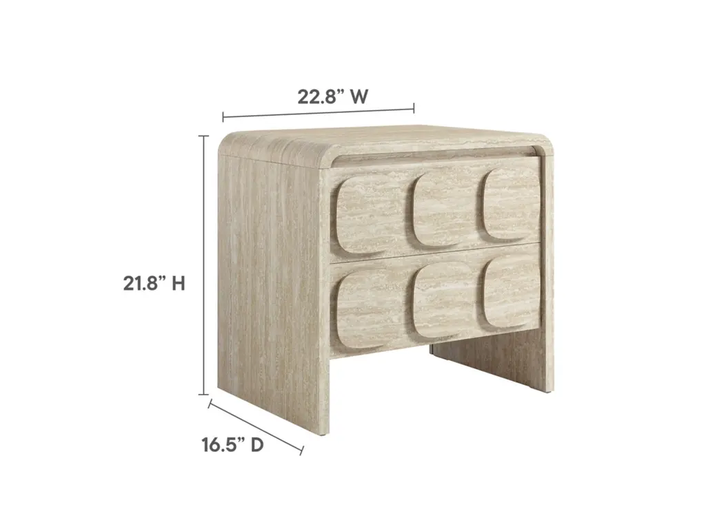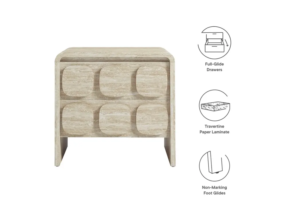 Elevate your living or sleeping space with the Toscana 2-Drawer Nightstand featuring rounded corners and a circular pattern motif across the face of the drawers. This elegant nightstand boasts a durable paper laminate for a sleek, contemporary look. Perfect for the bedroom, living room, or office, this modern nightstand combines style and functionality. The full-glide drawers offer smooth operation, providing ample storage space. Non-marking floor glides keep floors pristine. Whether you use it as a bedside table or an end table for the living room, its versatile design makes this accent table with storage an excellent choice for any setting. Transform your space with this side table with drawers that brings a touch of mid-century elegance to your home. Assembly required.