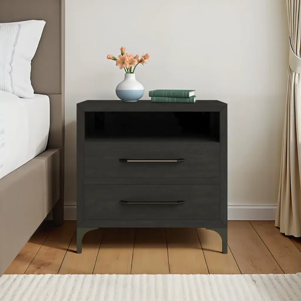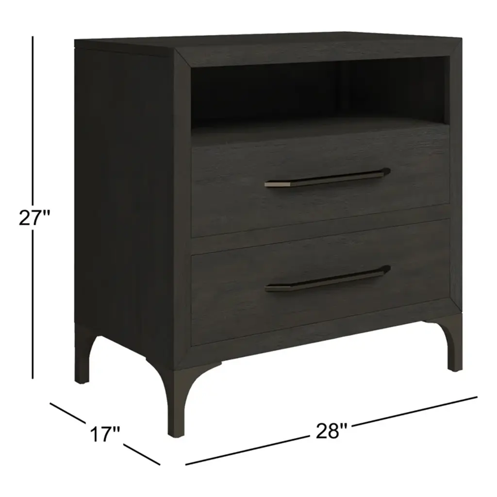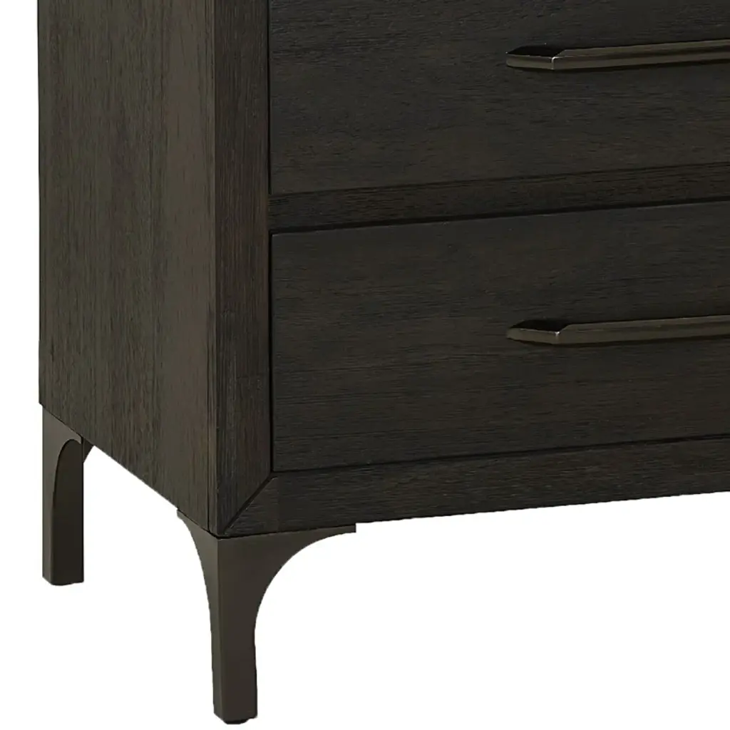 The Monica bedroom creates understated modern elegance with subtle details and premium finishes. Constructed from wire-brushed acacia wood, the rich vintage coffee finish is set off with thick angular drawer pulls and gently arched legs finished in polished gunmetal.