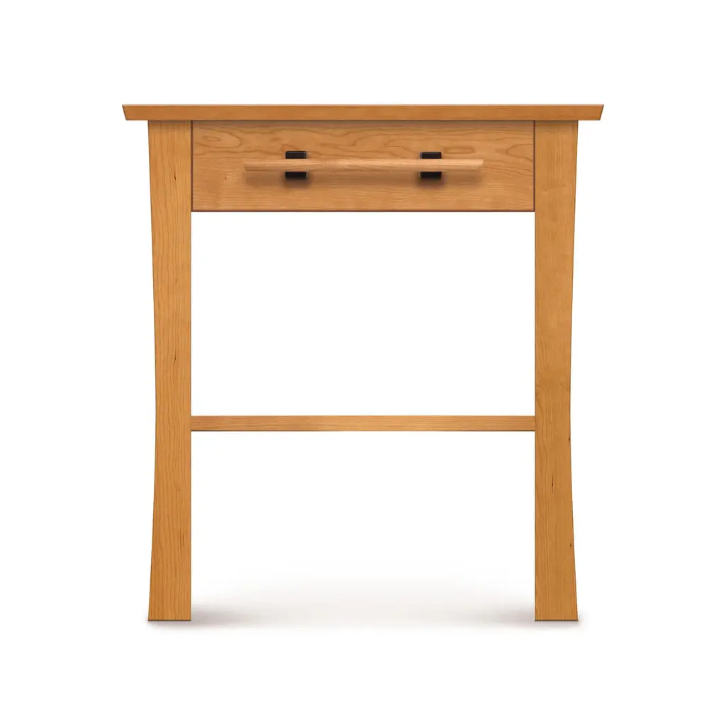 Copeland's luxury, solid wood, Monterey 1-Drawer Nightstand with Open Shelf fuses American Arts & Crafts style with modern Japanese and Asian design. Handmade with natural cherry wood, this nightstand can be customized online with your choice of natural cherry or cherry stain. Our luxury Monterey Furniture Collection is handmade in Vermont using eco-friendly, sustainably harvested cherry wood.Construction details include solid cherry wood frame and panel structural design, solid cherry wood top, 1/4" top-grade cherry veneer panels integrated into the case sides and back, fully finished drawer boxes with solid wood drawer fronts/sides/backs, easy-grip, wide cherry and walnut drawer pulls, asymmetrical English dovetails and adjustable two glide wooden spring-loaded drawer slides for sturdy, smooth operation.Base price represents natural cherryShown in natural cherryMatching furniture available in our Monterey Furniture CollectionNatural variations in solid wood and hand applied finishes make each piece unique. Slight grain and finish irregularities tell you that the furniture has been crafted from solid wood and are considered hallmarks of quality.